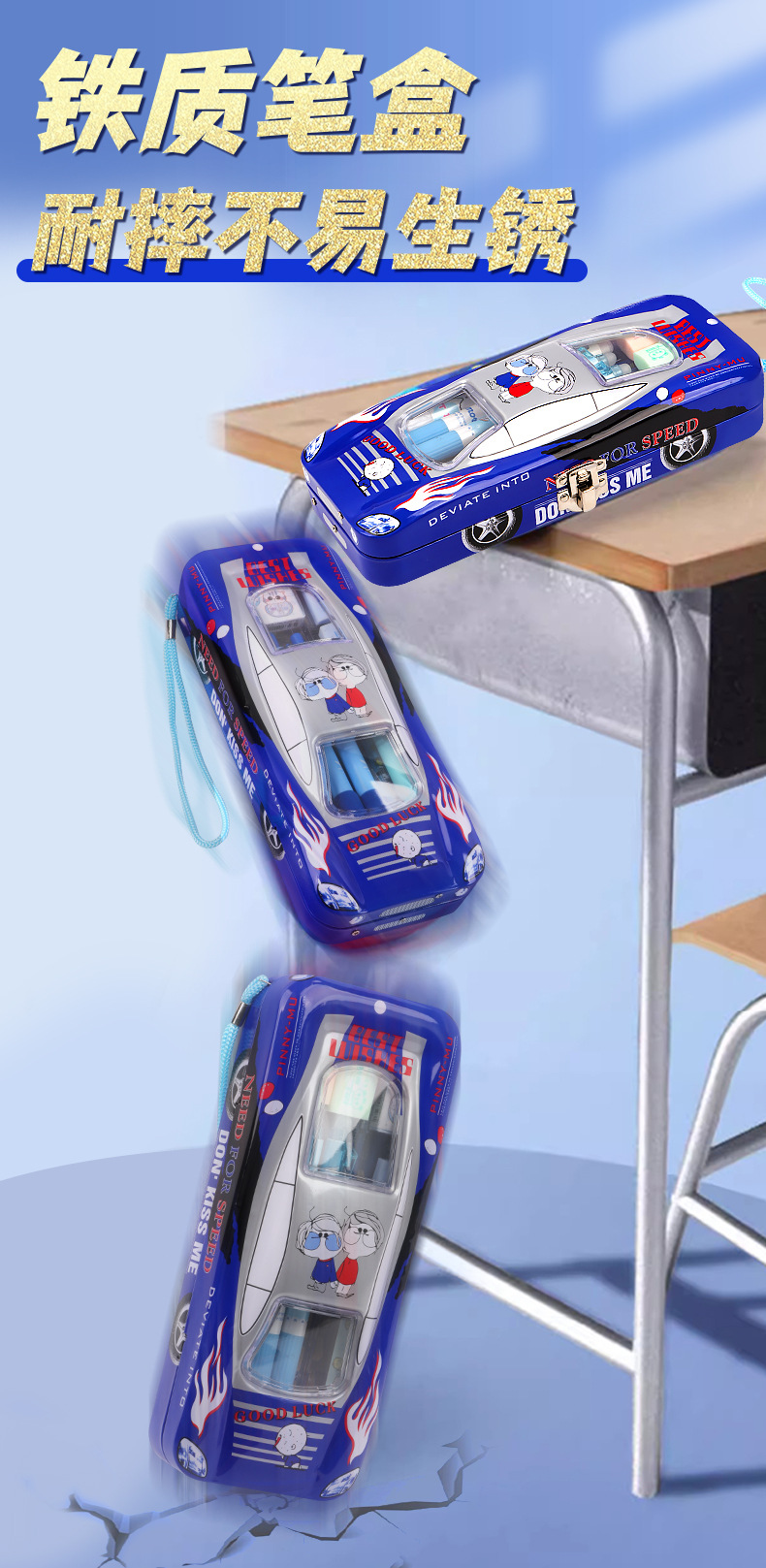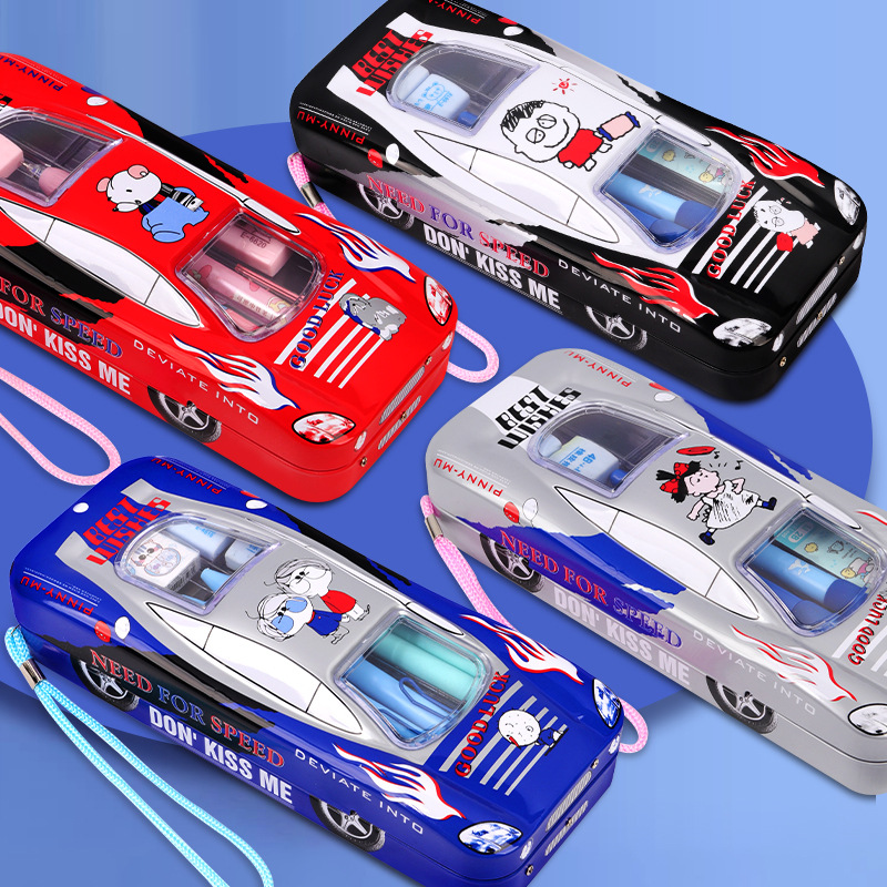 초등학생 어린이와 소년을위한 잠금 문구 상자가있는 다기능 자동차 모양의 철 대용량 기계 멋진 펜 상자