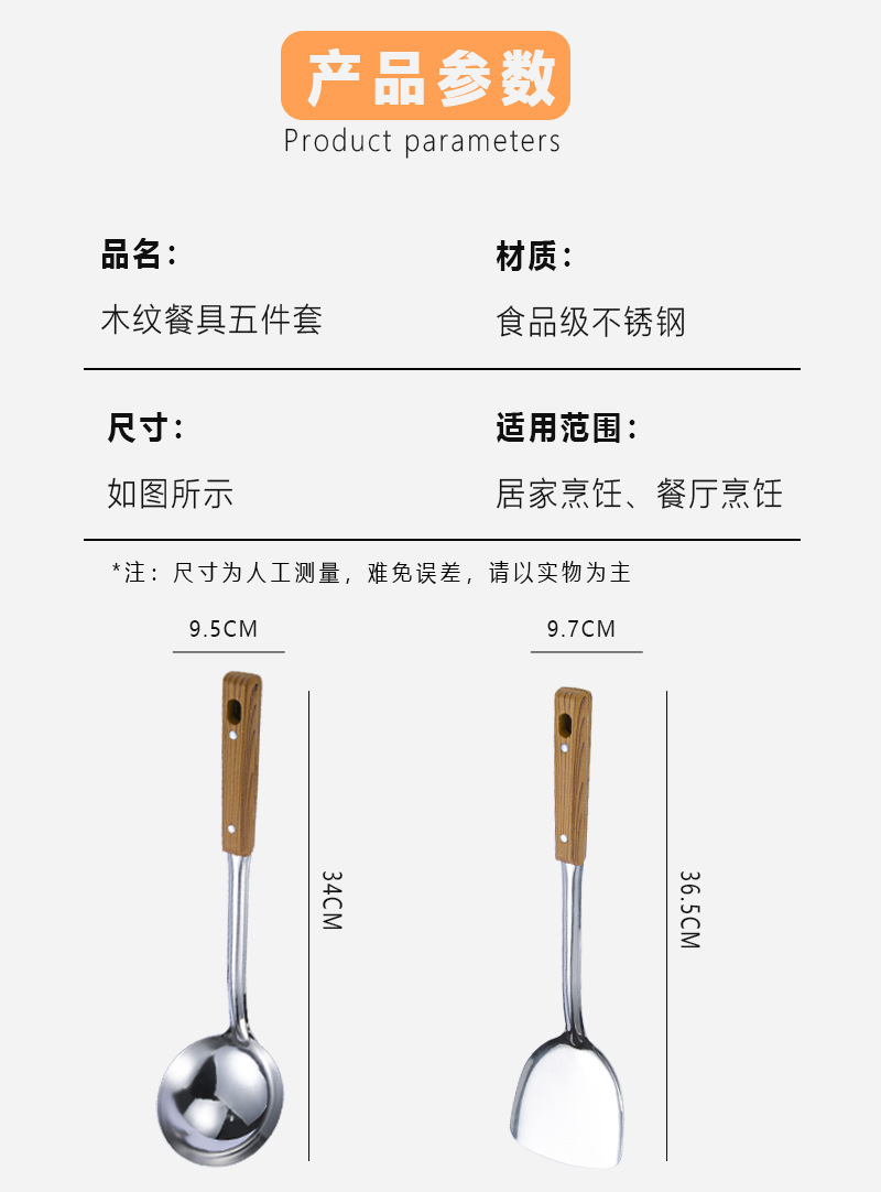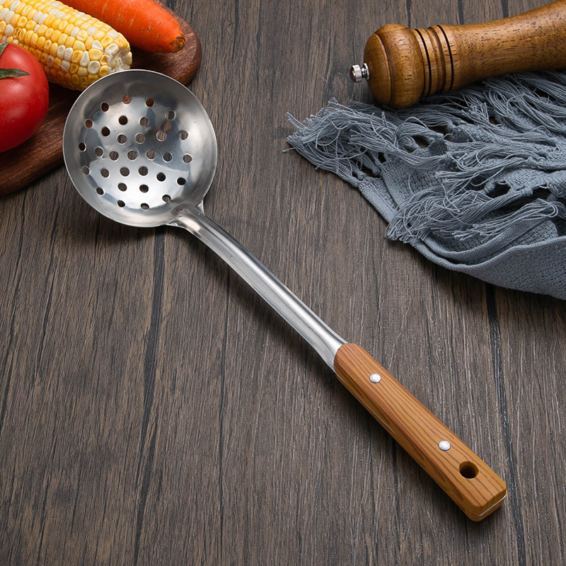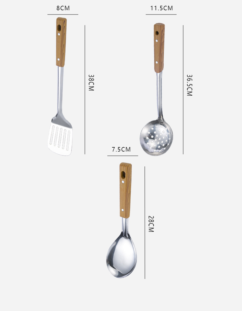 스테인레스 스틸 주방 용품 세트 모조 나뭇결 손잡이 주걱 수프 숟가락 튀김 삽 소쿠리 요리 도구 풀 세트 튀김 삽 도매스토어 가기