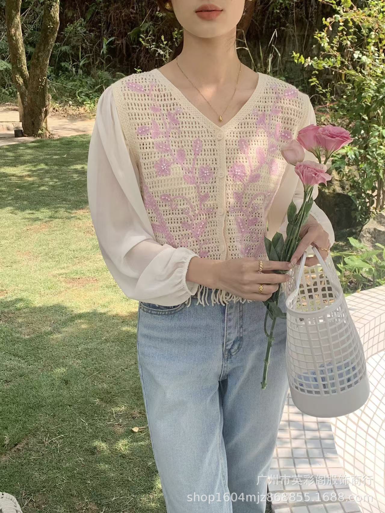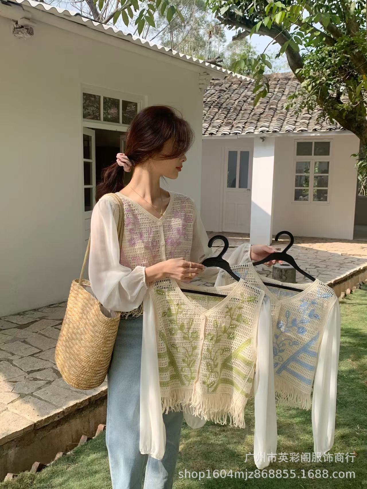 여성용 한국식 레트로 니치 디자인 술 할로우 아웃 쉬폰 셔츠 스프링 아우터웨어 슬림핏 슬림 핏 쇼트 탑스토어 가기