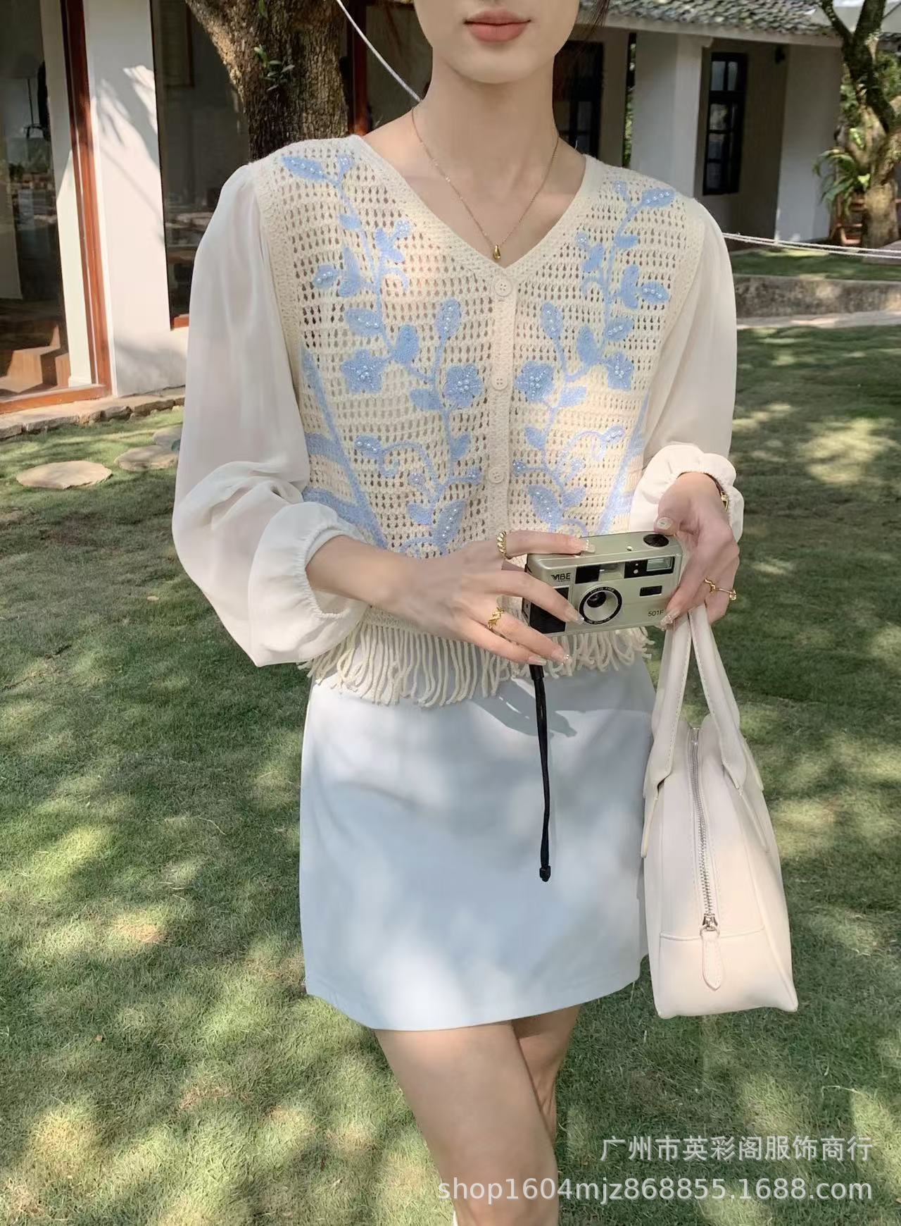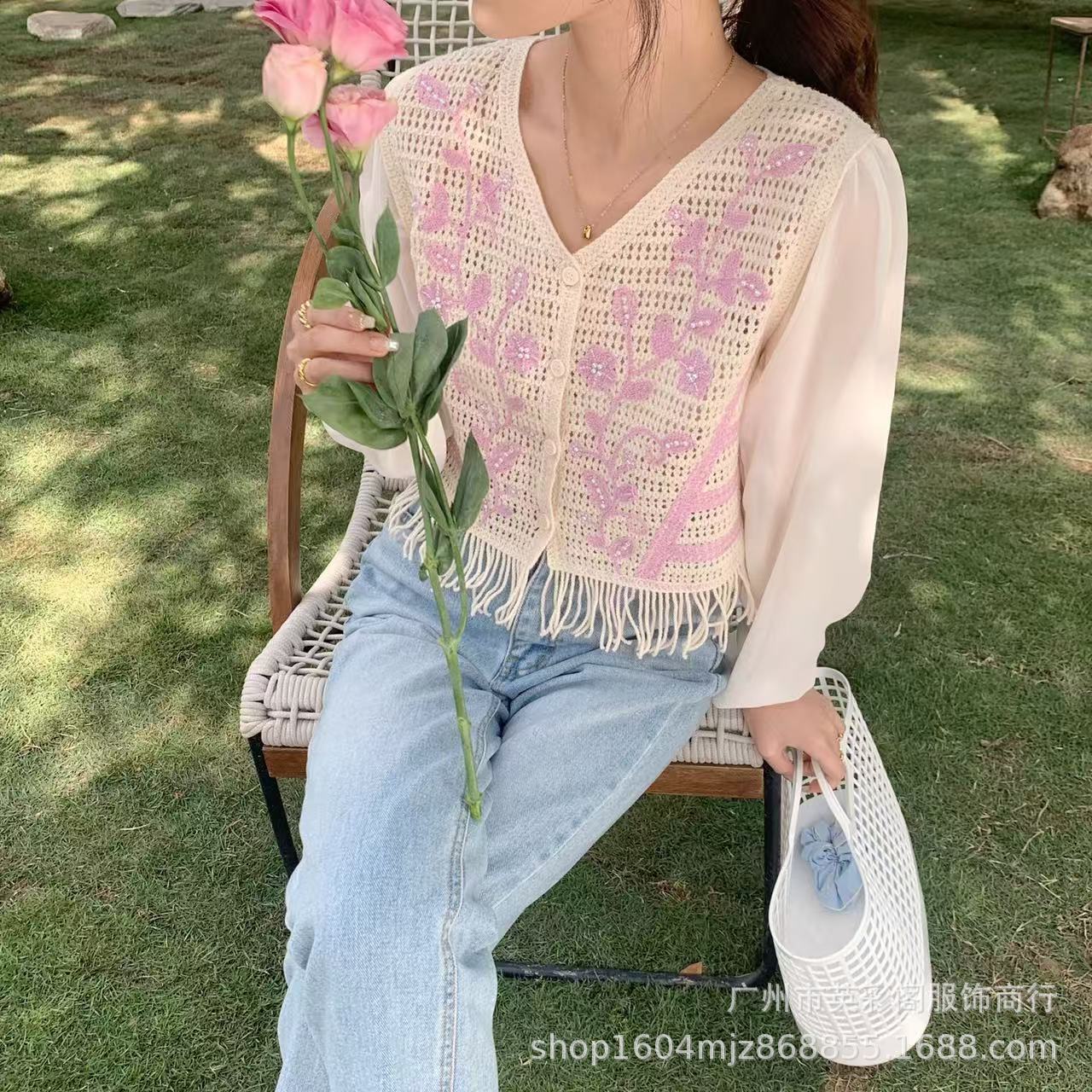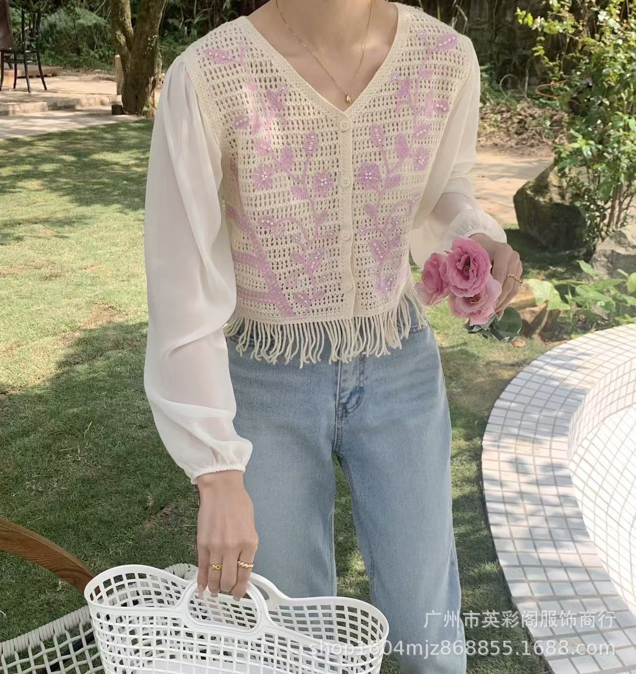 여성용 한국식 레트로 니치 디자인 술 할로우 아웃 쉬폰 셔츠 스프링 아우터웨어 슬림핏 슬림 핏 쇼트 탑