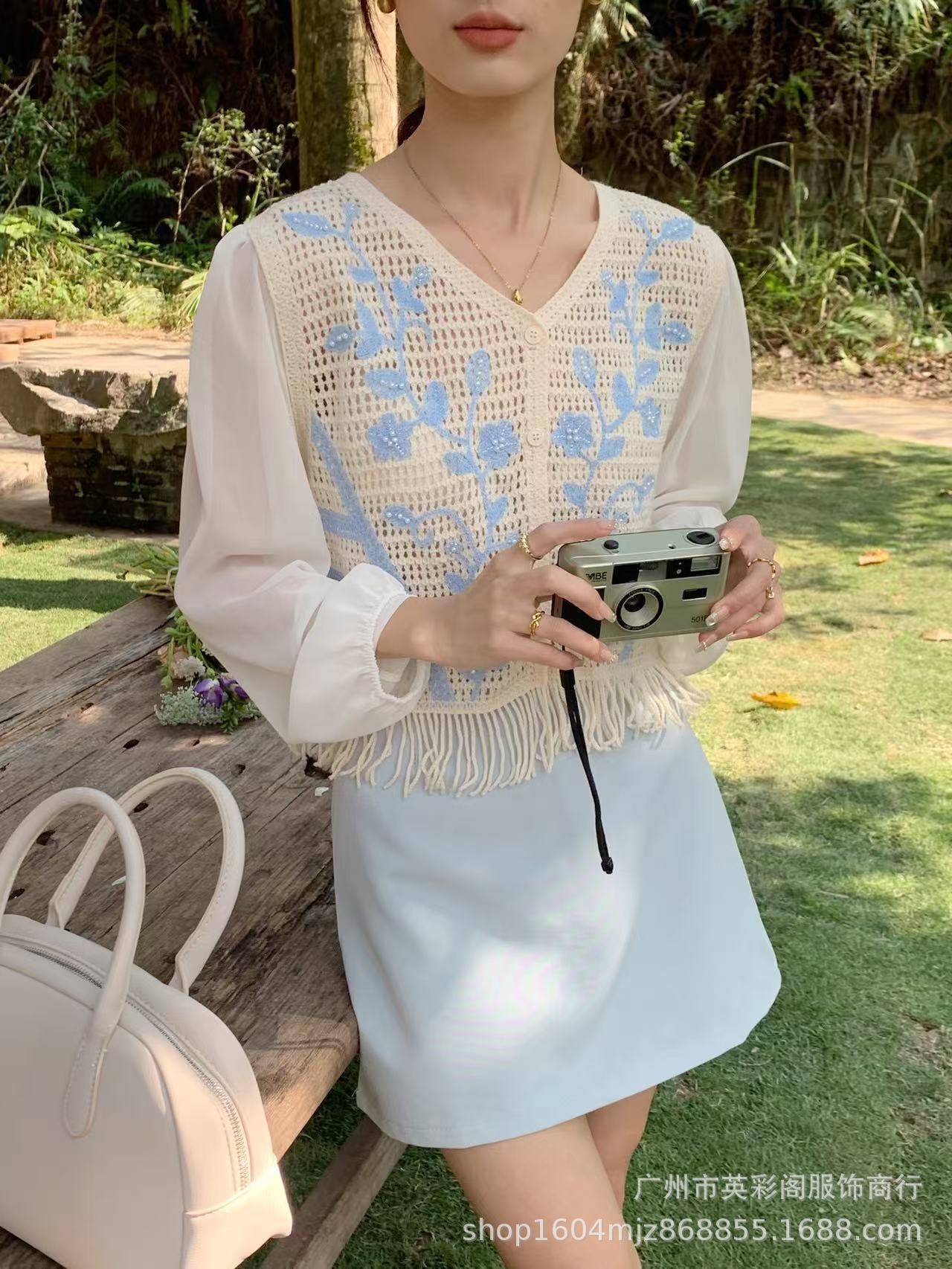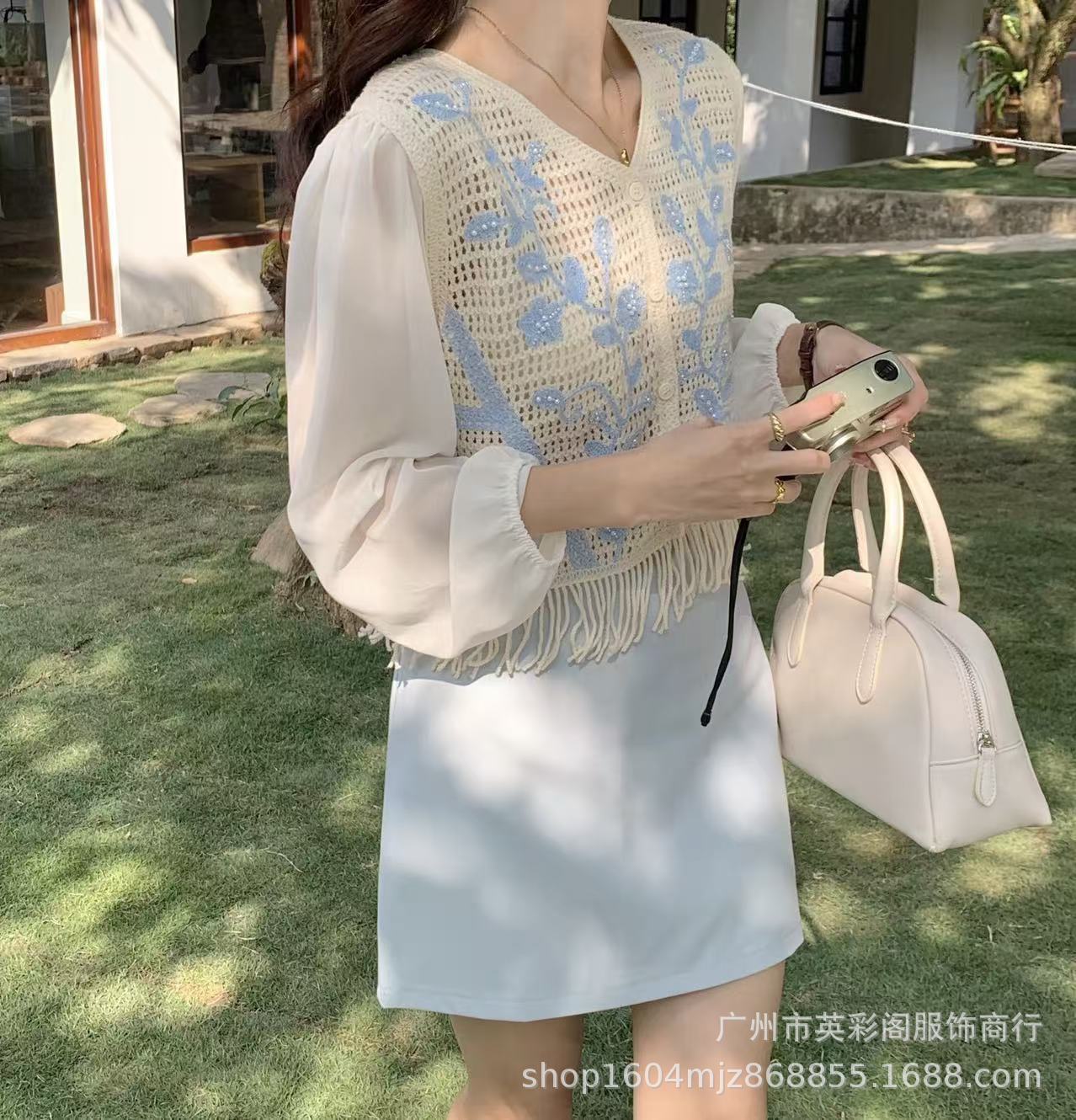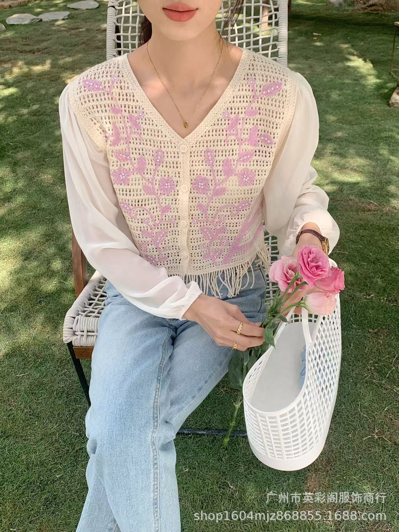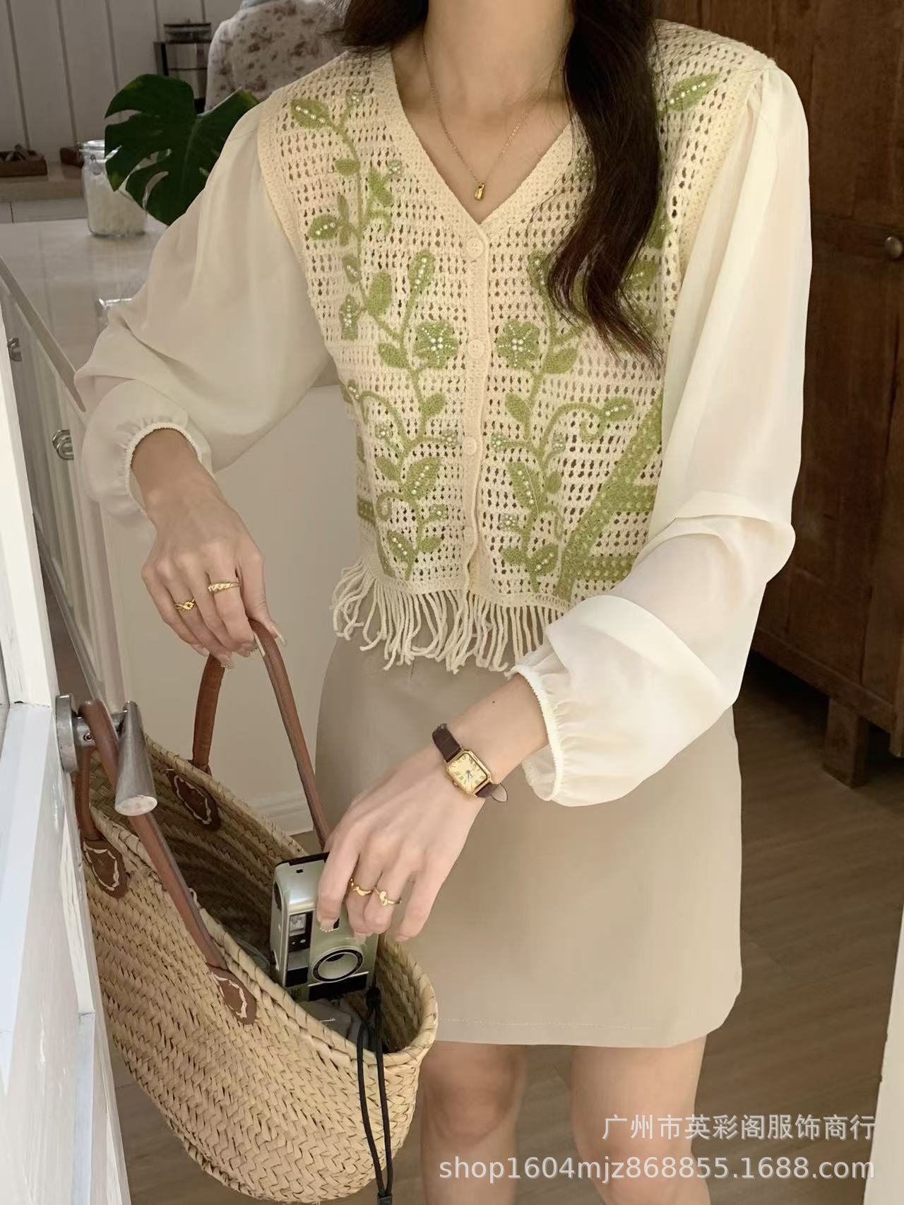 여성용 한국식 레트로 니치 디자인 술 할로우 아웃 쉬폰 셔츠 스프링 아우터웨어 슬림핏 슬림 핏 쇼트 탑