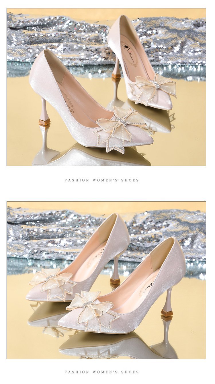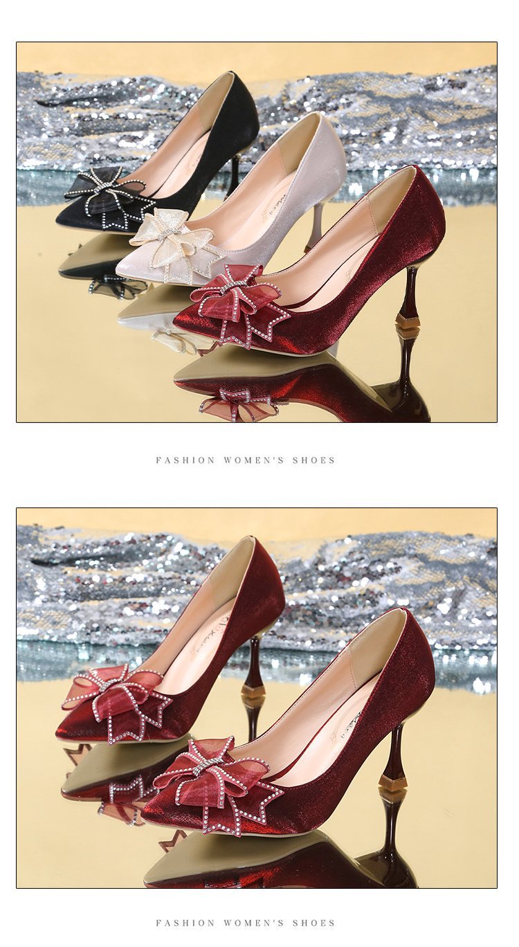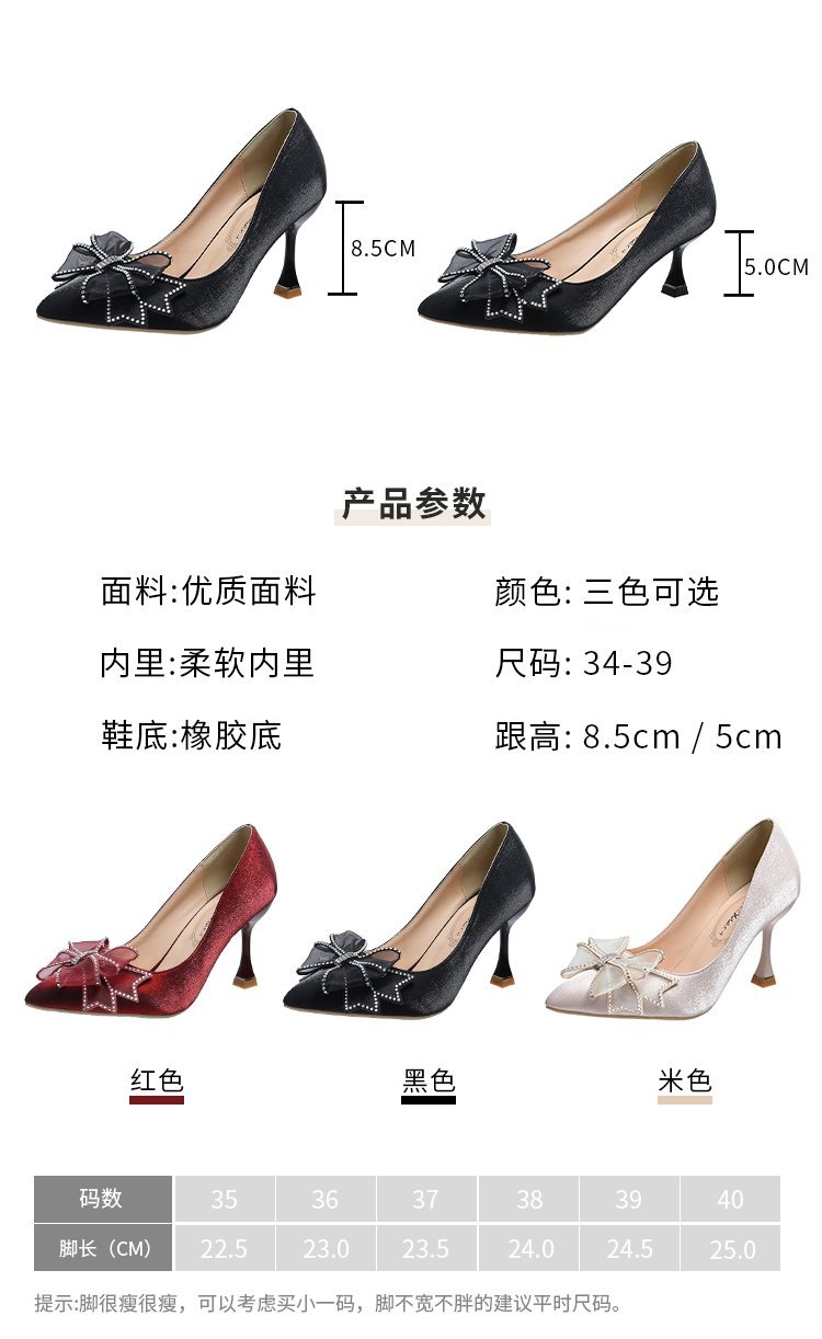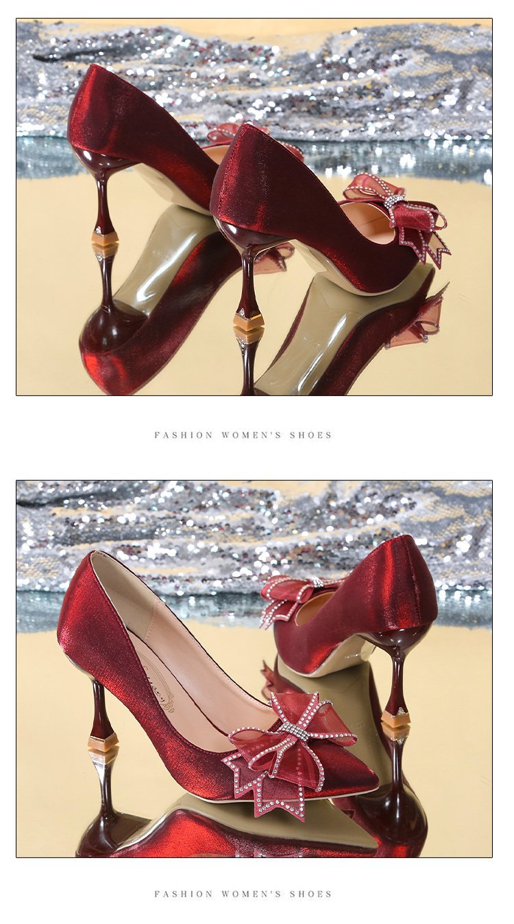 2026 봄 신상 얇은 굽의 싱글 슈즈, 리본 장식의 뾰족한 앞코와 얕은 입구의 하이힐, 새틴 레드 신부 여성화 도매스토어 가기