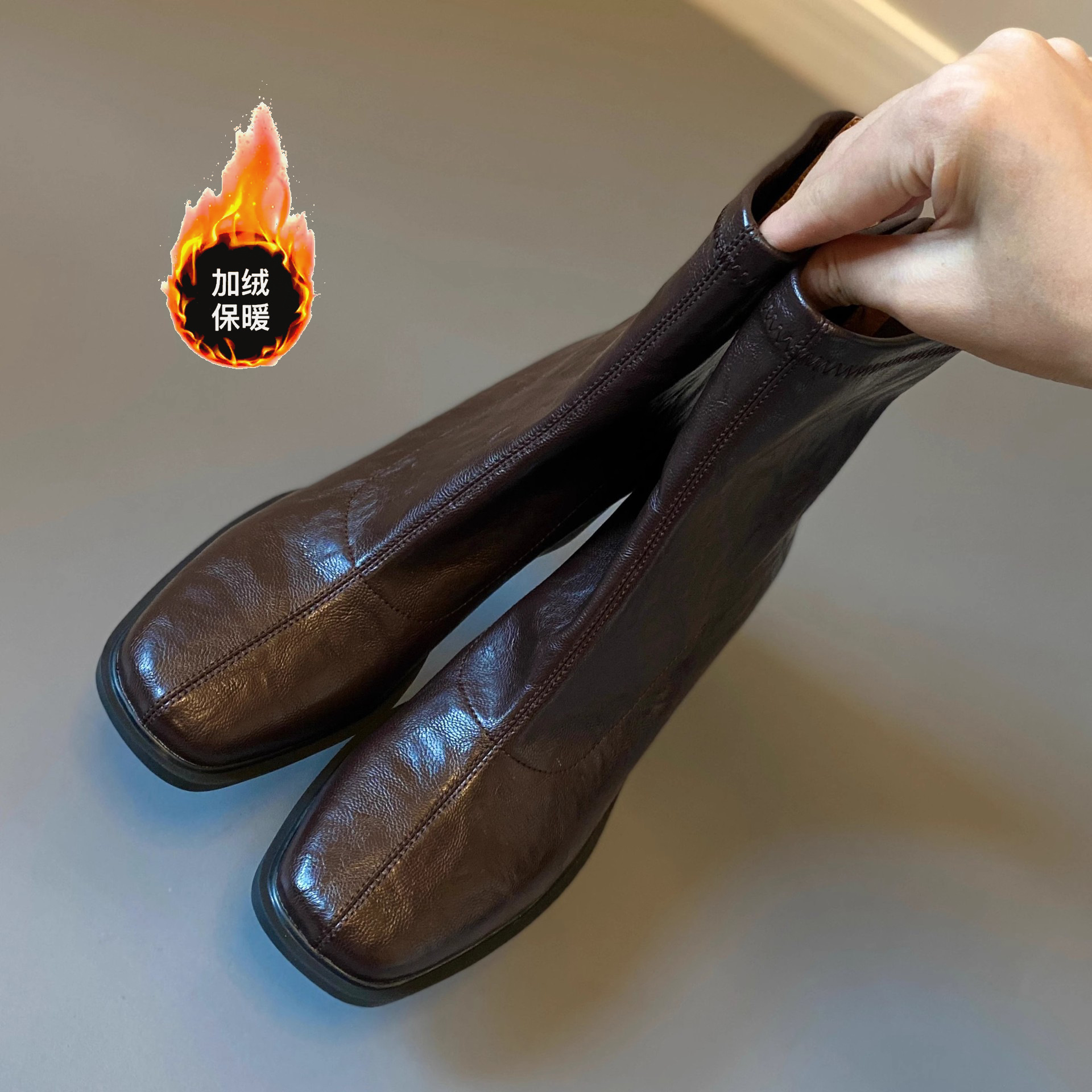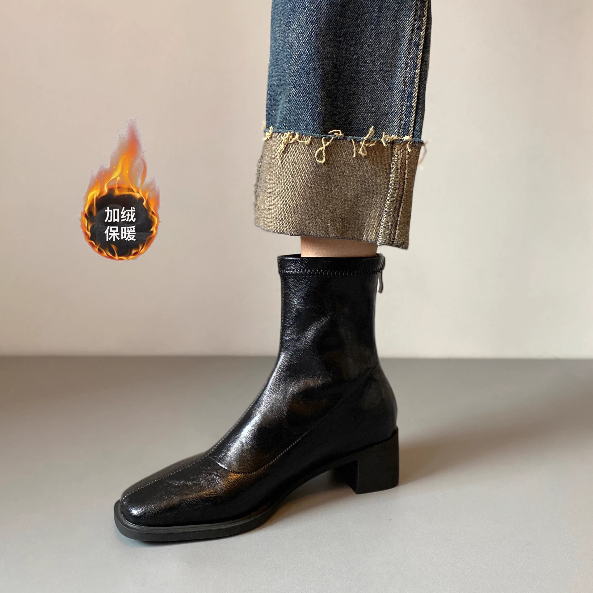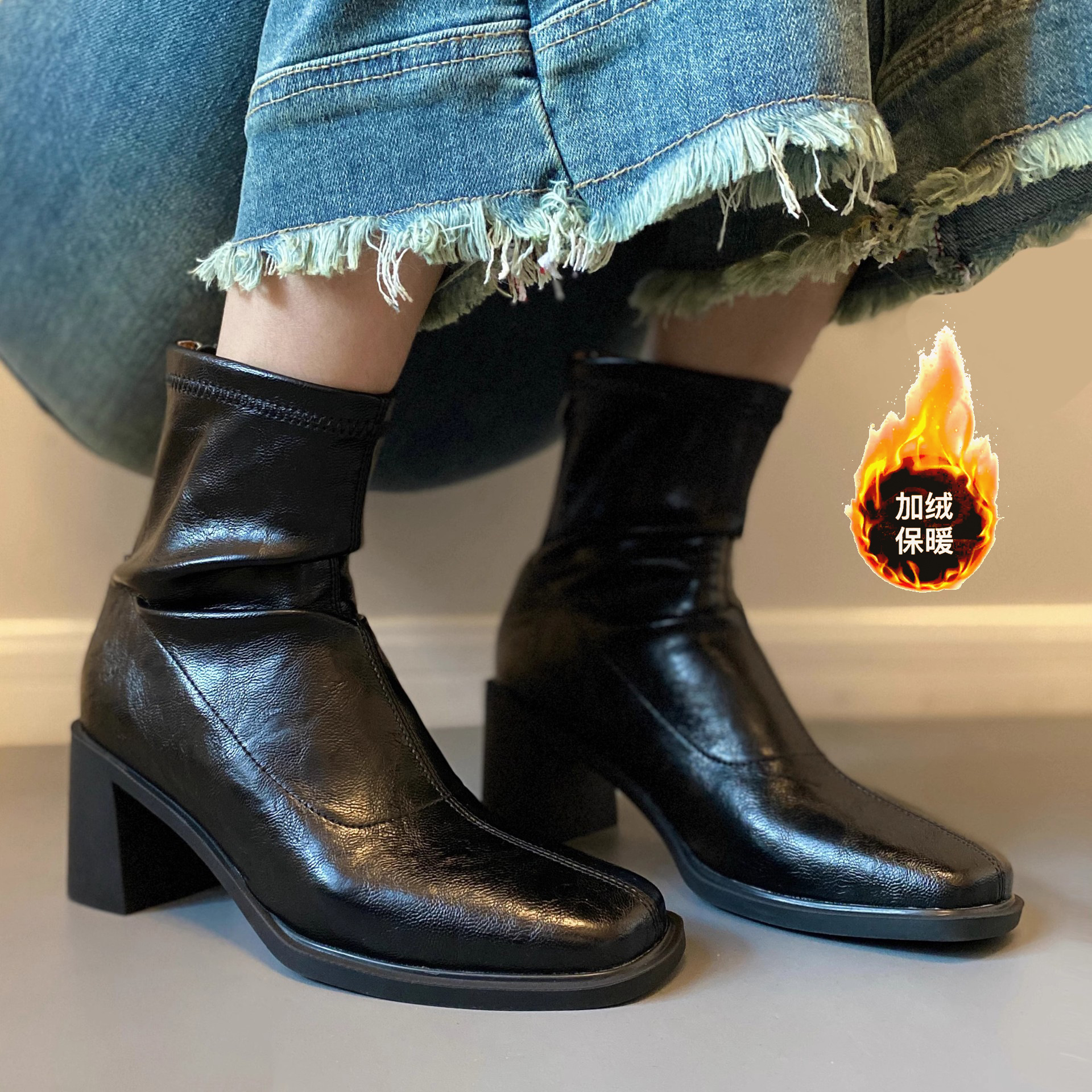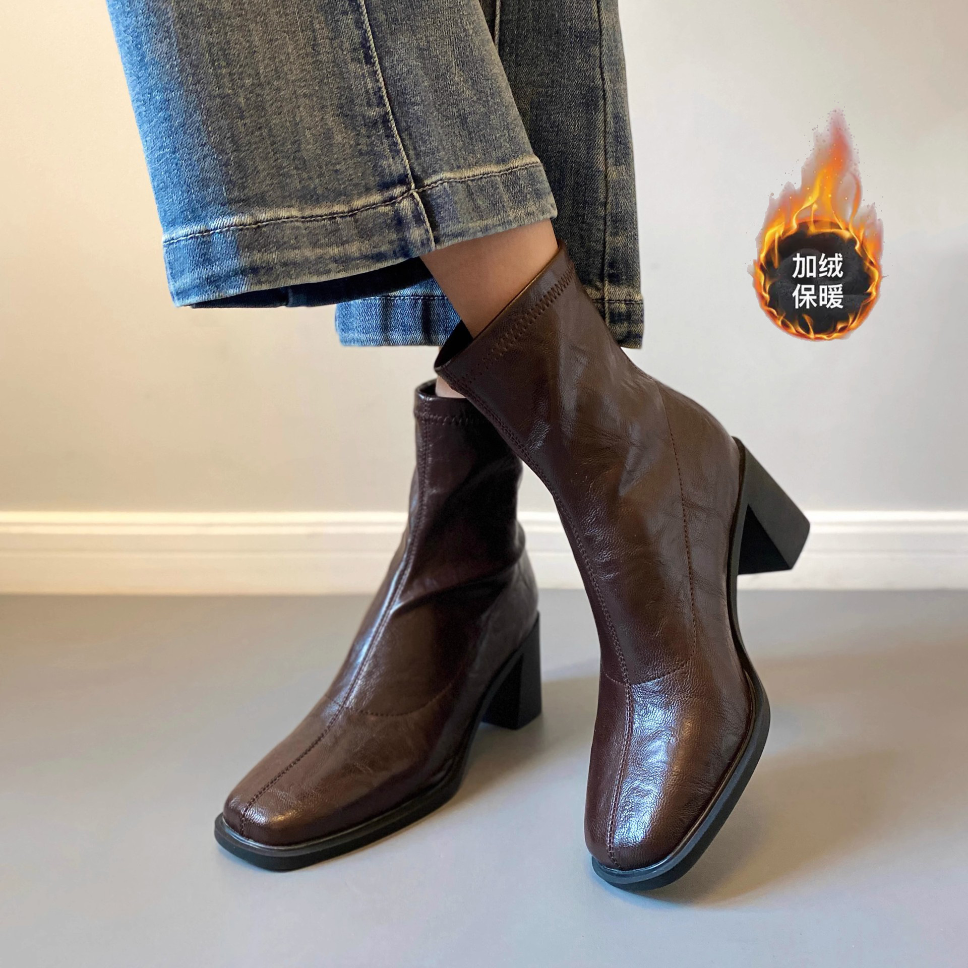 양가죽 버전의 진짜 가죽 한국 스타일 하이힐 무소음 스퀘어토 슬림 부츠 숏부츠 두꺼운 굽 레트로 플러스 벨벳 마틴 부츠 여성용 가을 겨울
