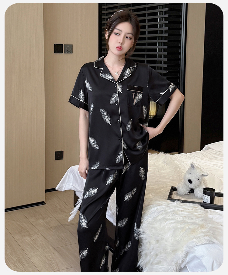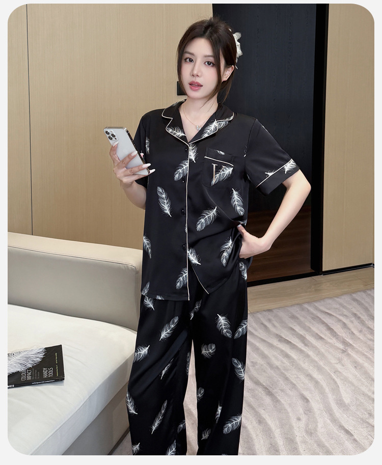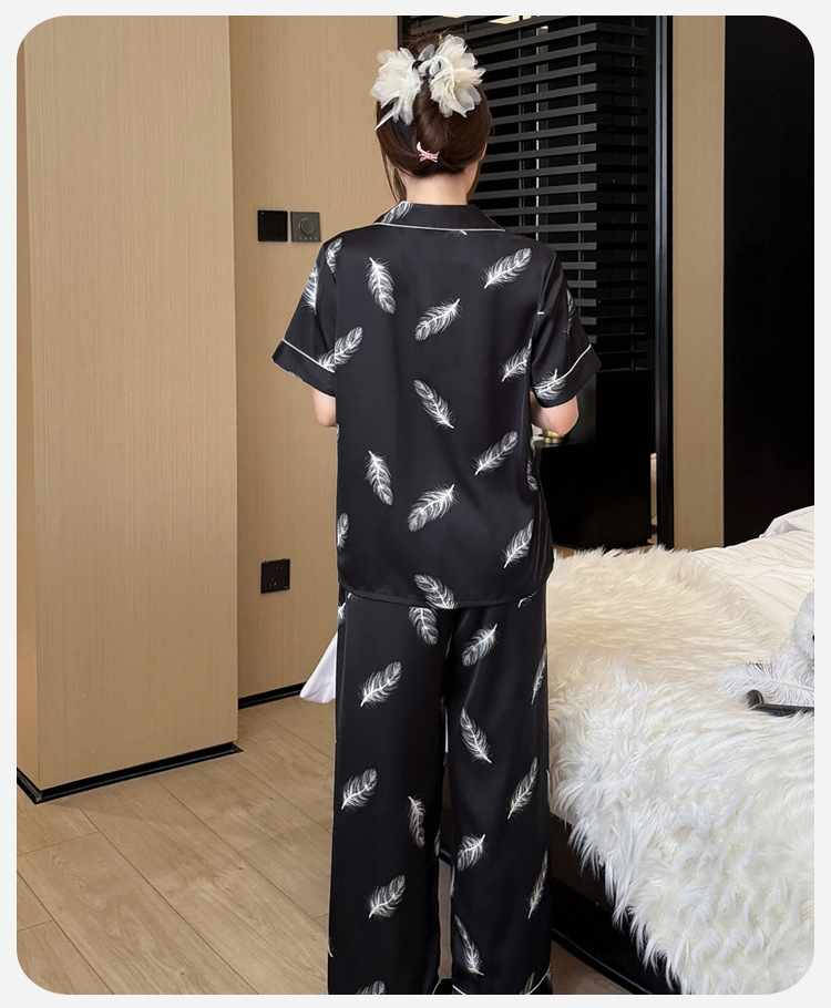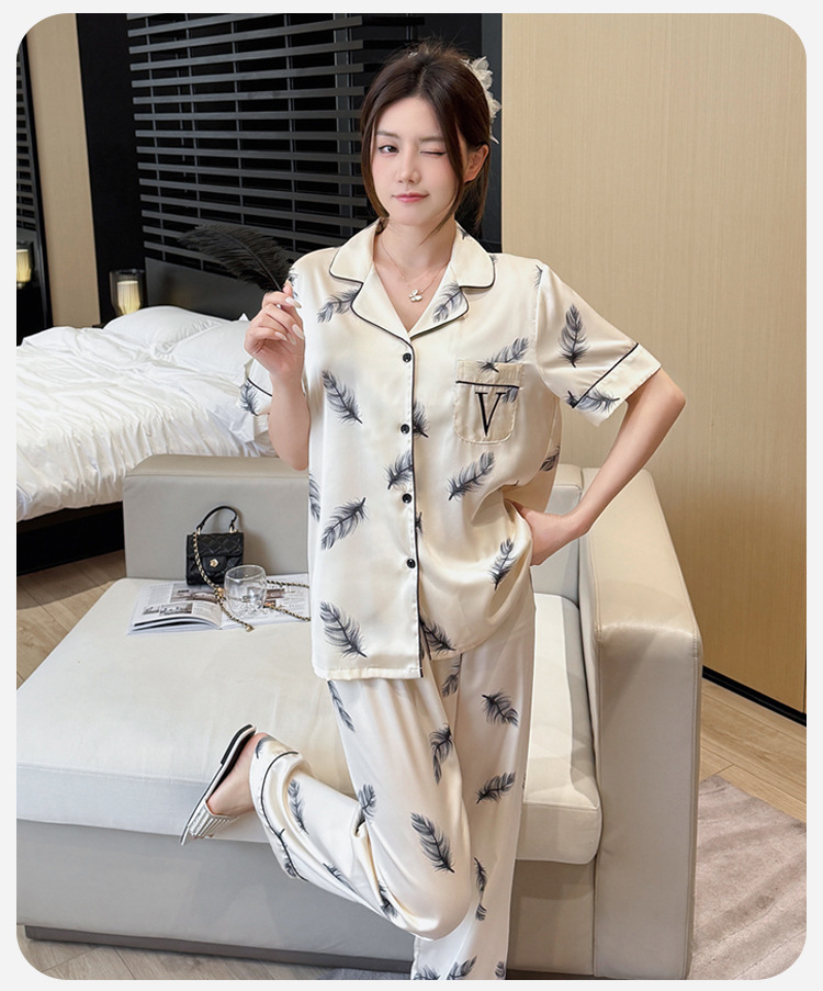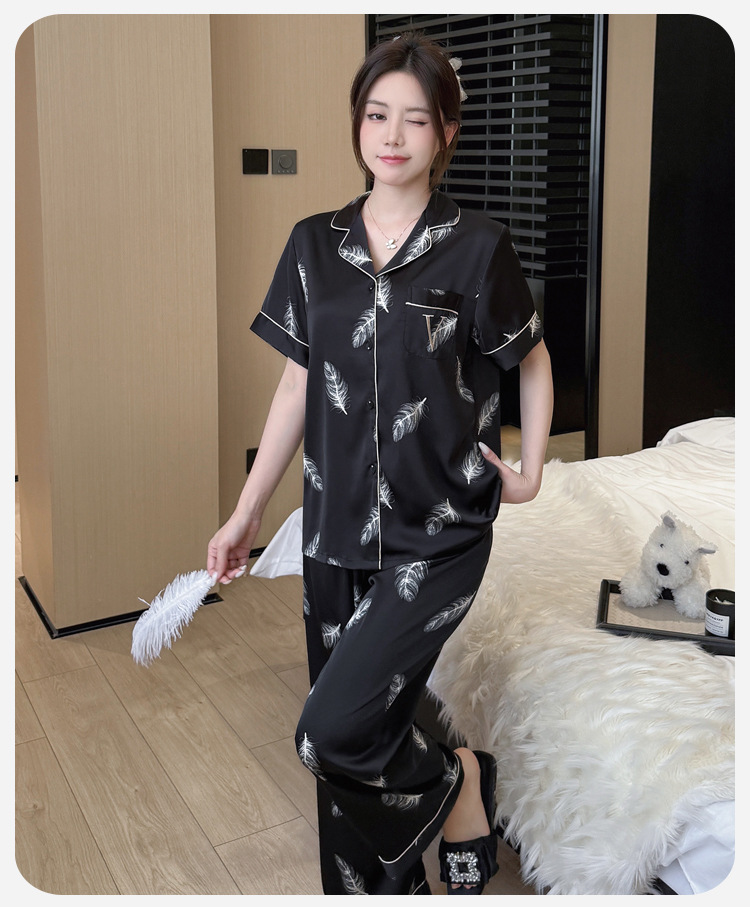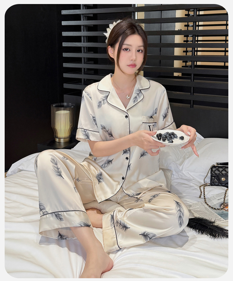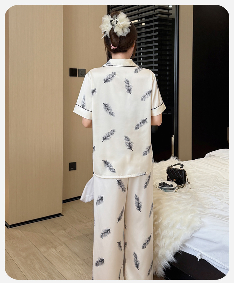 여름 신제품 여성 깃털 얼음 실크 얇은 잠옷 반팔 바지 정장 실크 홈웨어 Пижама스토어 가기