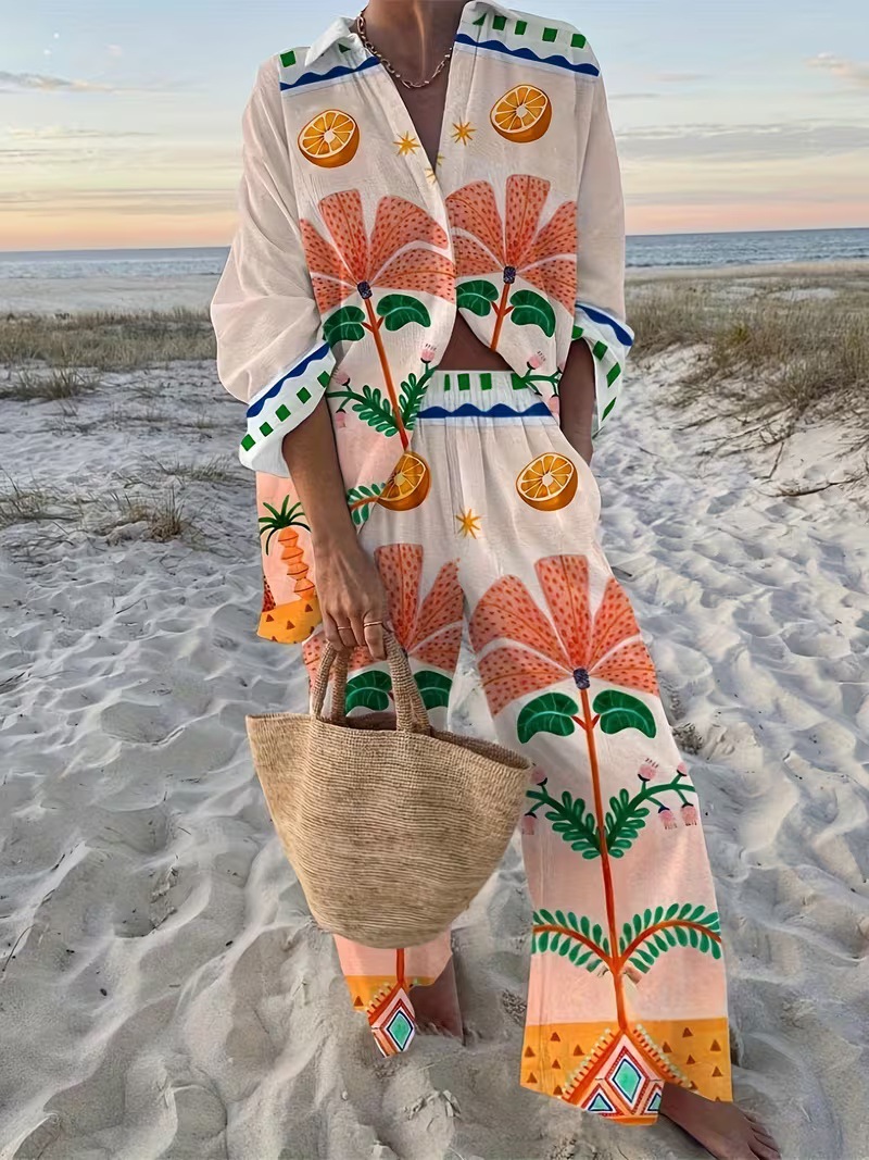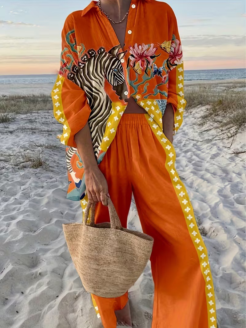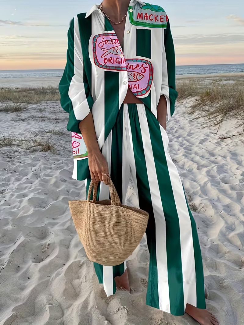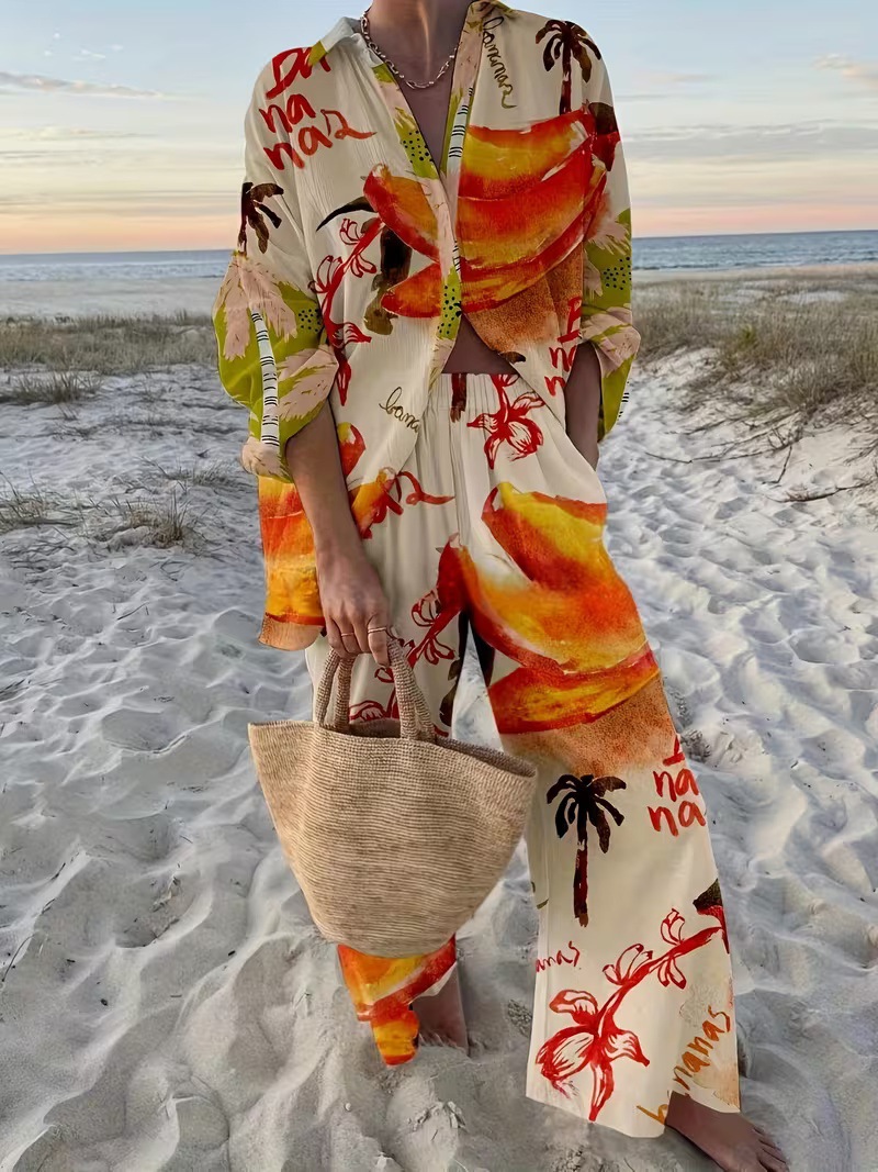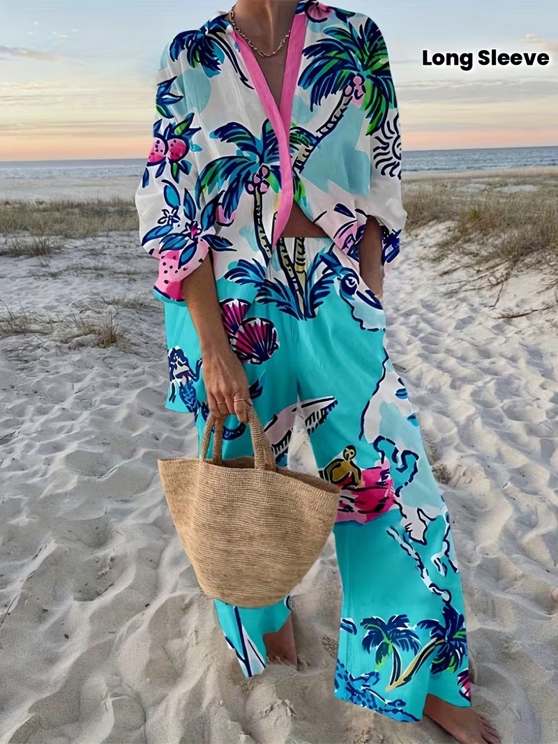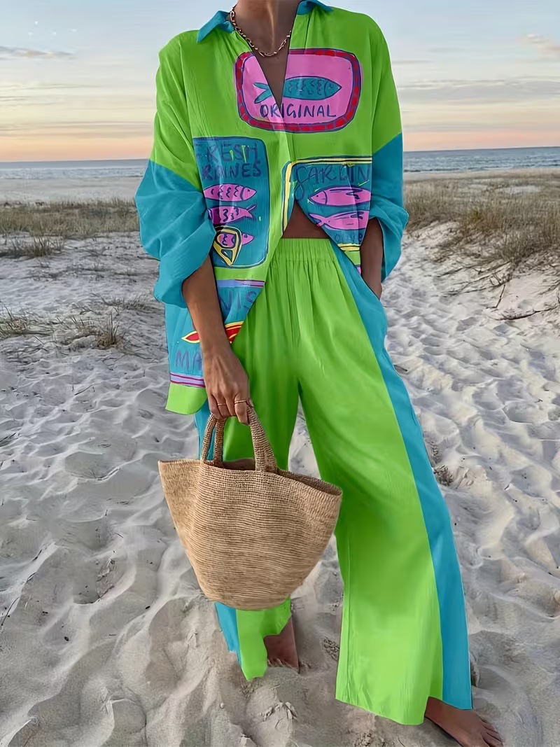 유럽과 미국의 새로운 창조적 인 물고기 패턴 레저 세트 느슨한 스포츠 넓은 다리 바지 해양 요소 레저 세트 POD