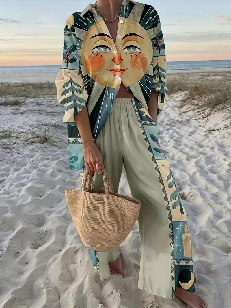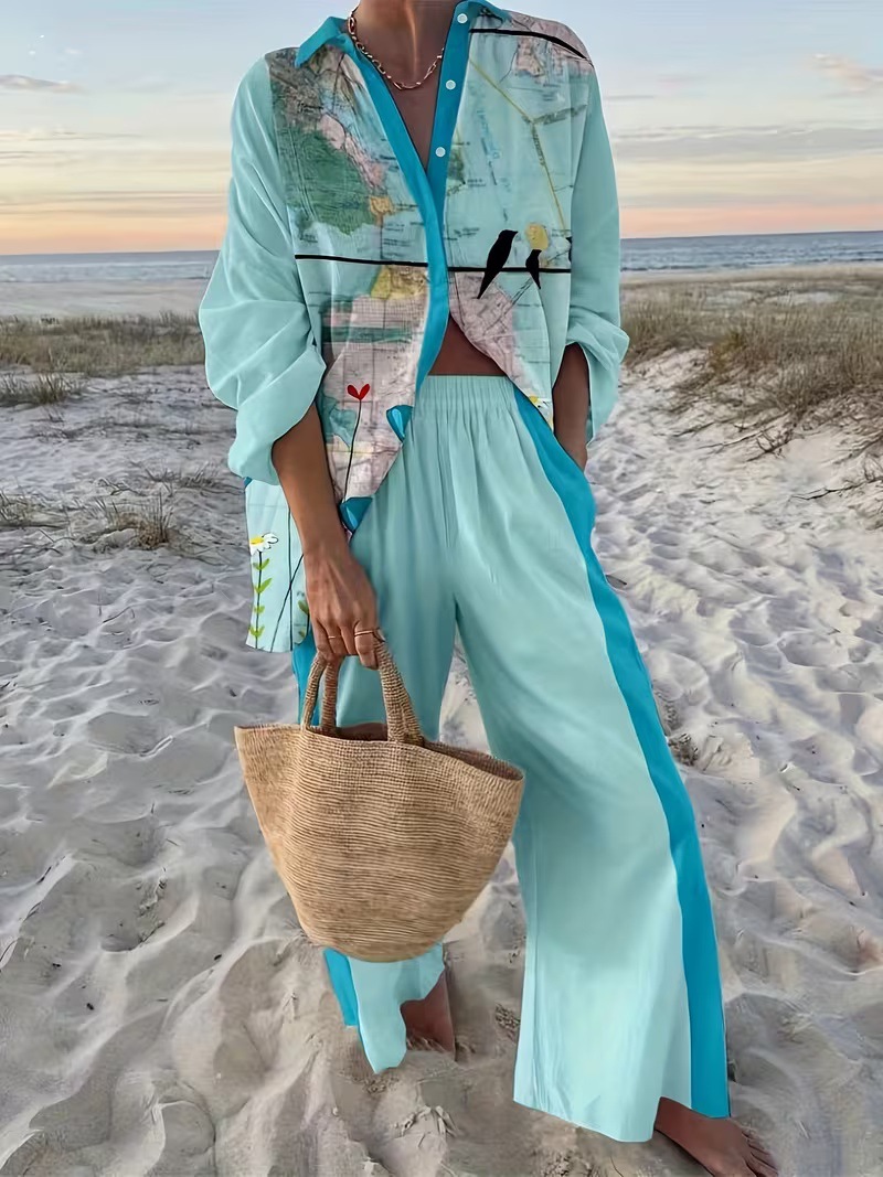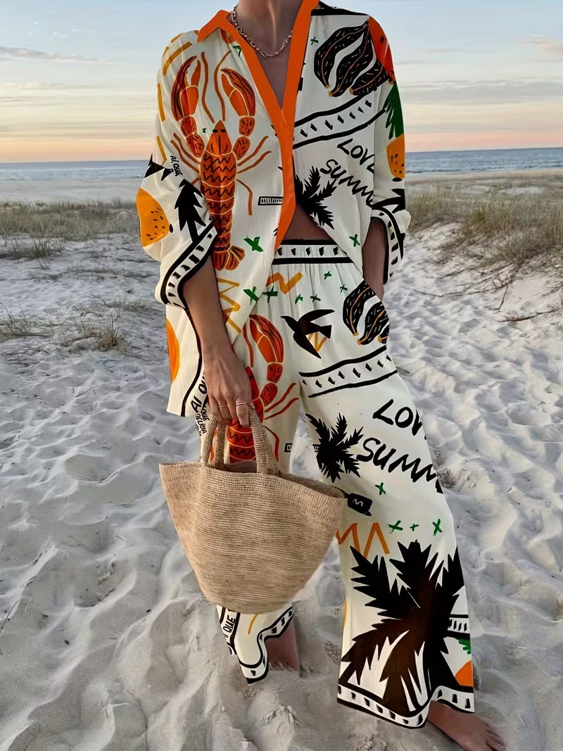 유럽과 미국의 새로운 창조적 인 물고기 패턴 레저 세트 느슨한 스포츠 넓은 다리 바지 해양 요소 레저 세트 POD스토어 가기