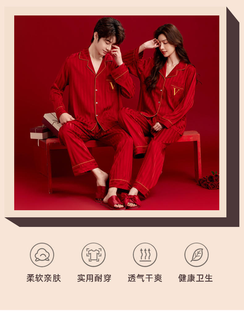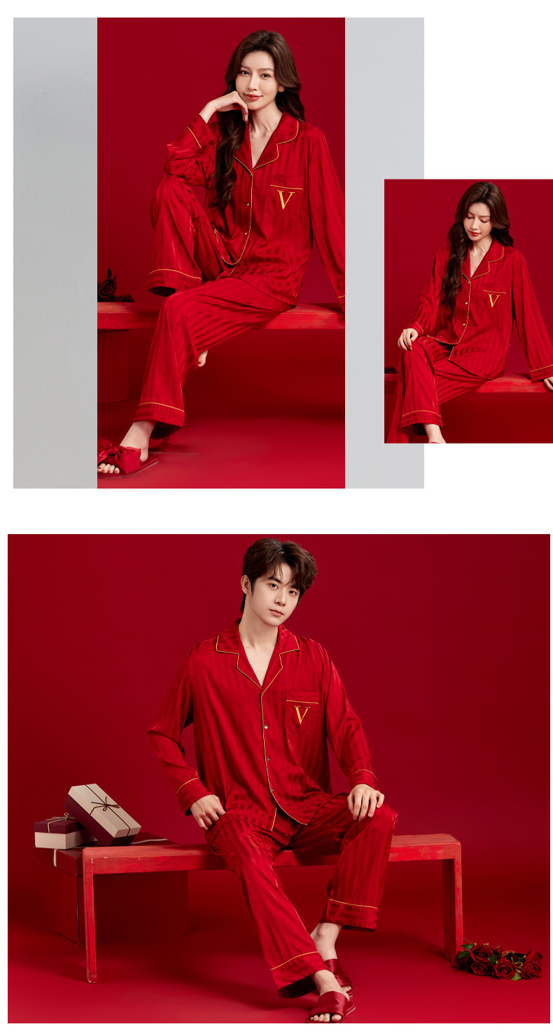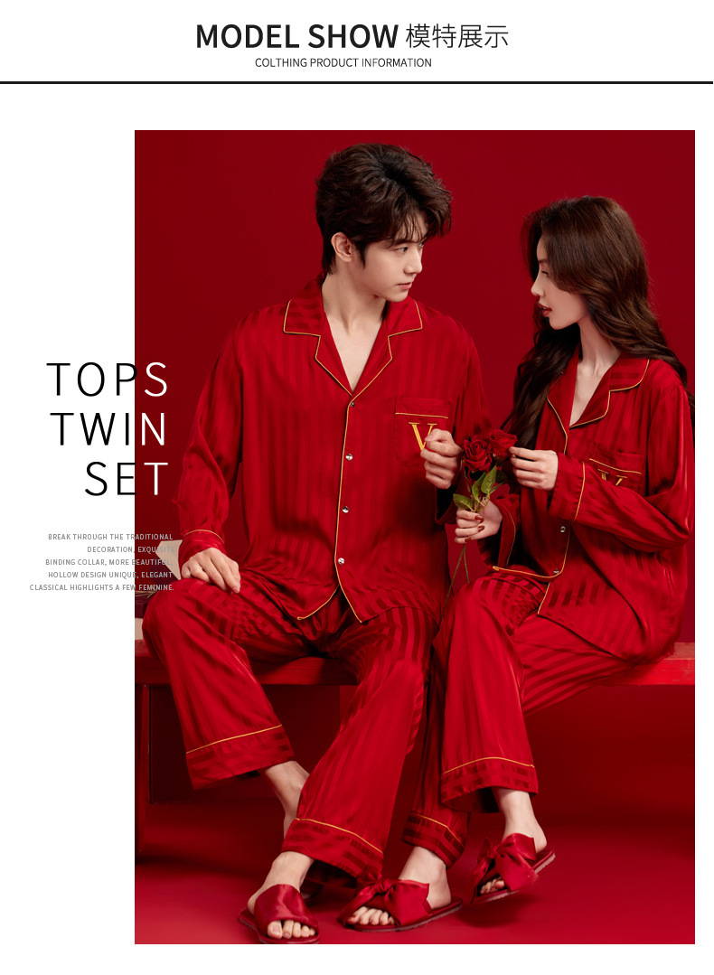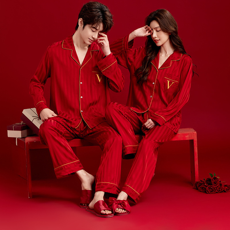 웨이지아 스트라이프 커플 잠옷 아이스 실크 레드 잠옷 남녀 신년 웨딩 홈 의류 세트 25 새로운