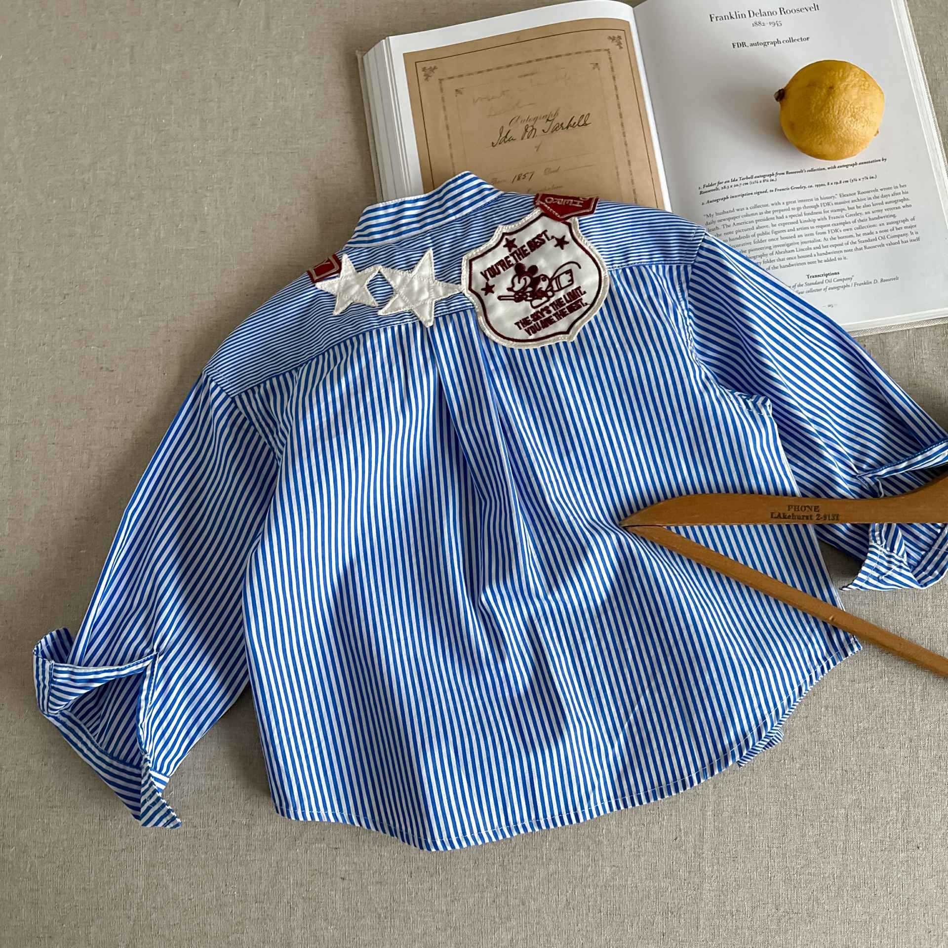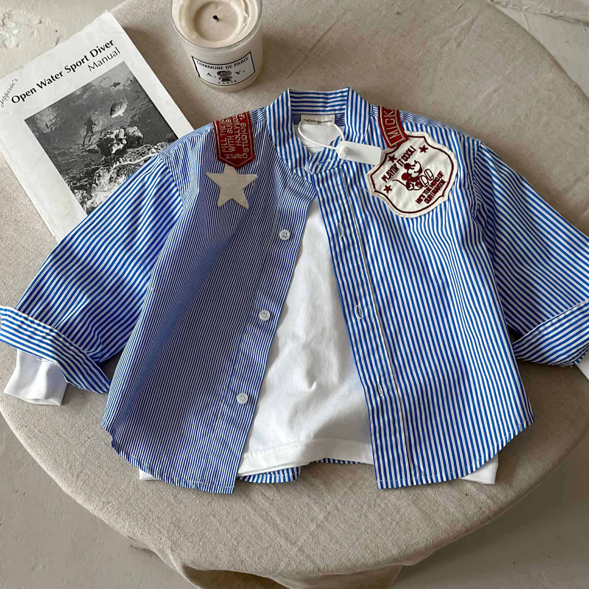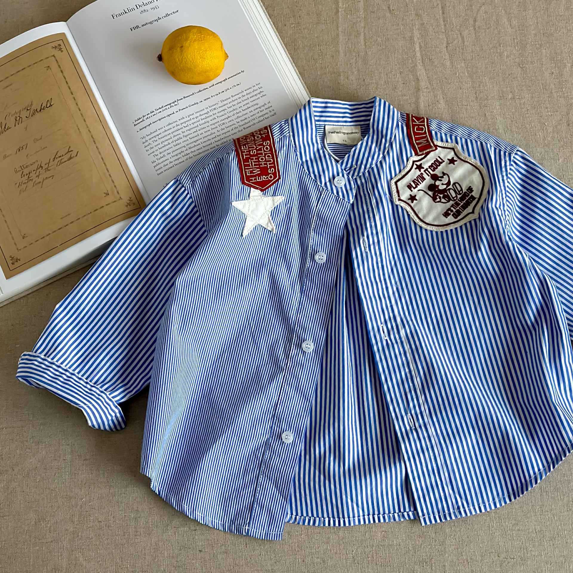 줄무늬 셔츠 남자 2025 봄 새로운 어린이 만화 최고 서양 스타일 아기 라벨 셔츠 여성