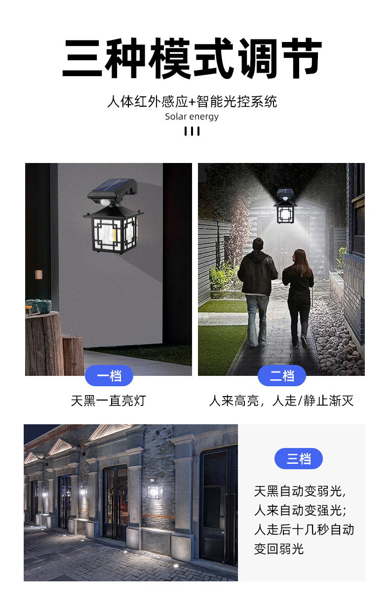 1:人体感应模式(夜间人来高亮,人离开后约20S灯灭)