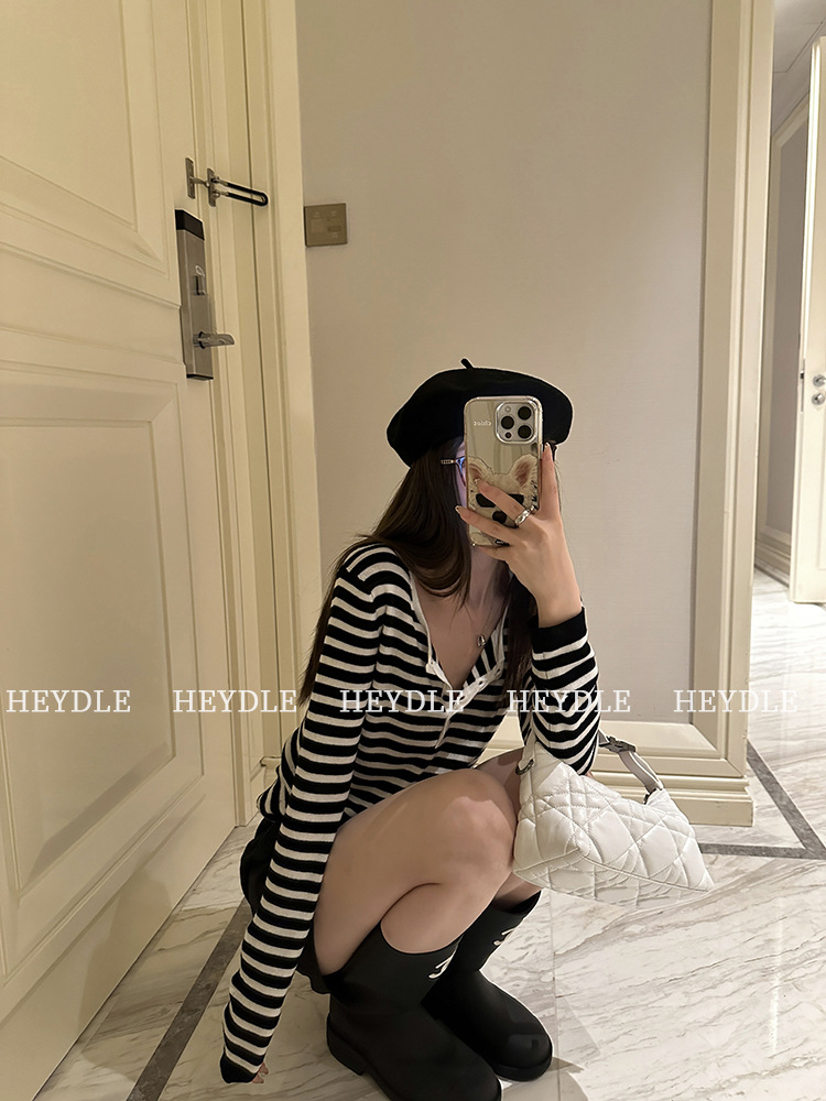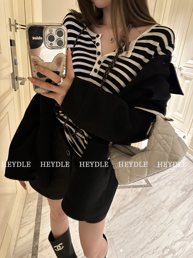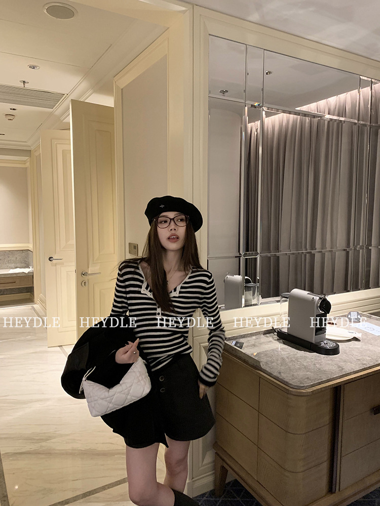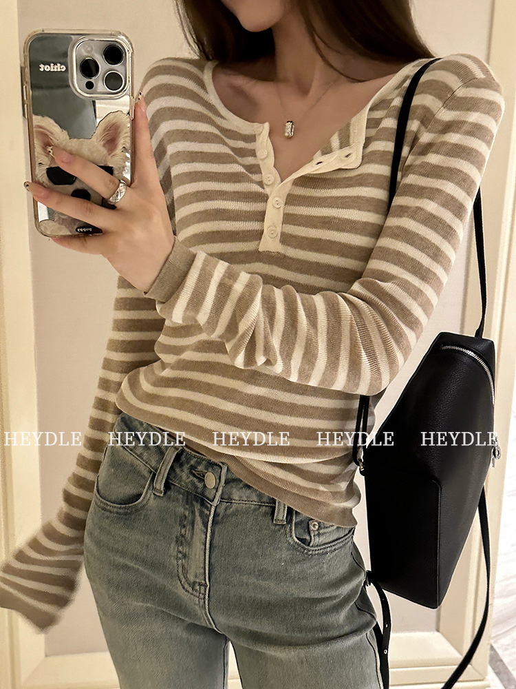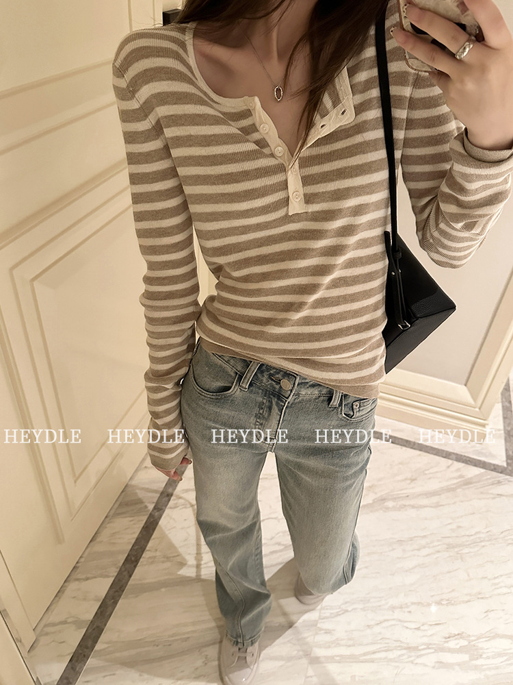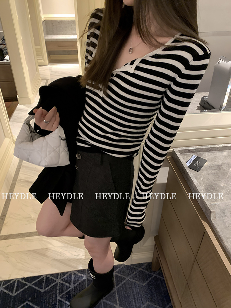 Jiuyue Wu 근무일 오후 * 줄무늬 V 넥 니트 셔츠 여자 가을 올 매치 긴 소매 하프 오픈 칼라 티셔츠 탑