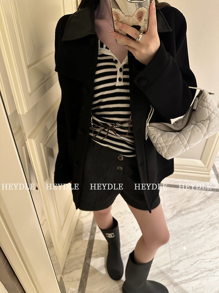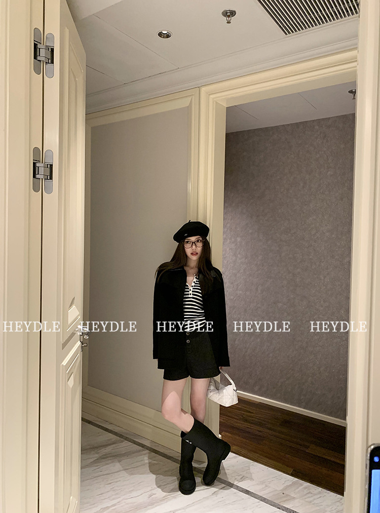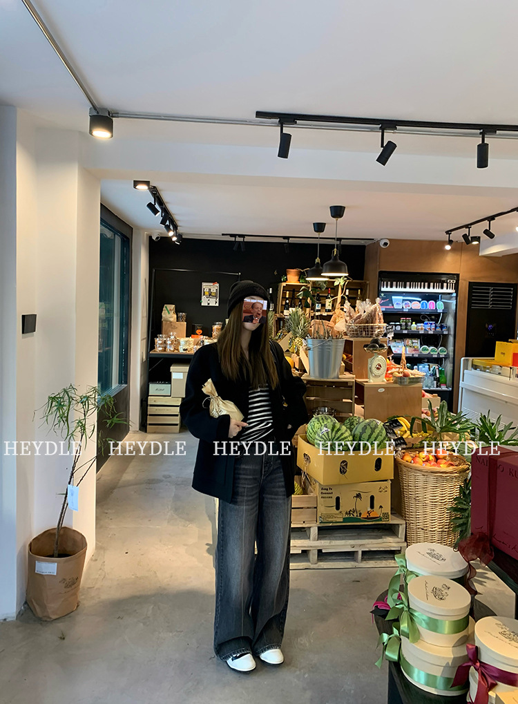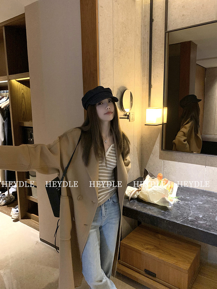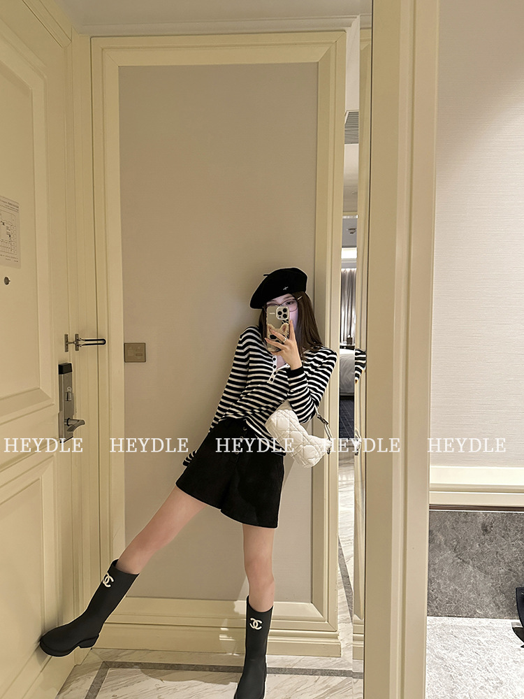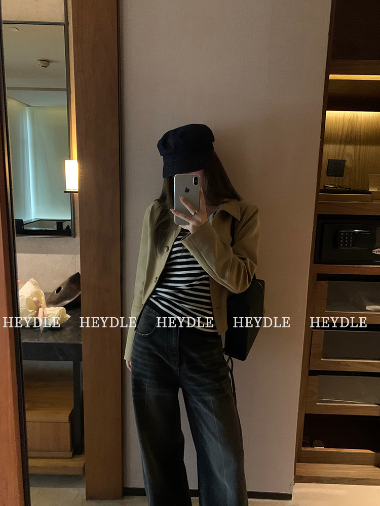 Jiuyue Wu 근무일 오후 * 줄무늬 V 넥 니트 셔츠 여자 가을 올 매치 긴 소매 하프 오픈 칼라 티셔츠 탑