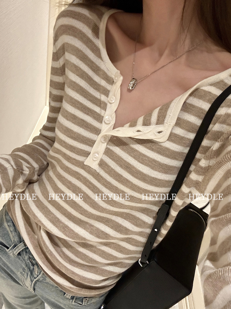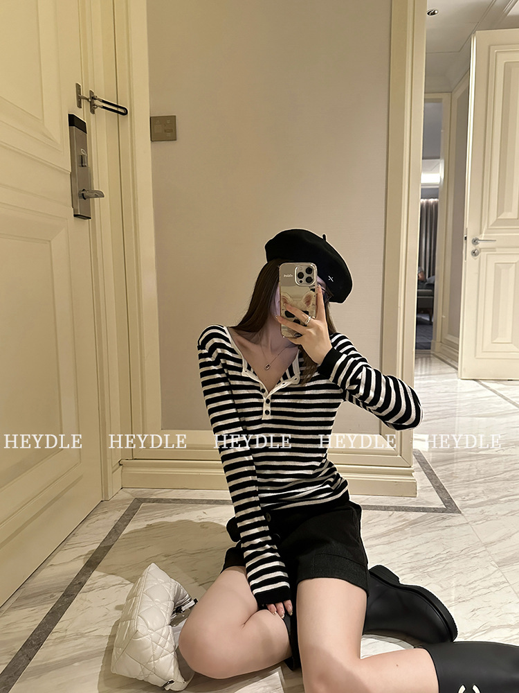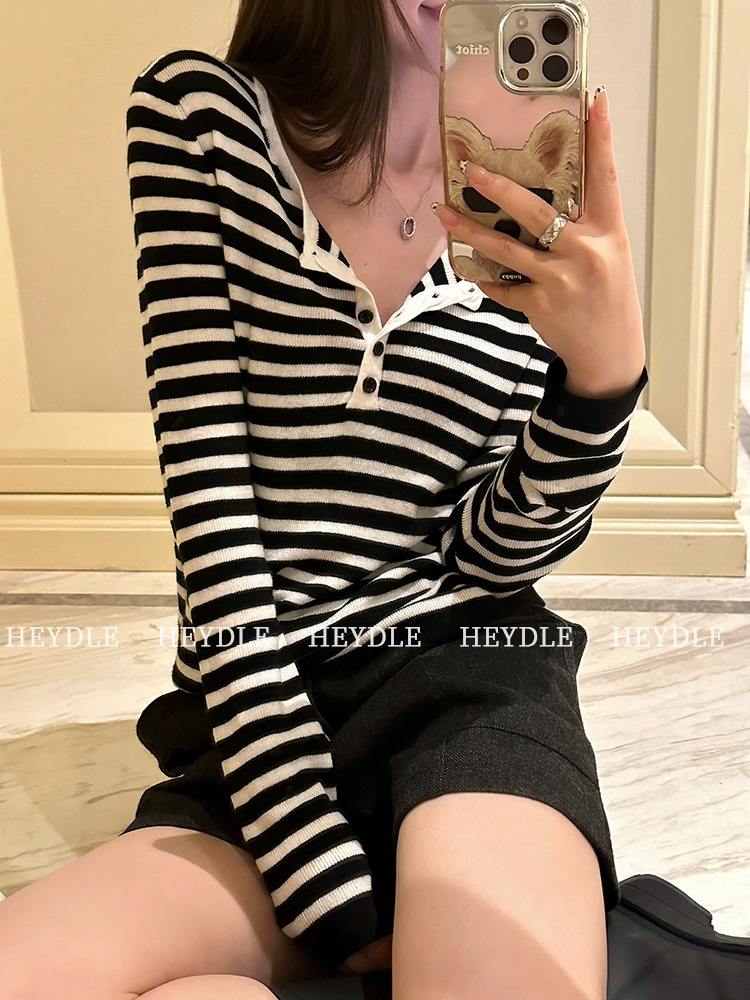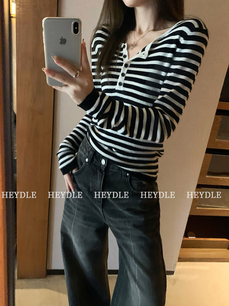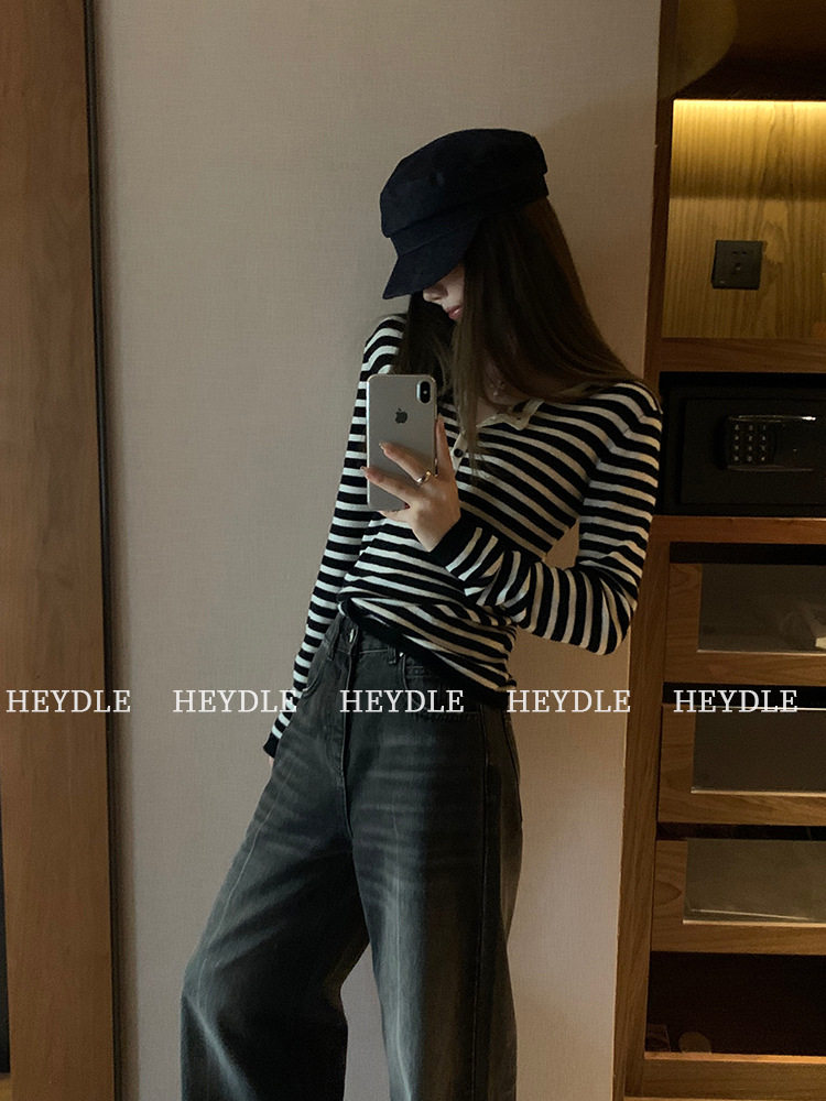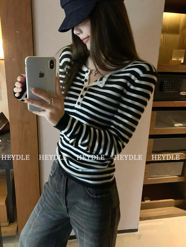 Jiuyue Wu 근무일 오후 * 줄무늬 V 넥 니트 셔츠 여자 가을 올 매치 긴 소매 하프 오픈 칼라 티셔츠 탑스토어 가기