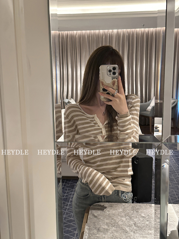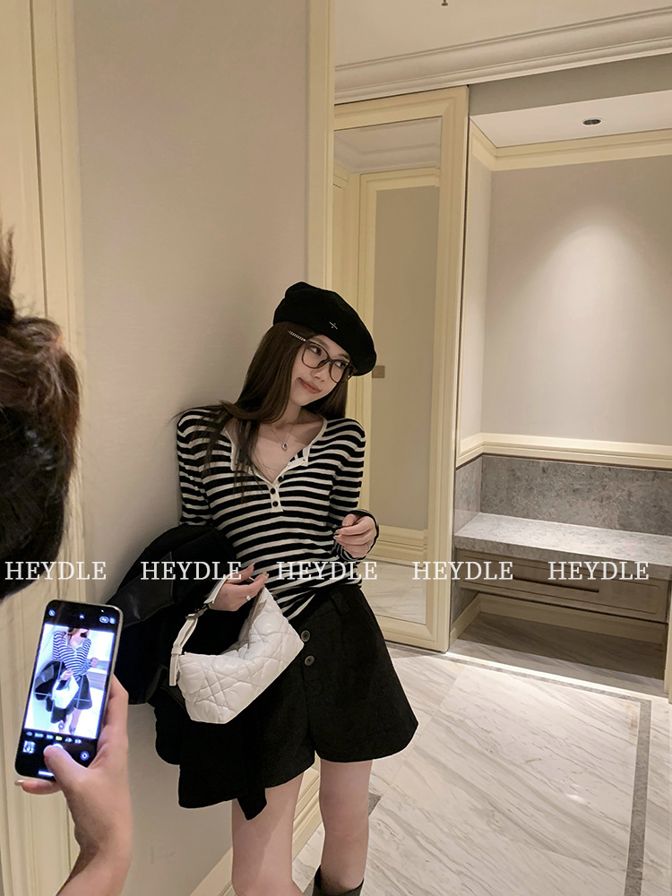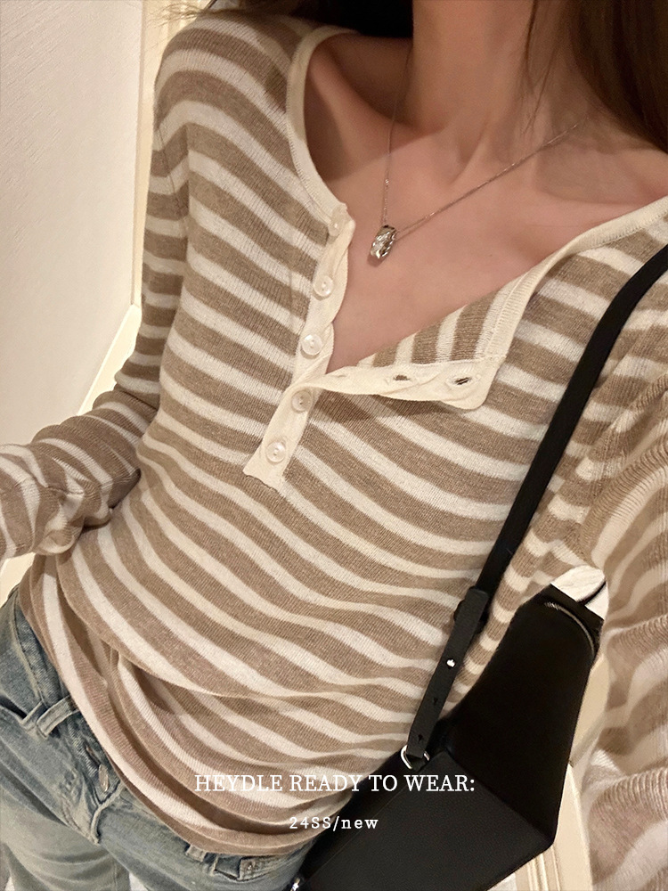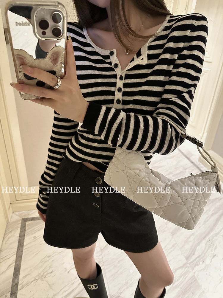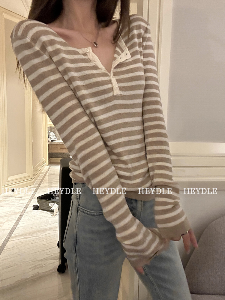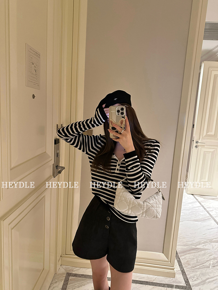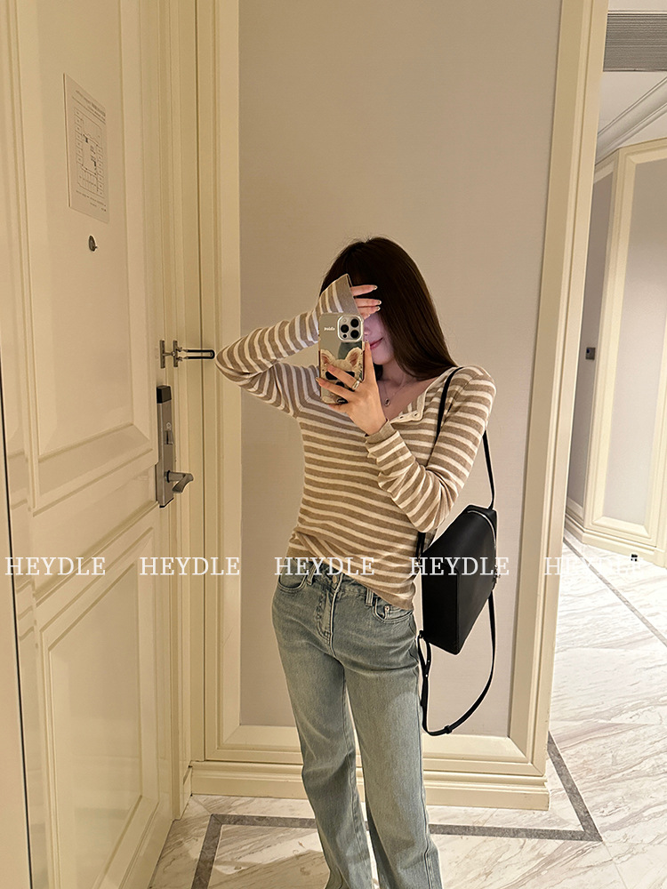Jiuyue Wu 근무일 오후 * 줄무늬 V 넥 니트 셔츠 여자 가을 올 매치 긴 소매 하프 오픈 칼라 티셔츠 탑스토어 가기