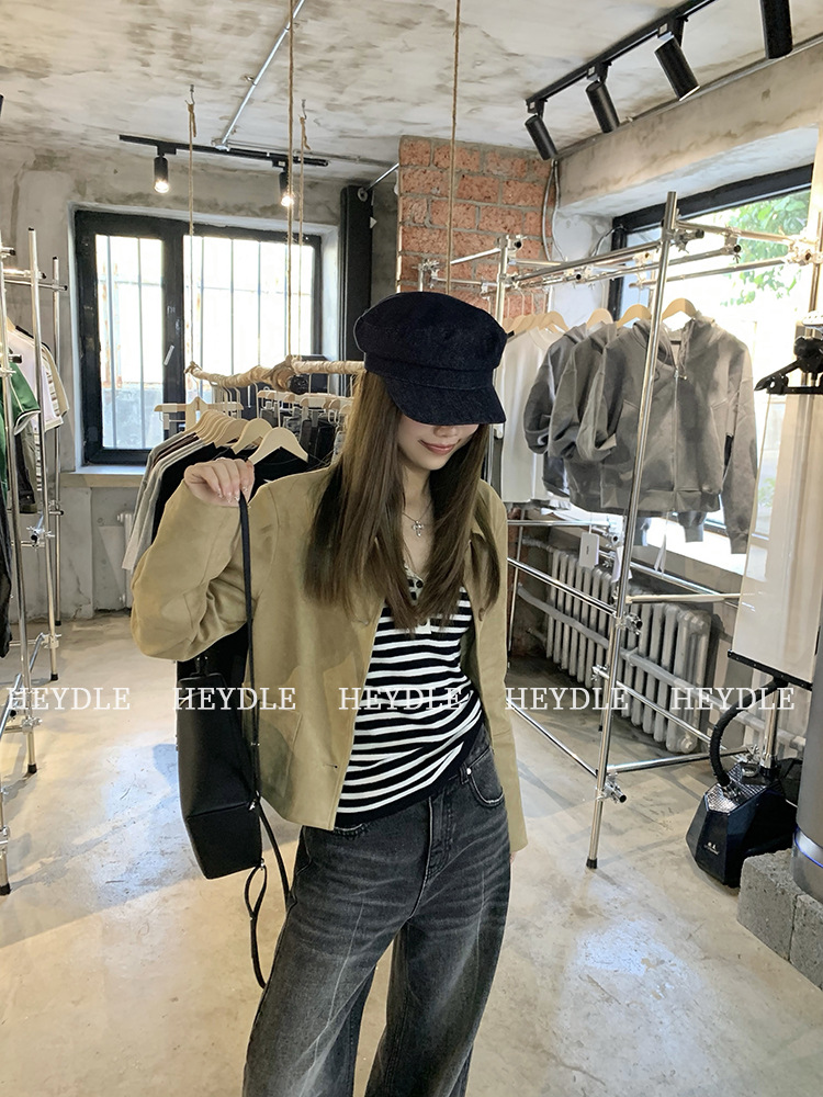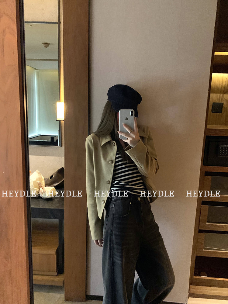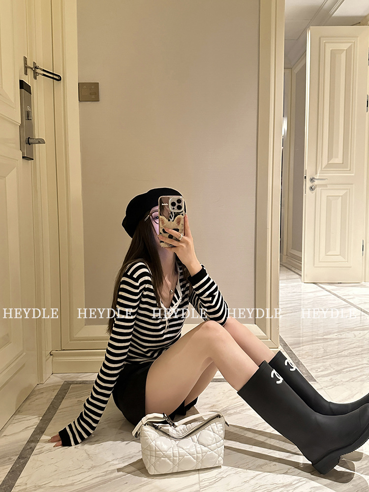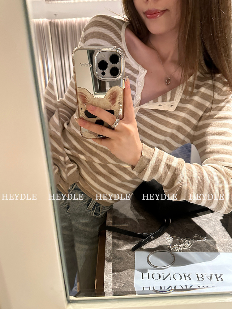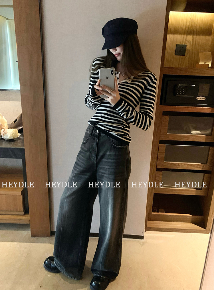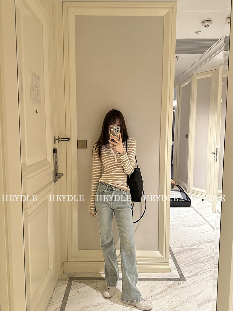 Jiuyue Wu 근무일 오후 * 줄무늬 V 넥 니트 셔츠 여자 가을 올 매치 긴 소매 하프 오픈 칼라 티셔츠 탑스토어 가기