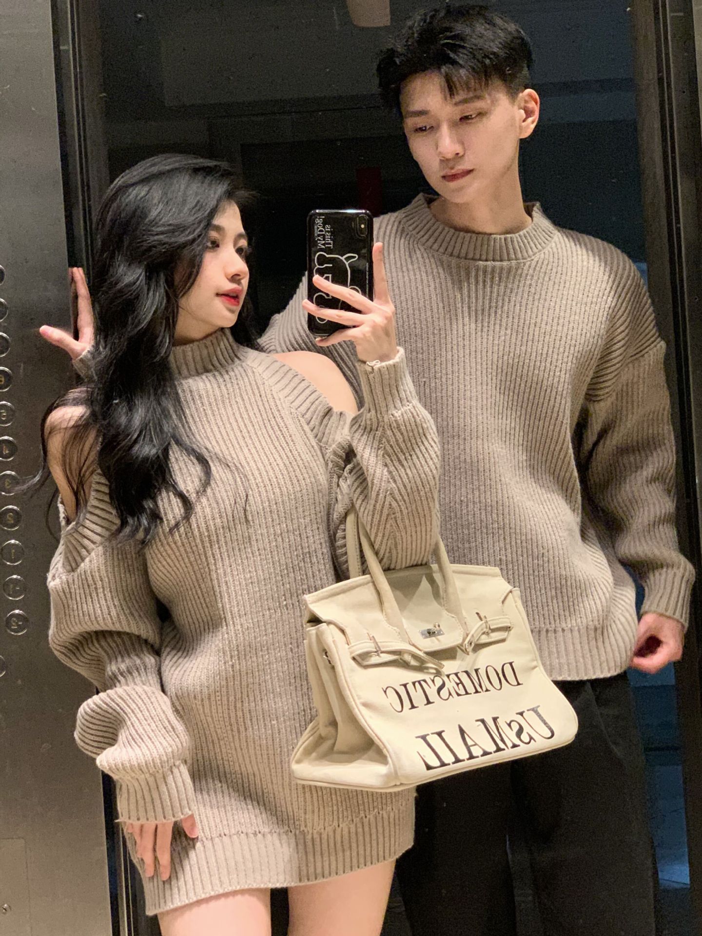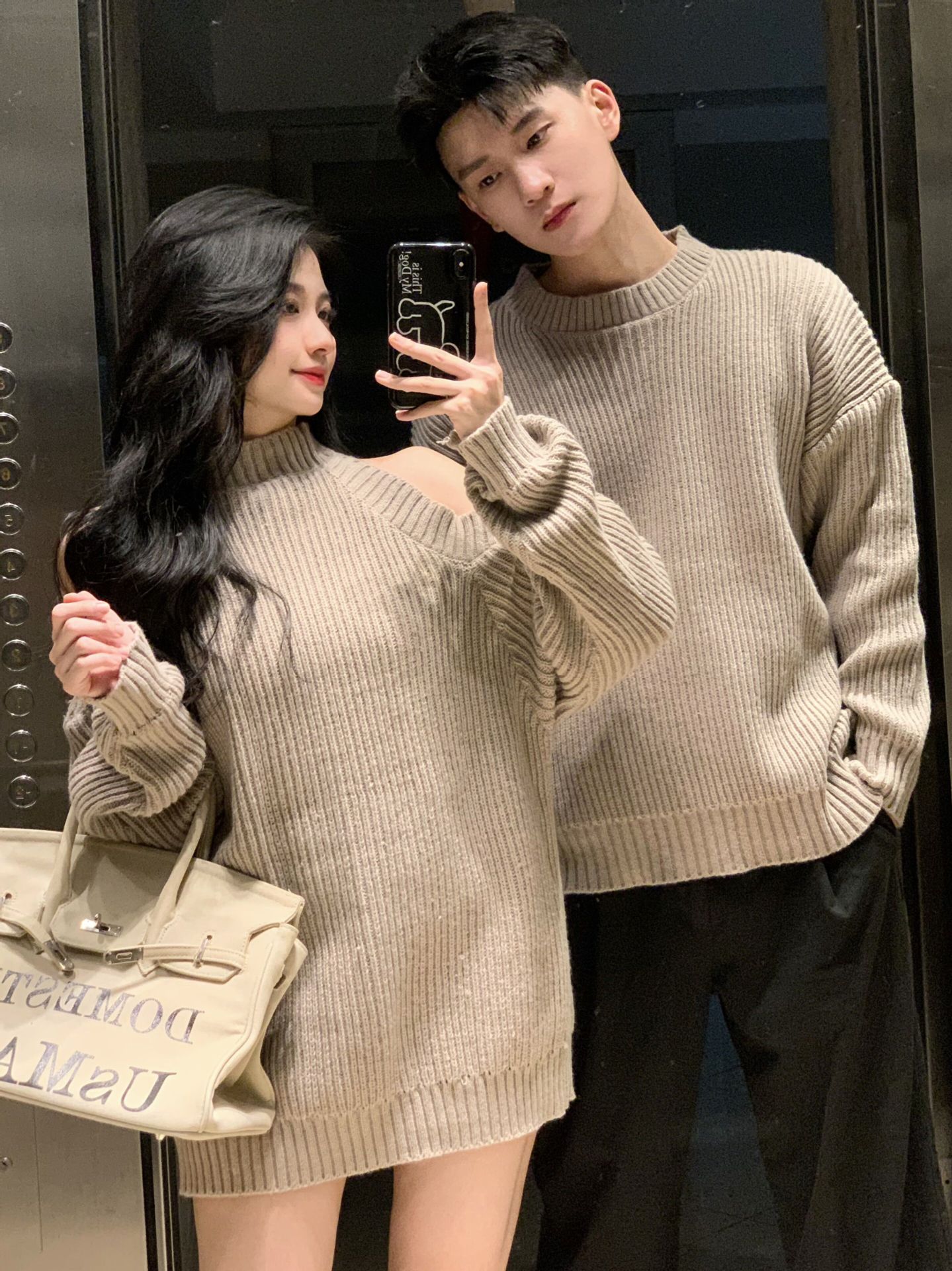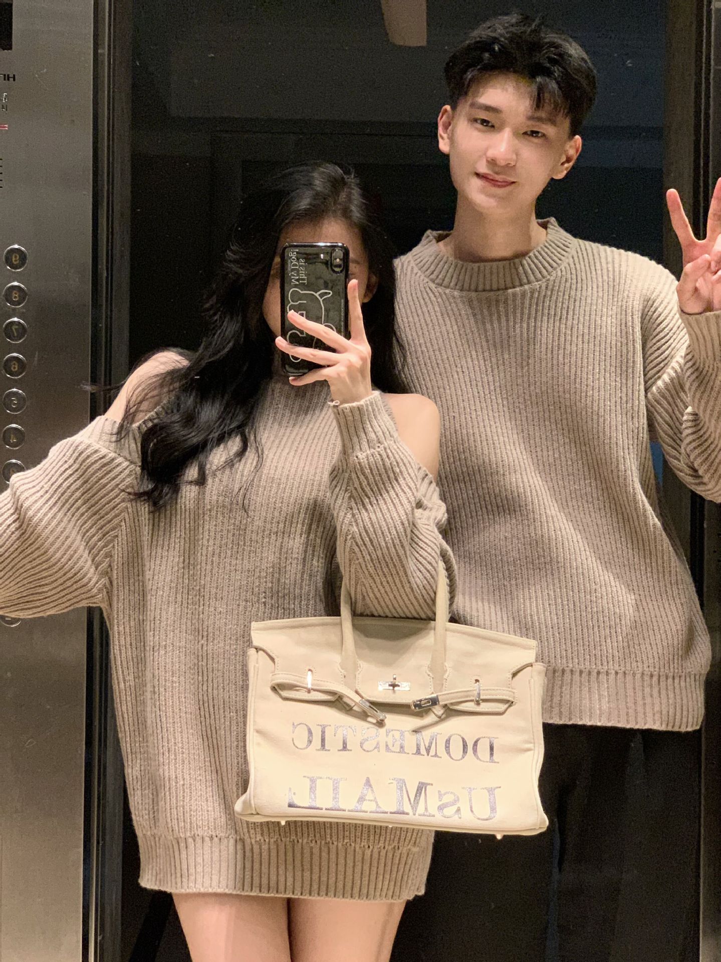 프랑스 커플의 가을과 겨울 새로운 인터넷 인기있는 어깨 스웨터 스커트 남자 풀오버 라운드 넥 우아한 스웨터 탑 트렌디스토어 가기