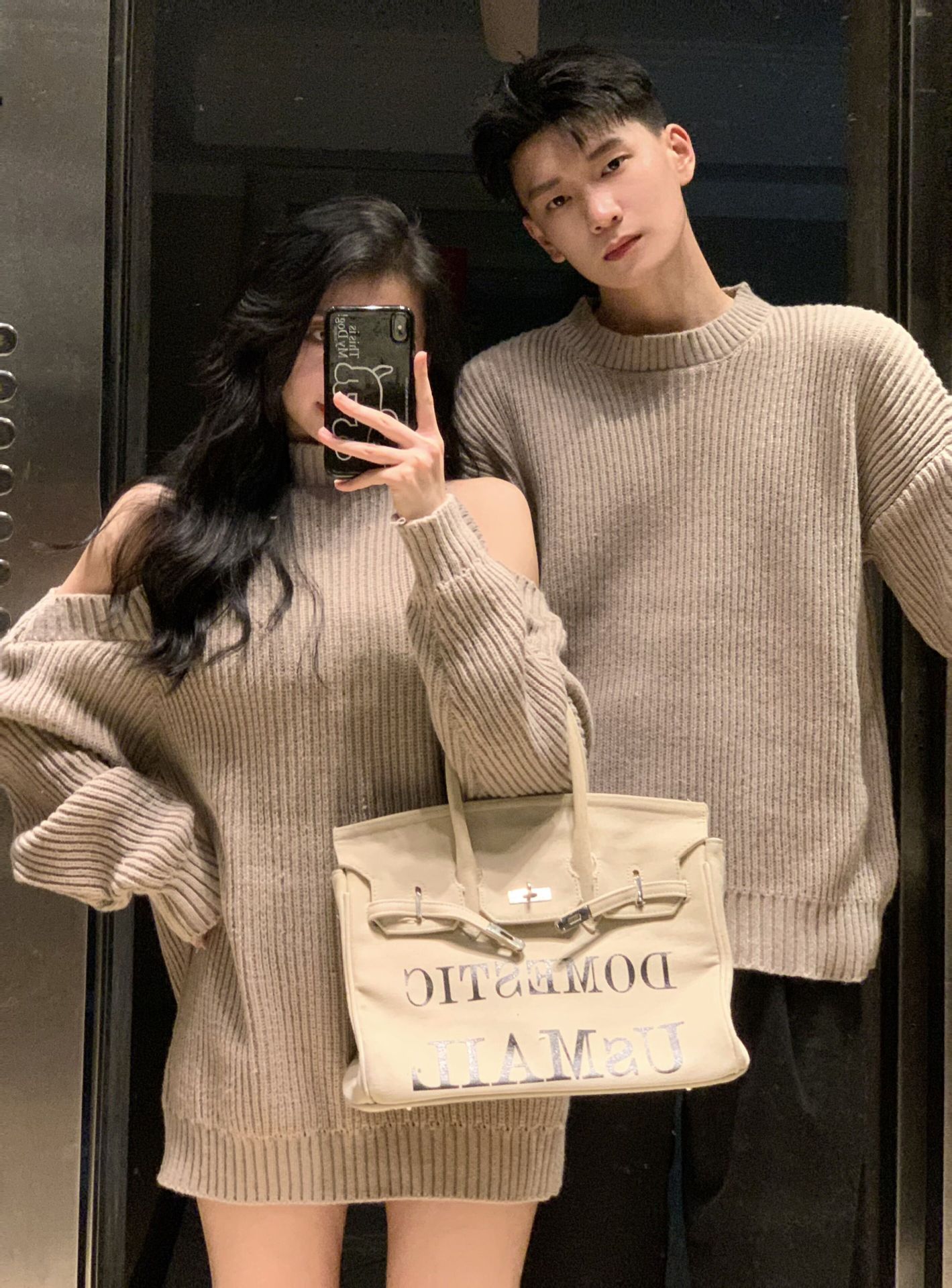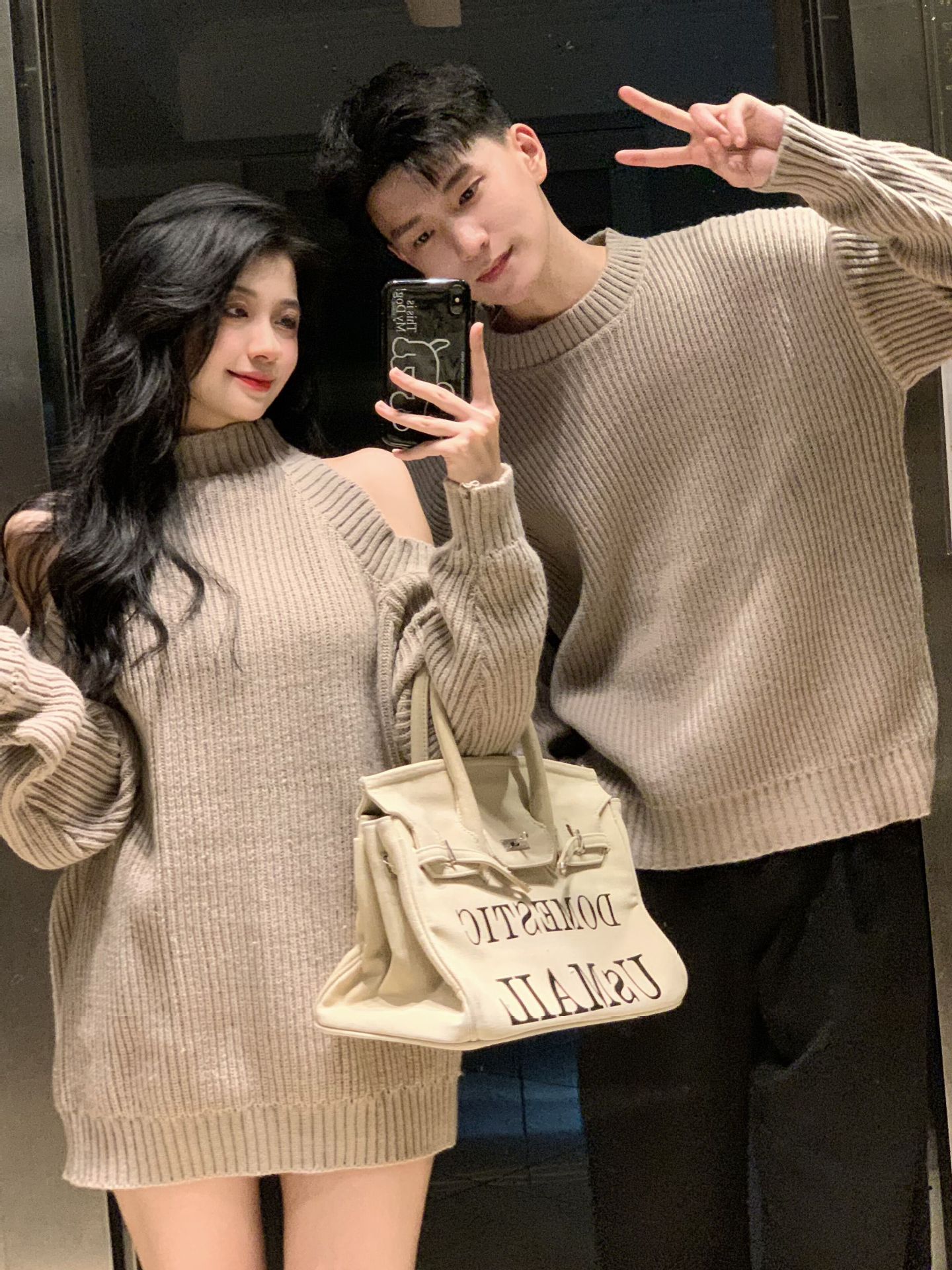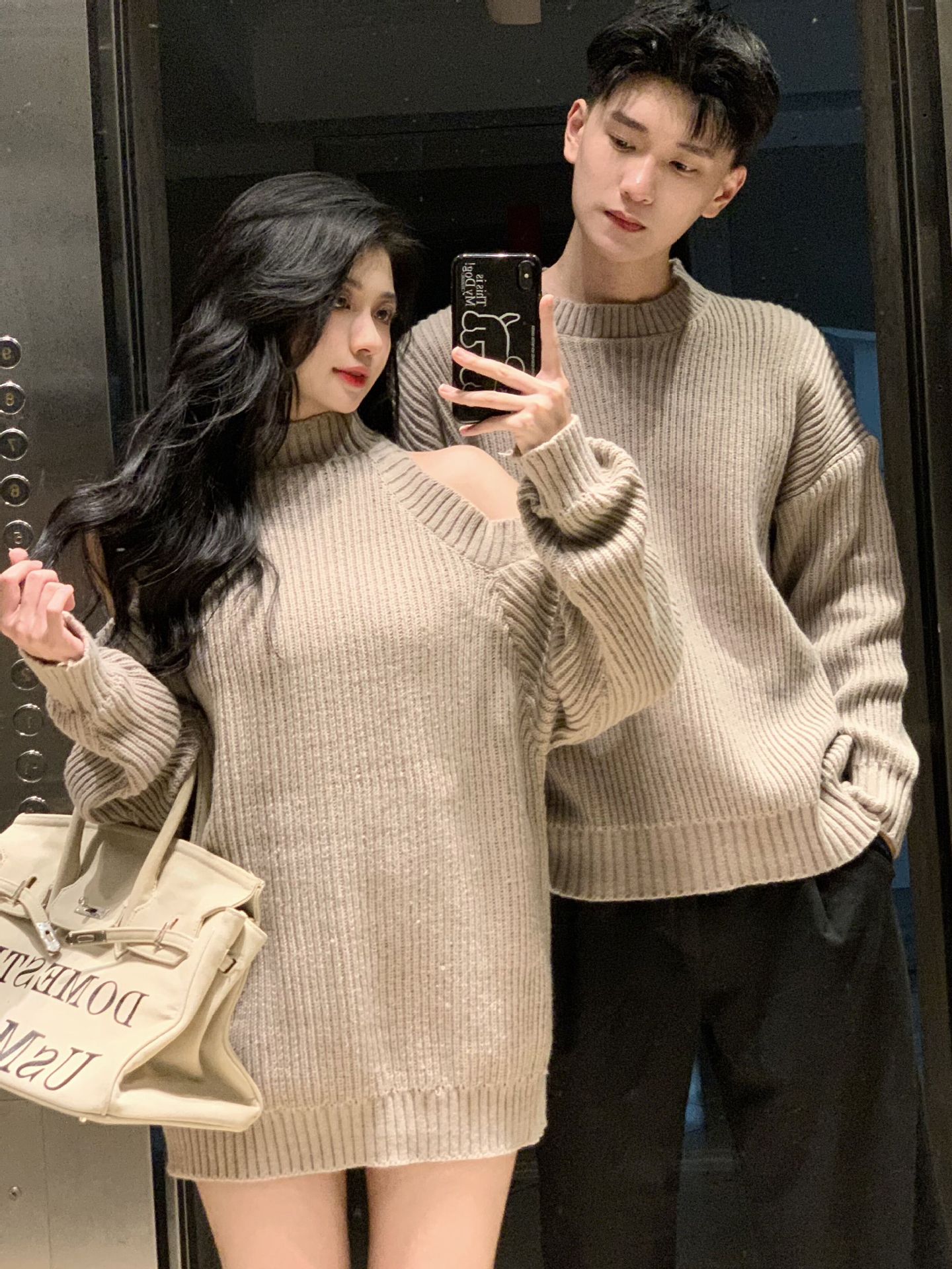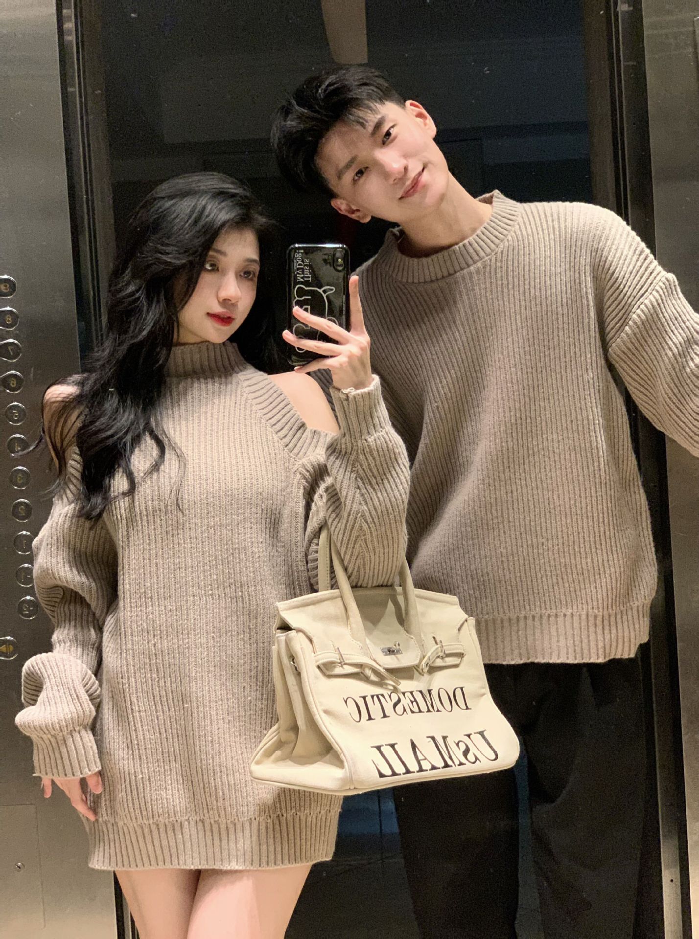 프랑스 커플의 가을과 겨울 새로운 인터넷 인기있는 어깨 스웨터 스커트 남자 풀오버 라운드 넥 우아한 스웨터 탑 트렌디스토어 가기