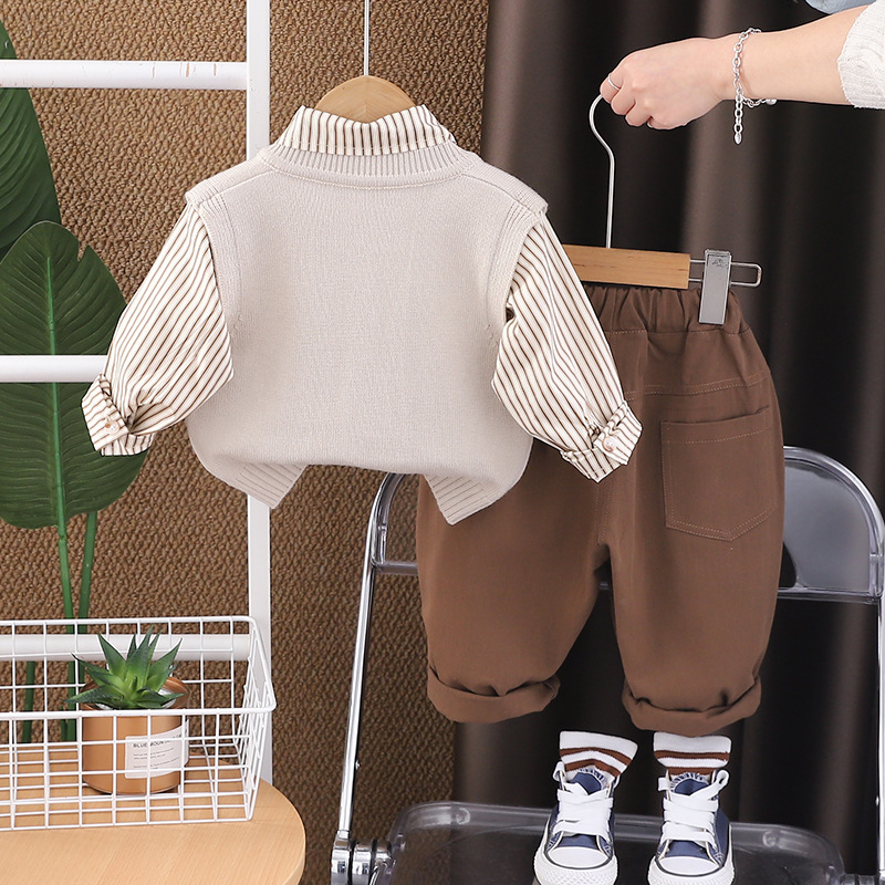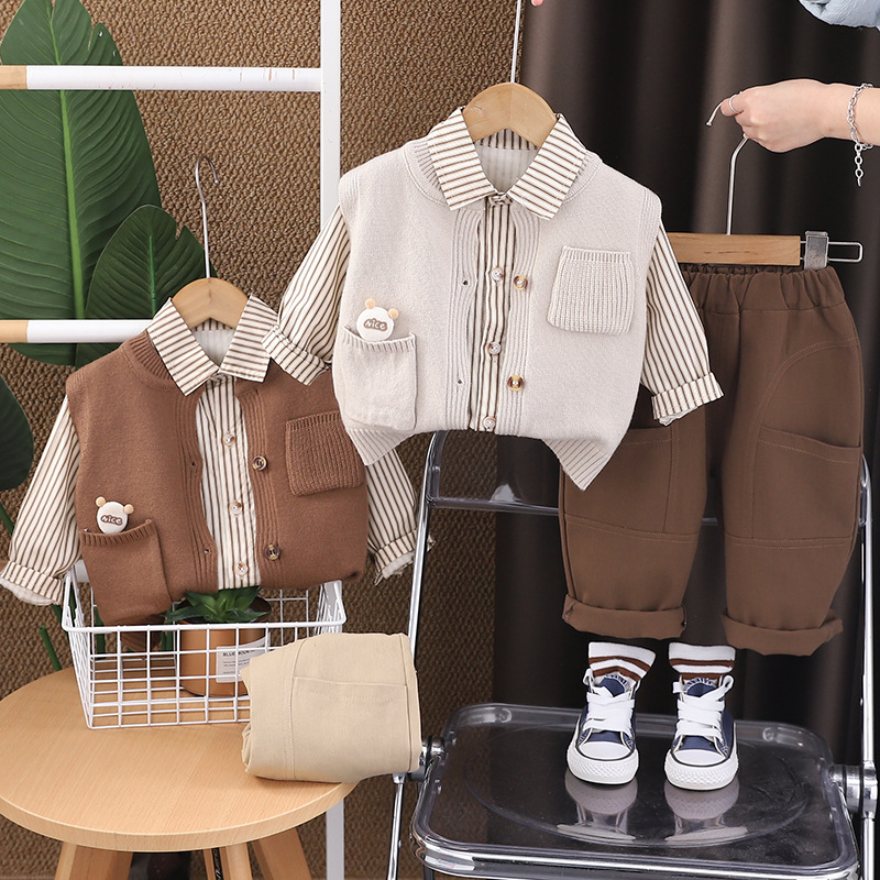 5 개의 작은 7 아동복 2025 봄과 가을 새로운 0-4 세 소년 소녀 높고 낮은 포켓 조끼 셔츠 3 피스 세트스토어 가기