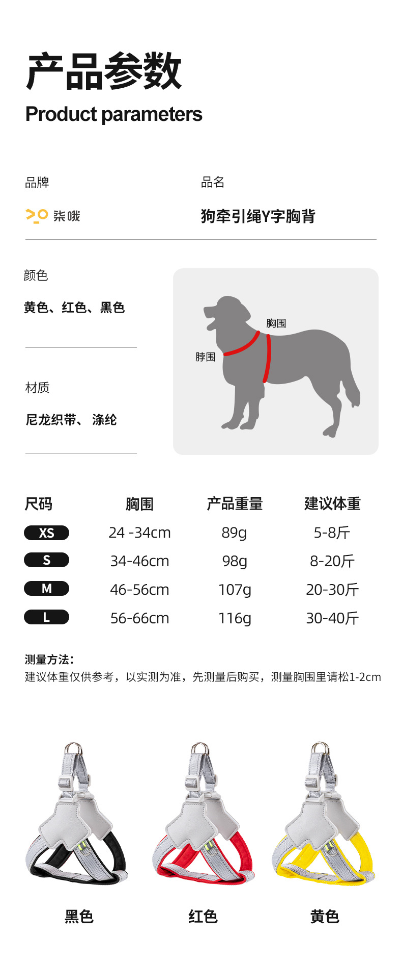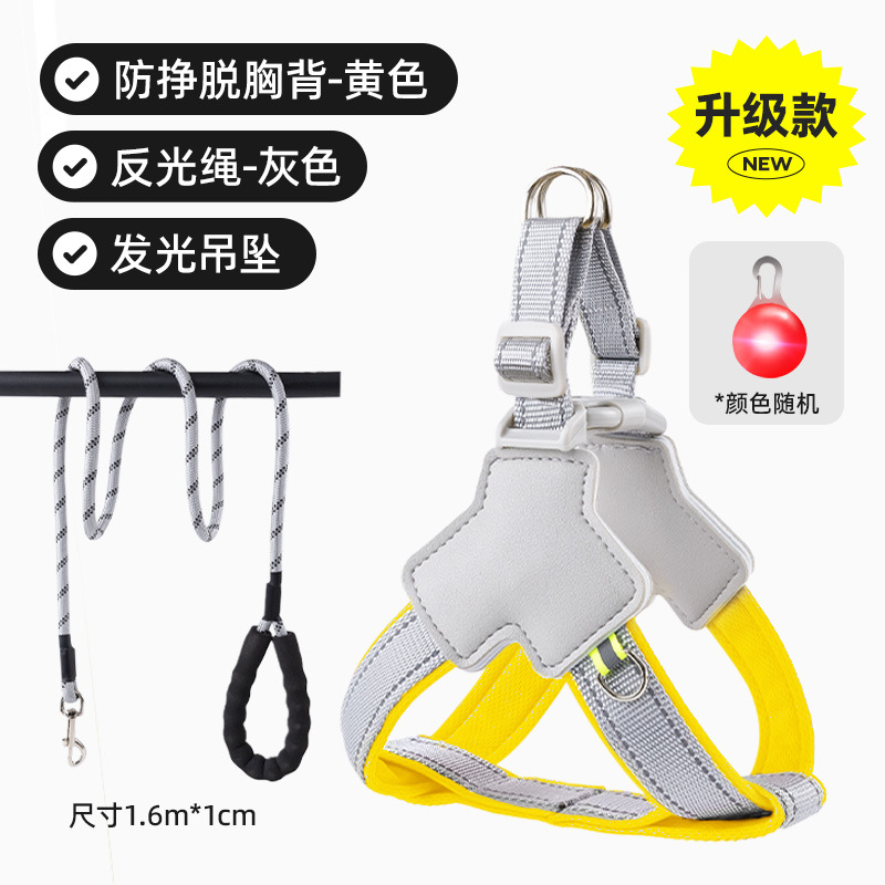 • 노란색(가슴과 등 풀림 방지 + 1.6m 반사 로프)에는 야광 펜던트가 함께 제공됩니다.