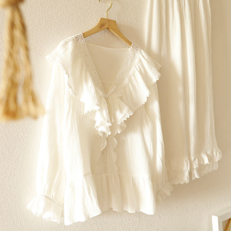 무료 배송 화이트 프린세스 스타일 잠옷 여성의 봄과 가을 여름 긴 소매 얇은 거즈 달콤한 레이스 하프 뮤 홈 옷