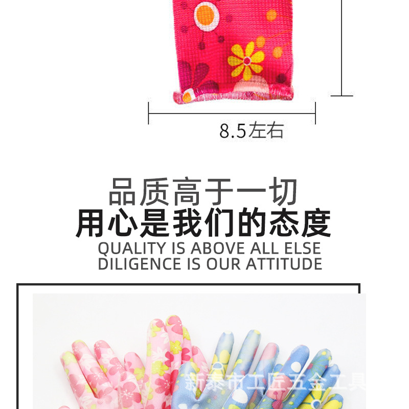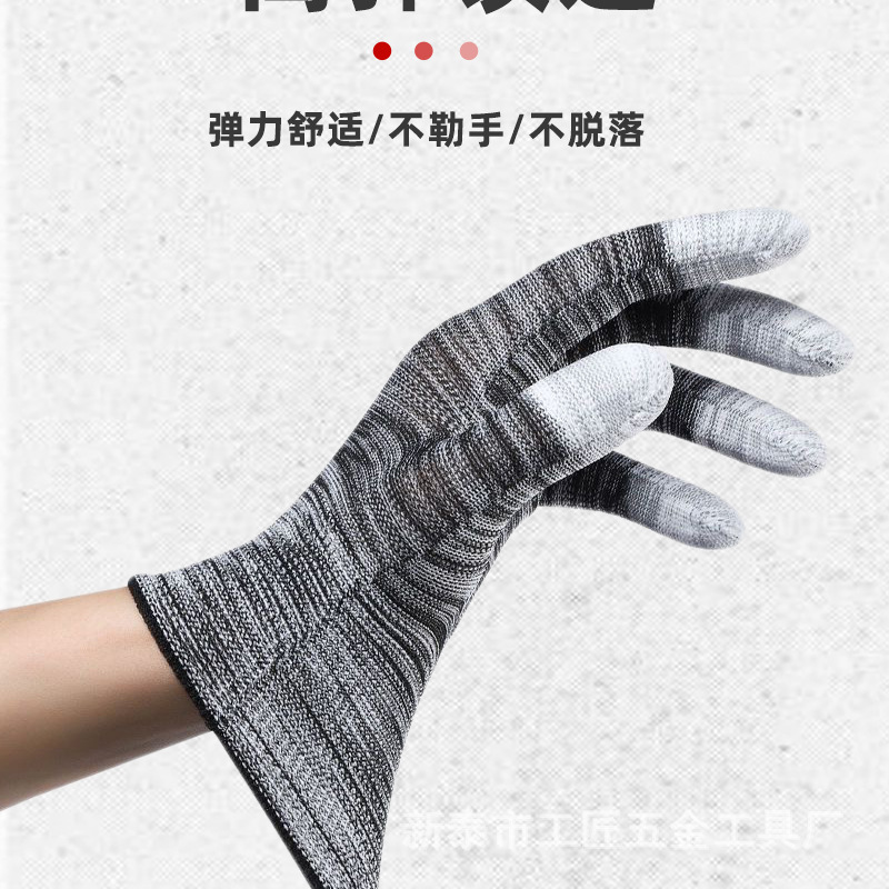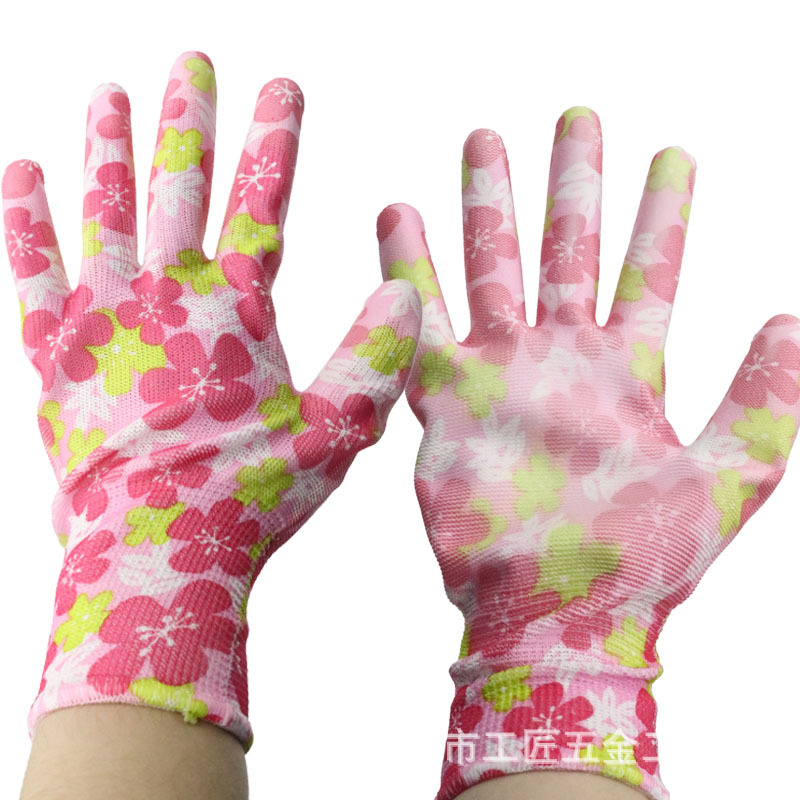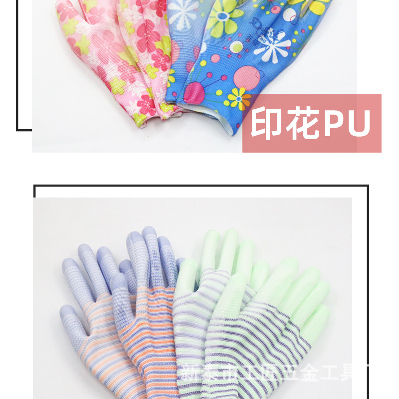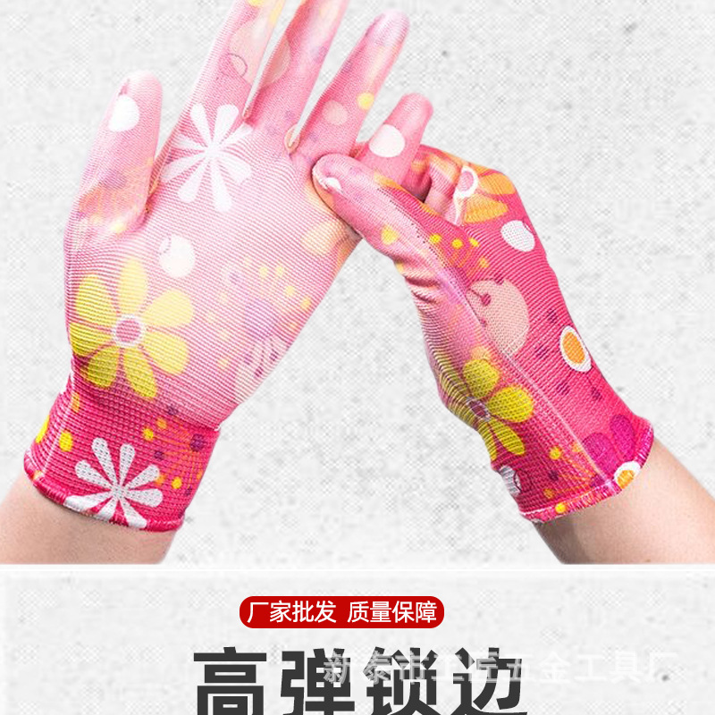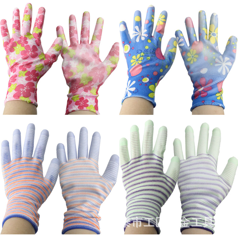 공장 도매 PU 야자 코팅 장갑 인쇄 줄무늬 먼지가없는 정전기 방지 담그는 미끄럼 방지 내마모성 원예 장갑스토어 가기