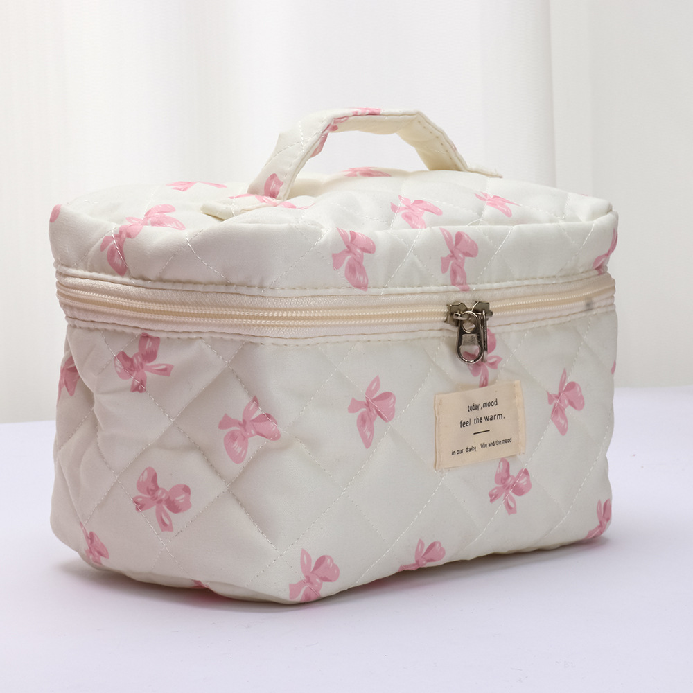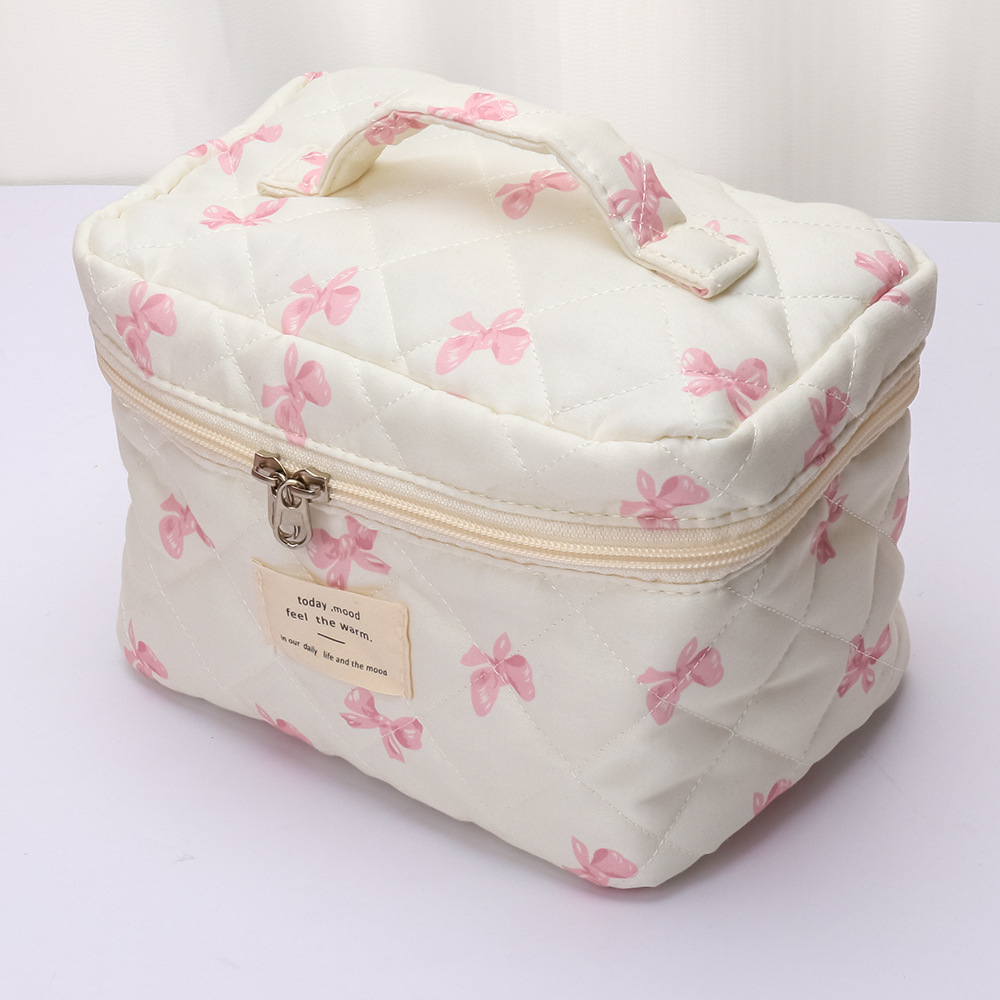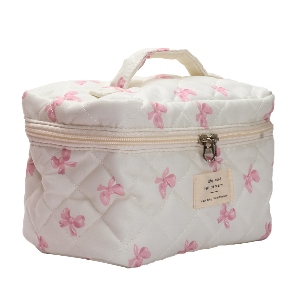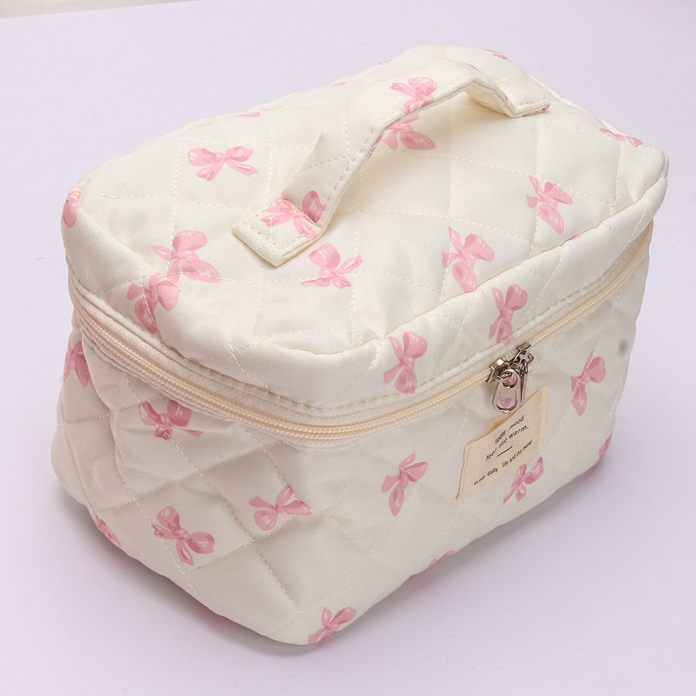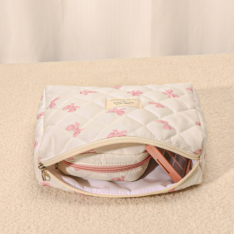 品名:粉白蝴蝶结绗缝手提化妆包三件套