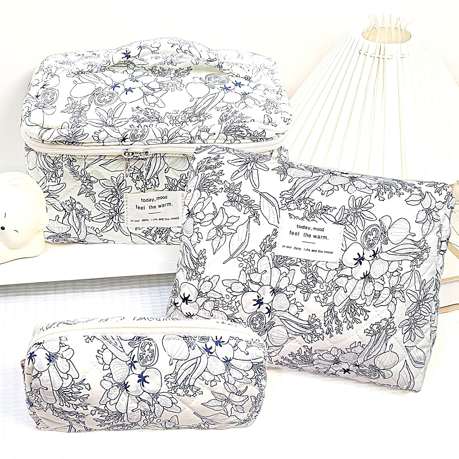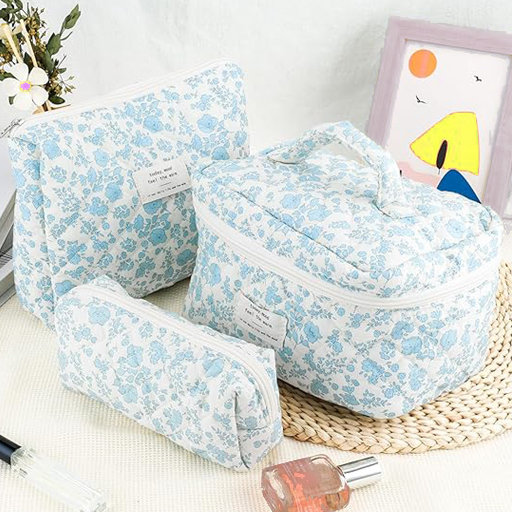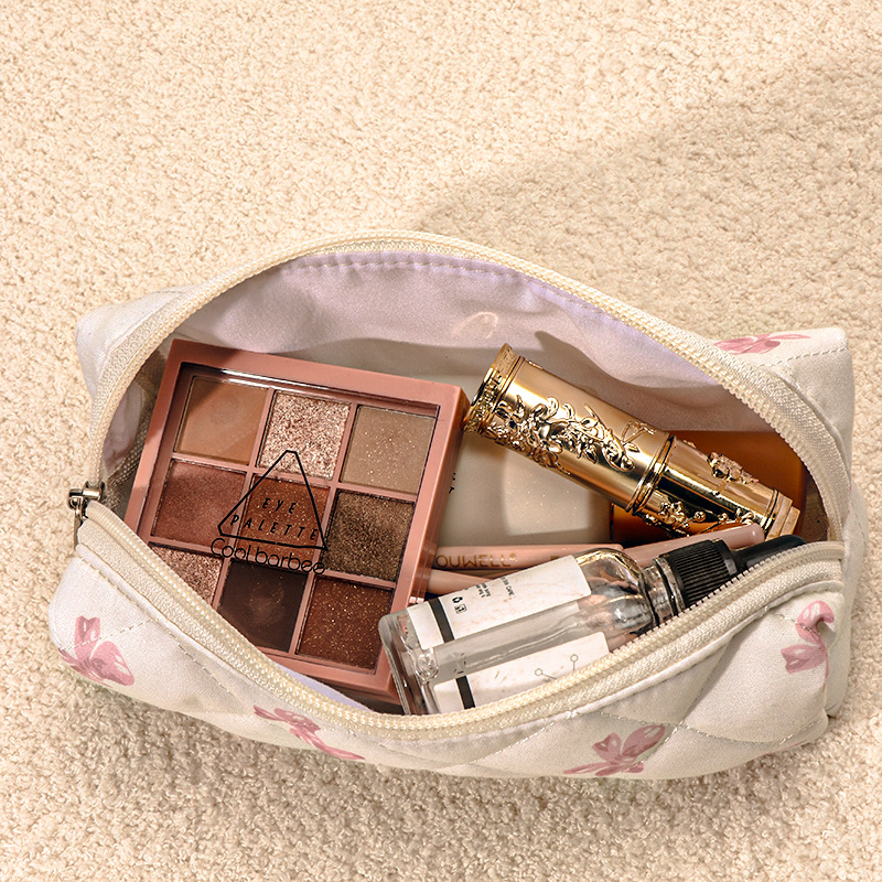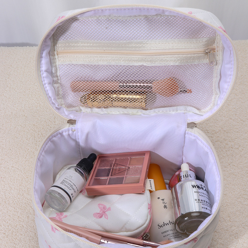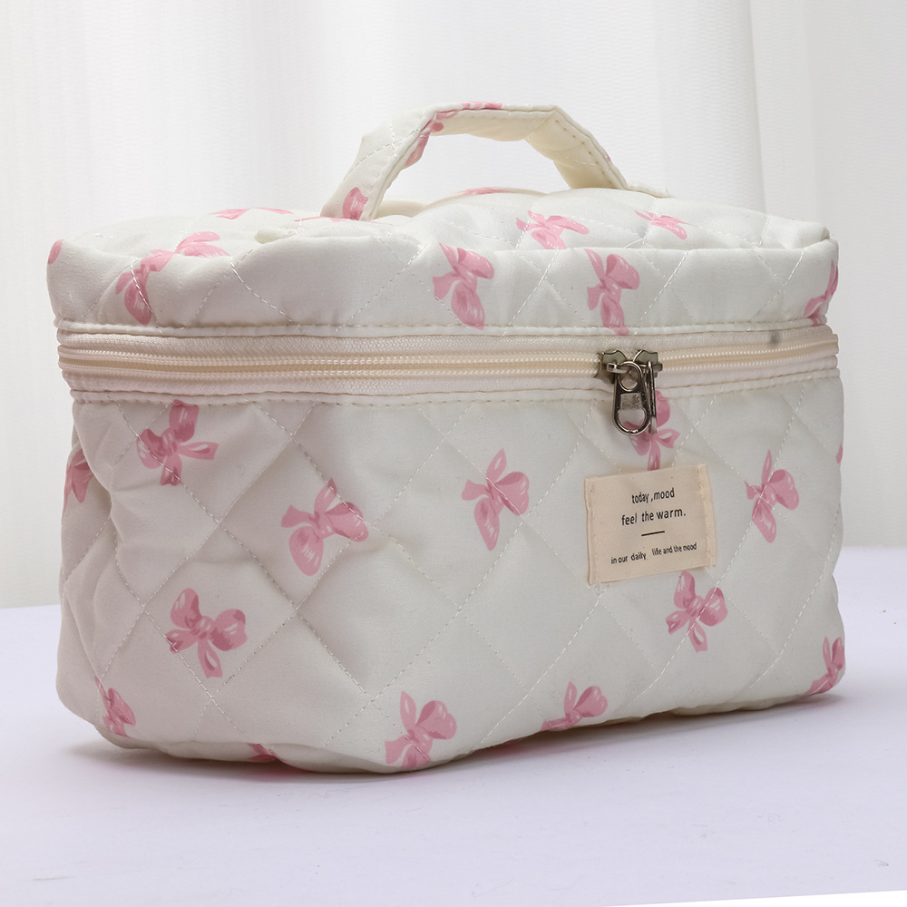 品名:粉白蝴蝶结绗缝手提化妆包三件套