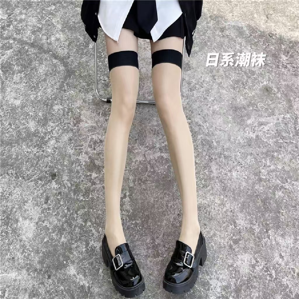 • 얇은 스티치가 있는 무릎 위 양말, 피부색의 검은색 가장자리