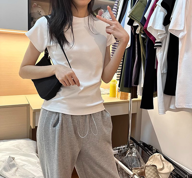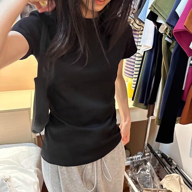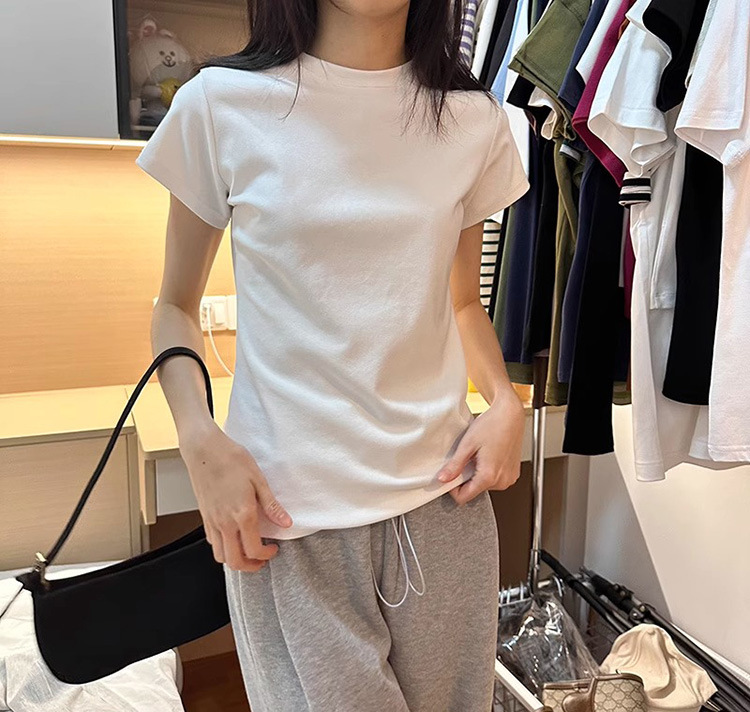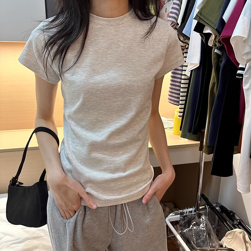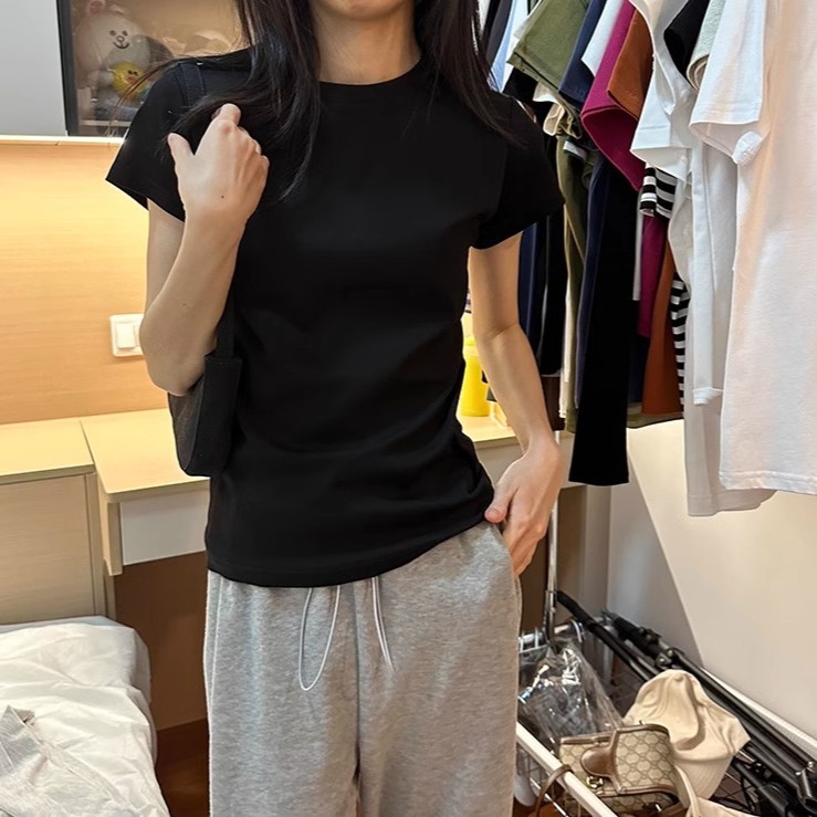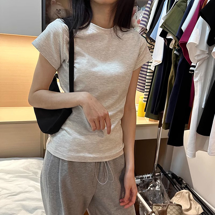 한국식 라운드 넥 반팔 티셔츠 여성용 슬림핏 슬리밍 베이직베이스 셔츠 여름 캐주얼 올 매치 솔리드 컬러 탑인스토어 가기