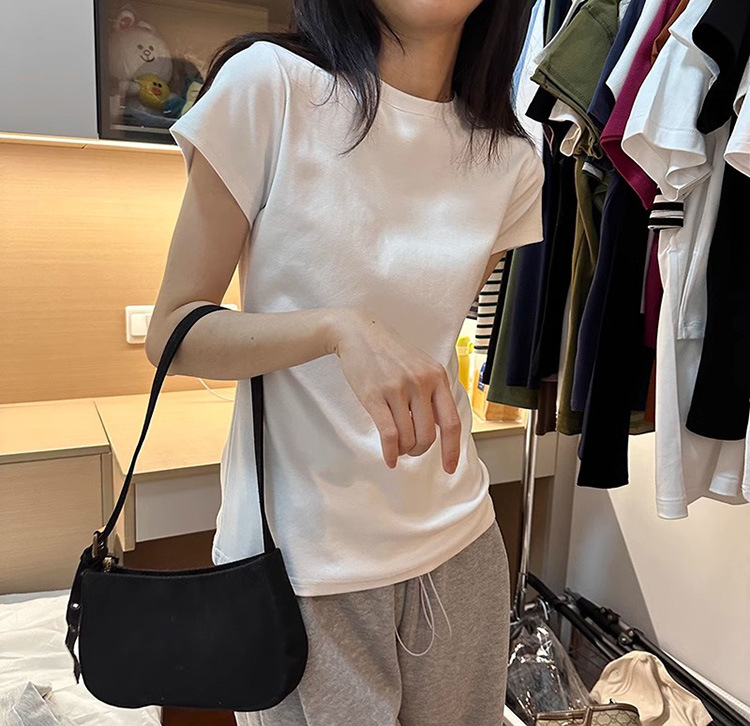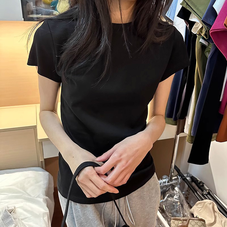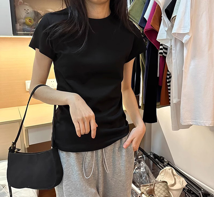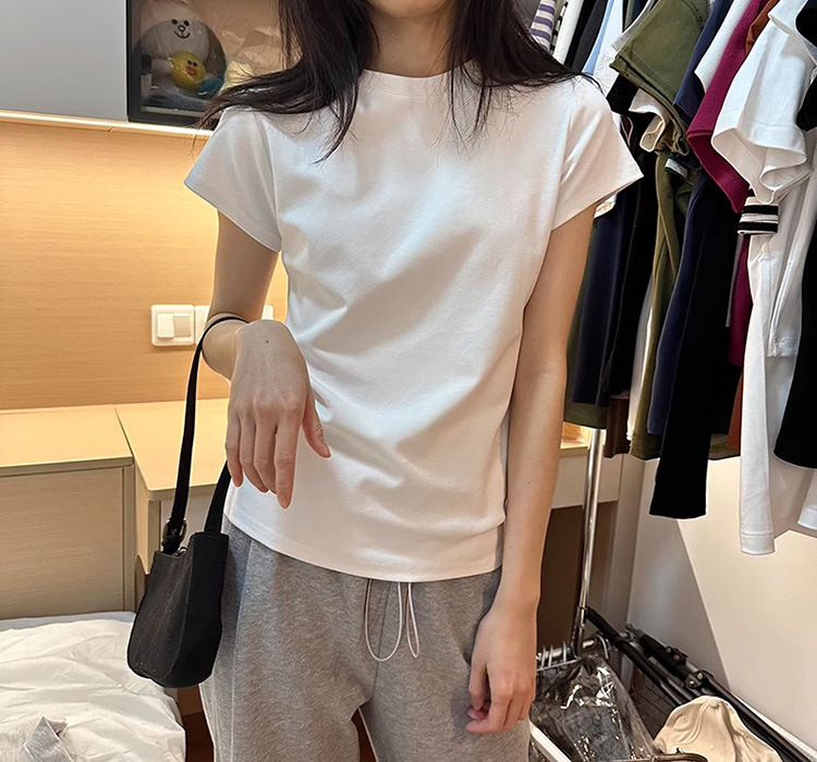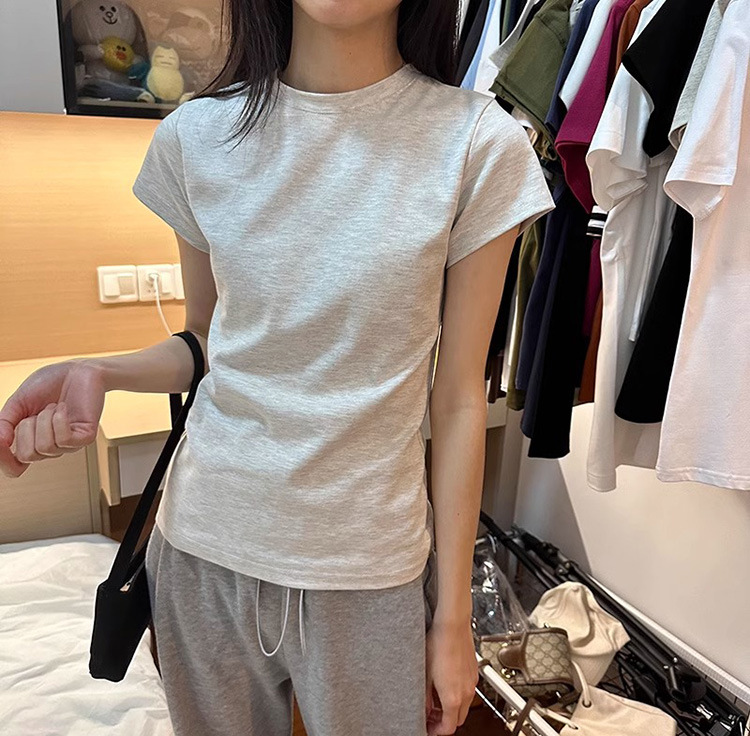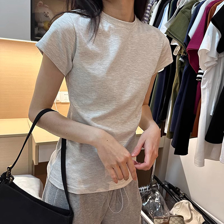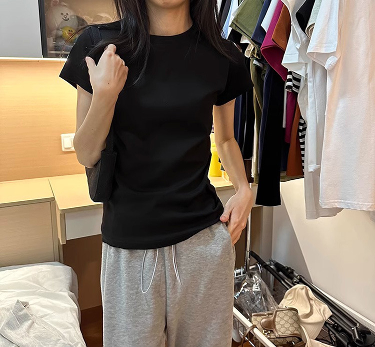 한국식 라운드 넥 반팔 티셔츠 여성용 슬림핏 슬리밍 베이직베이스 셔츠 여름 캐주얼 올 매치 솔리드 컬러 탑인스토어 가기