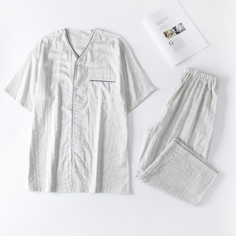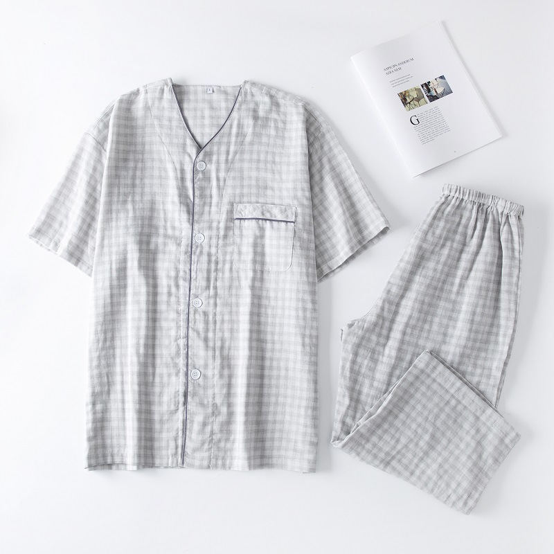 여름용 남성 면 반팔 잠옷, 무지 이중 거즈 칼라리스 체크무늬 7부 바지 홈웨어 세트 도매스토어 가기