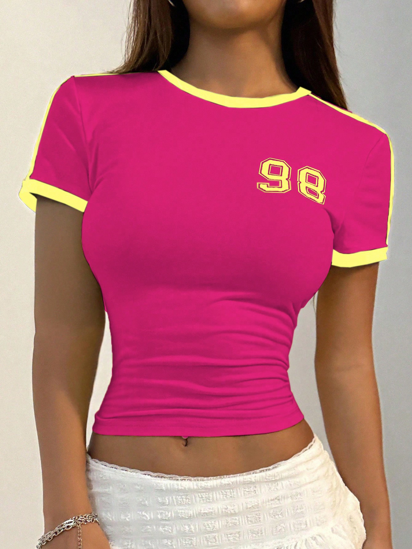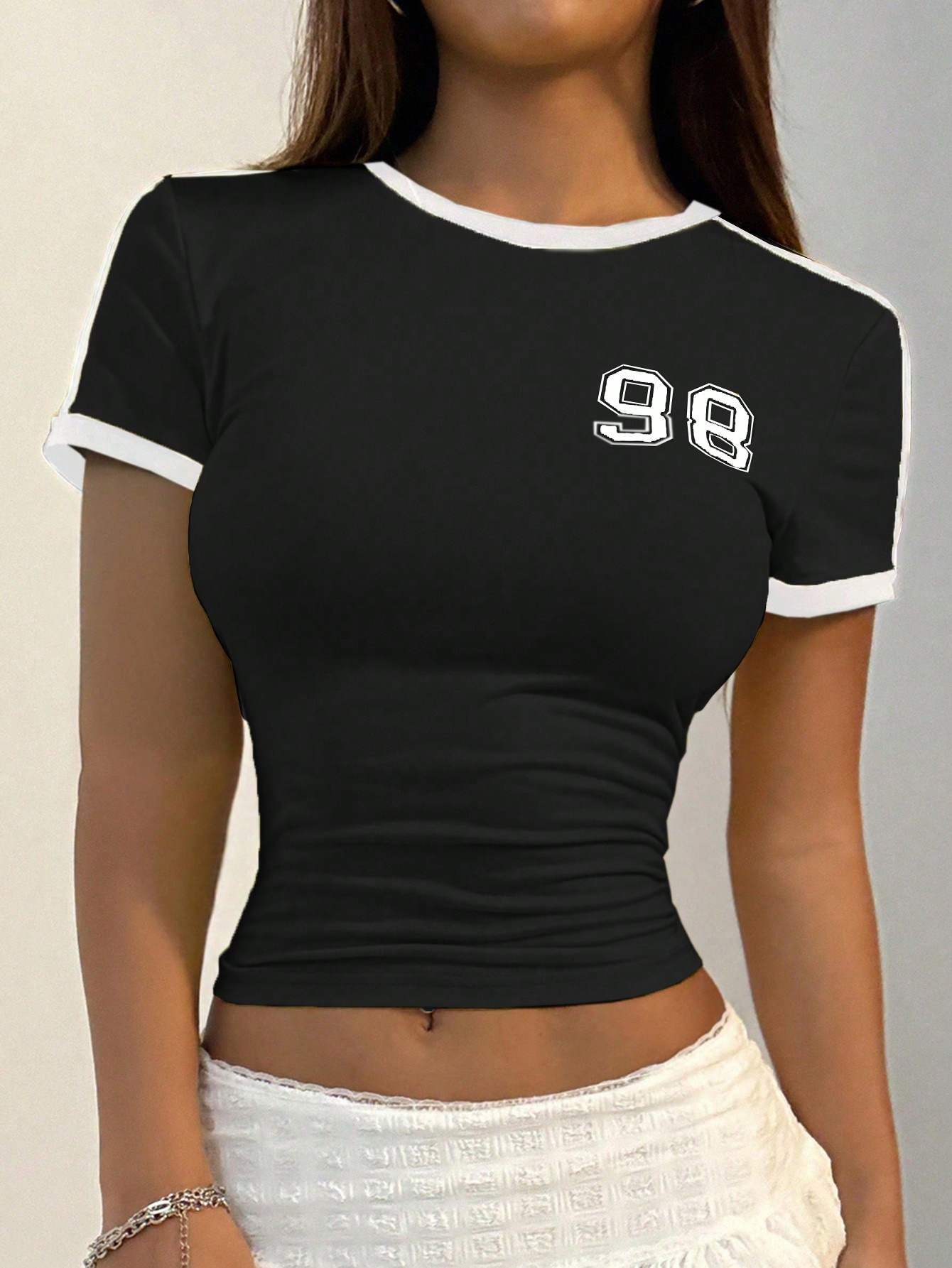 미국의 새로운 스파이스 걸스 여성 라운드 넥 디지털 98 인쇄 된 배꼽 짧은 소매 풀오버 국경 도매 탑 티셔츠스토어 가기