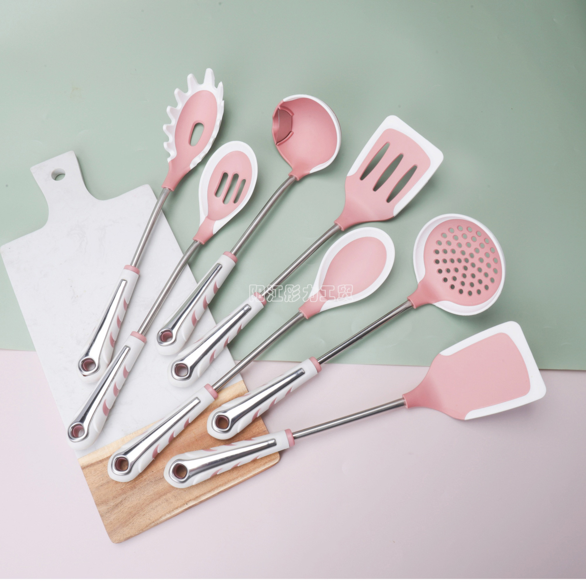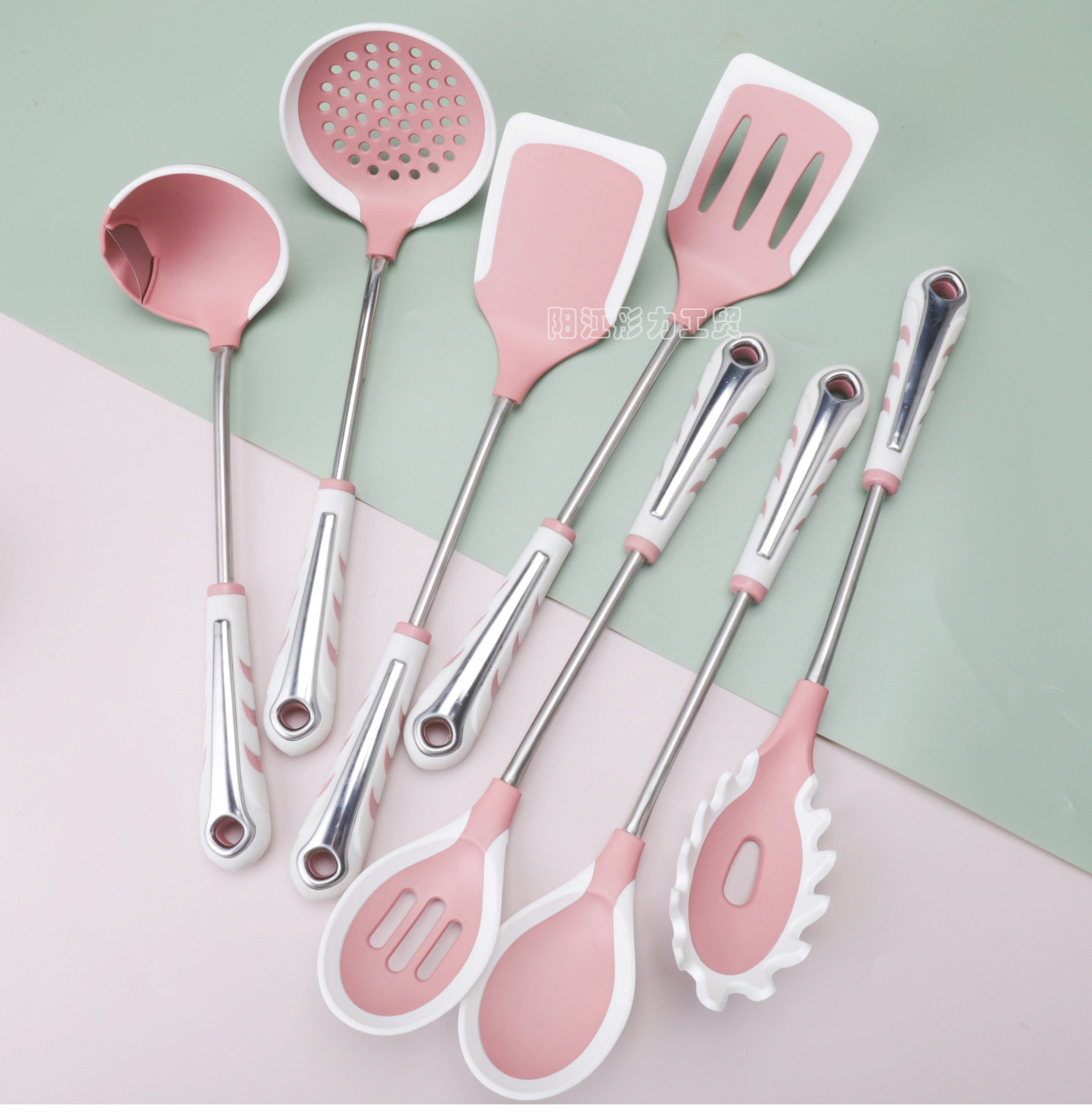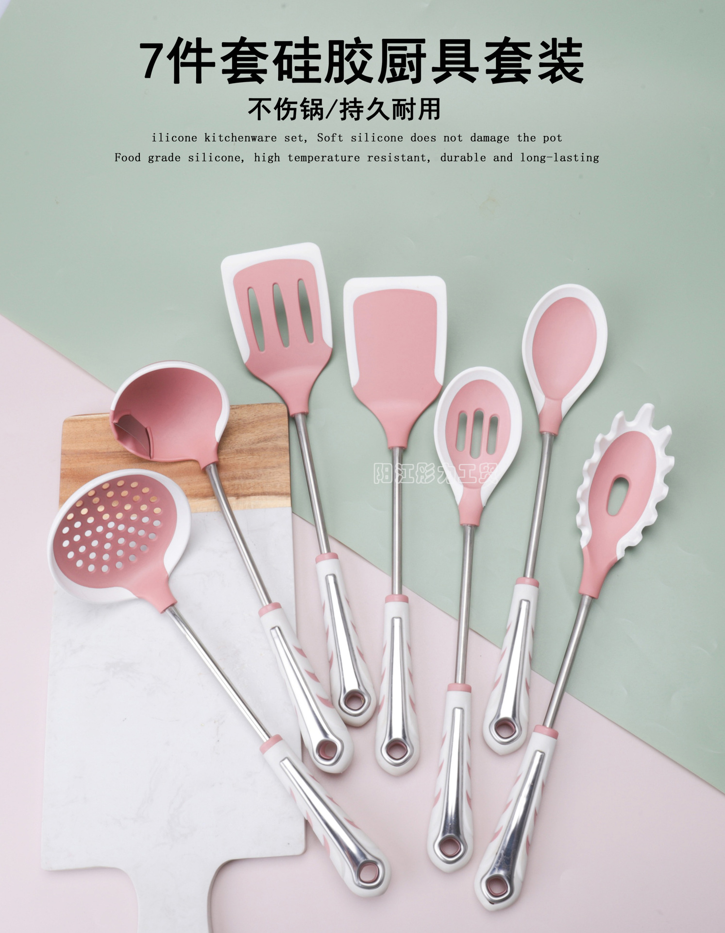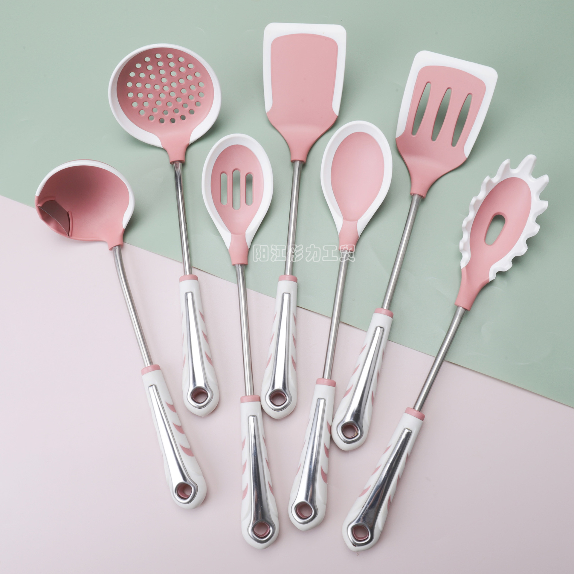 액체 실리콘 나무 손잡이 실리콘 주방용품 세트 비 스틱 팬 요리 숟가락과 삽 7 조각 세트 주방 도구 공장