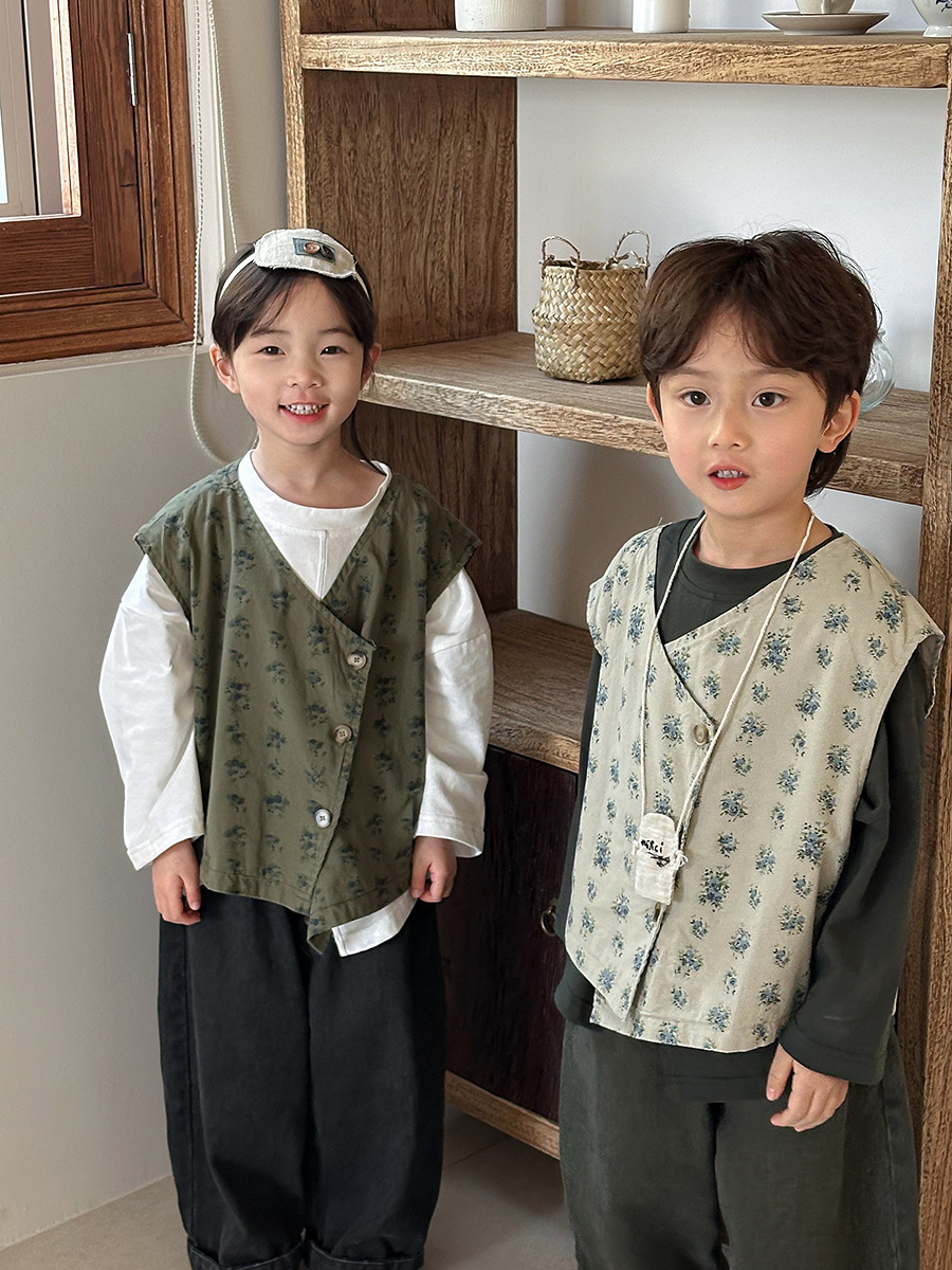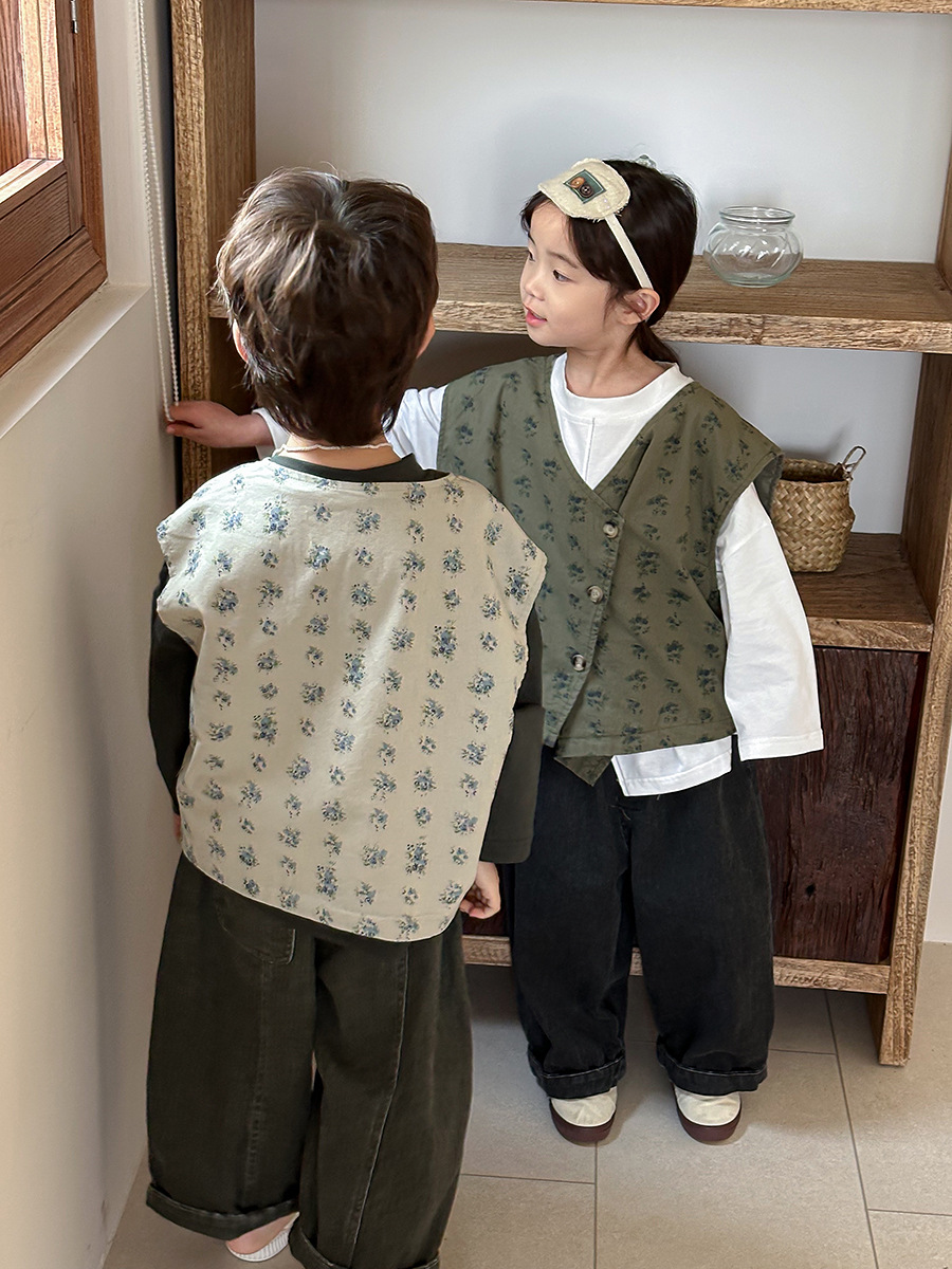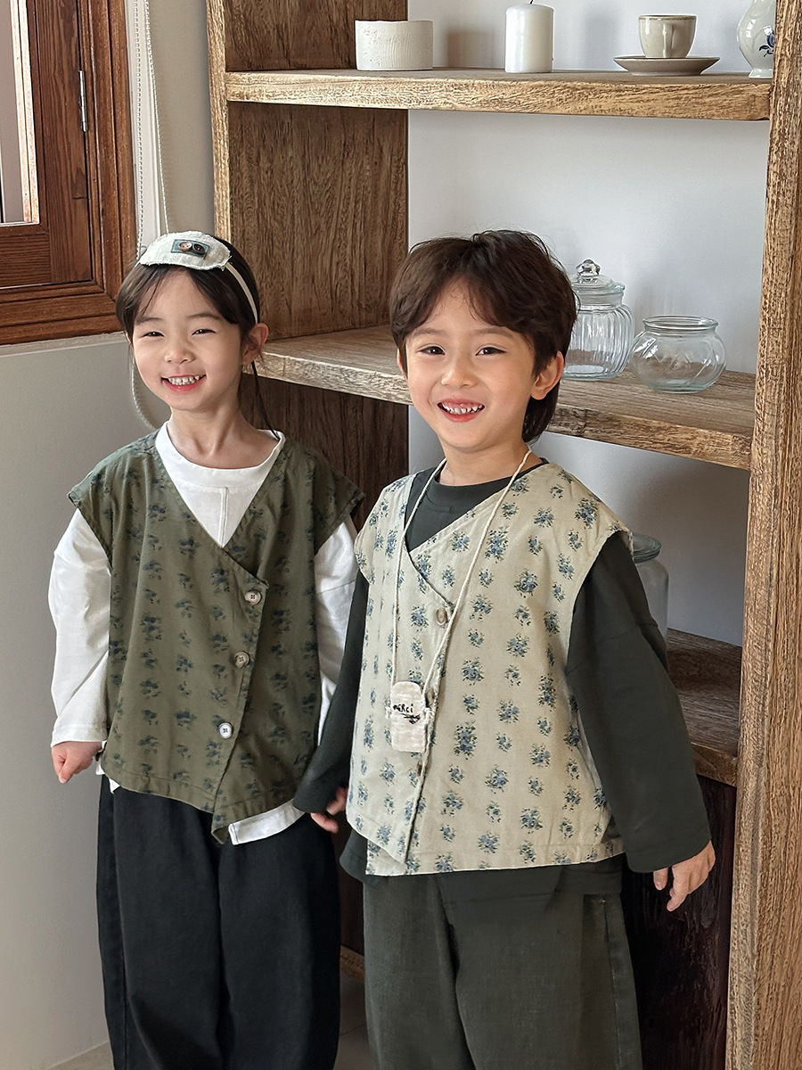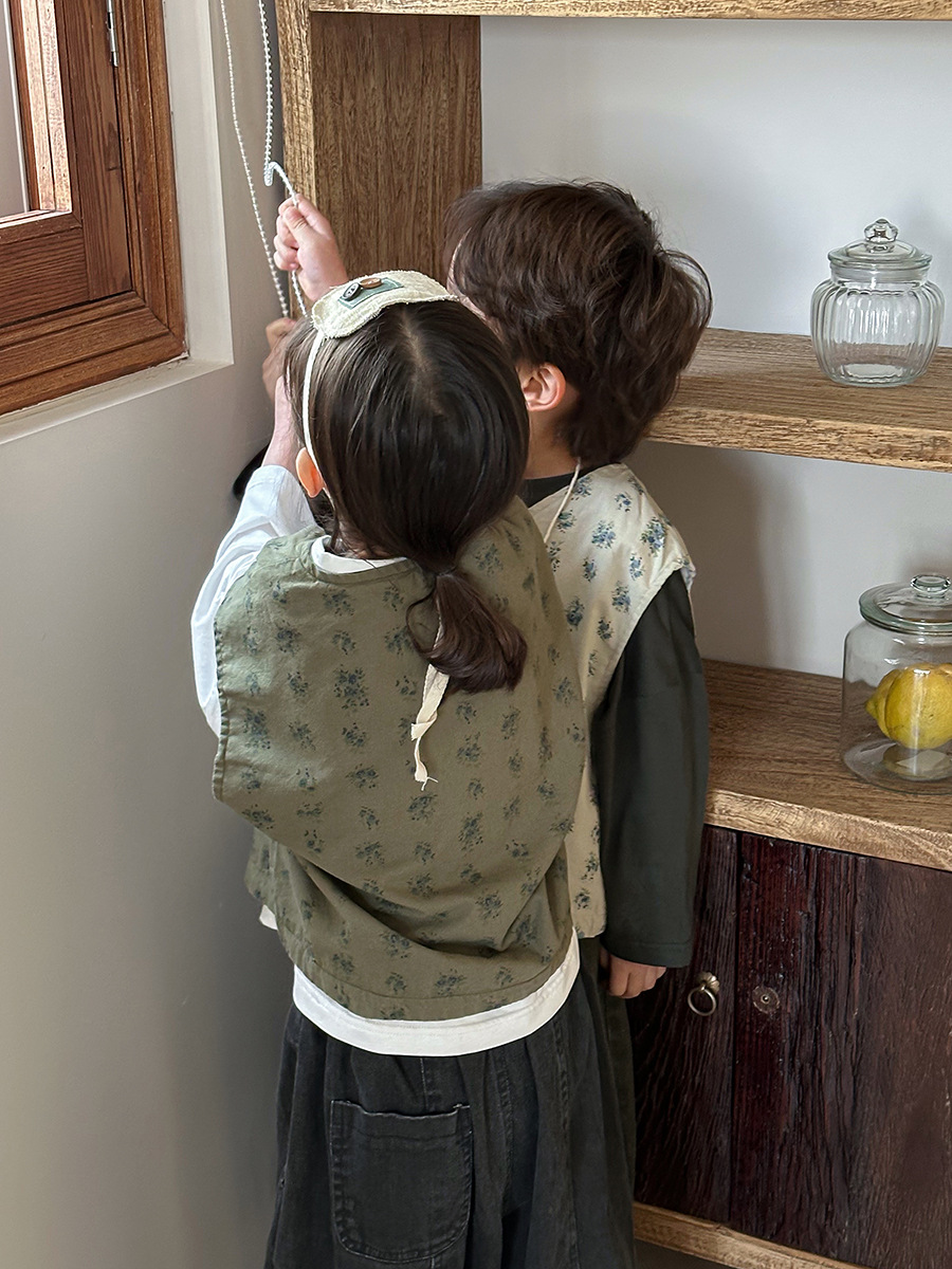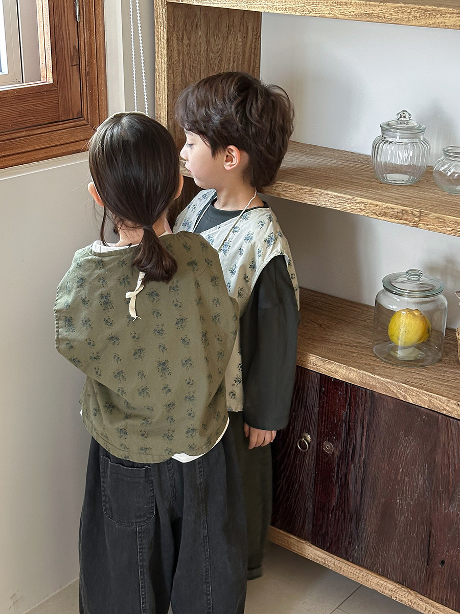 Jiaye 어린이 제품 2025 어린이 가을 새로운 꽃 조끼 남성과 여성 베이비 포레스트 스타일 복고풍 조끼 재킷