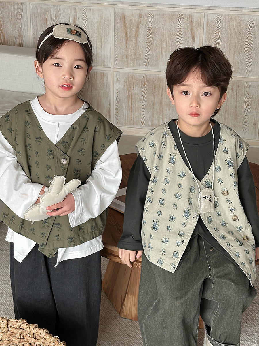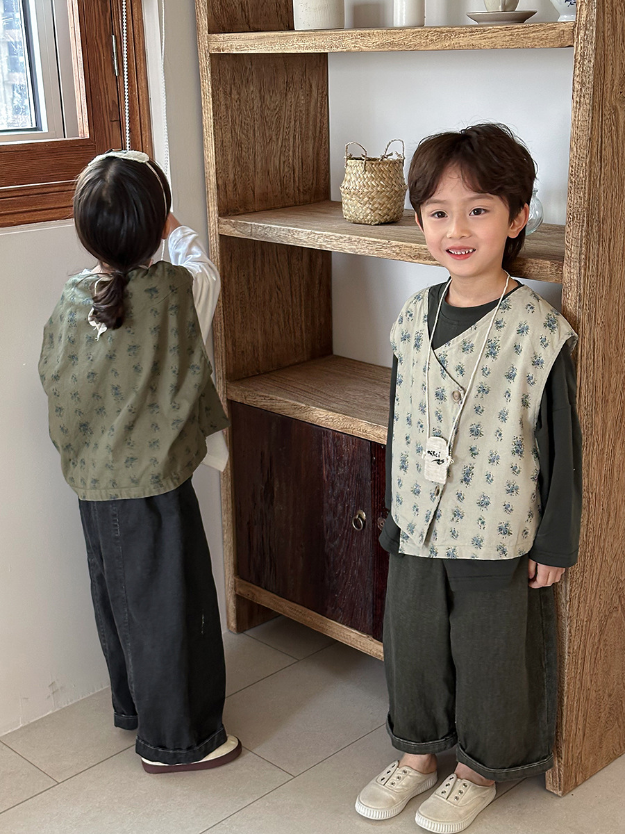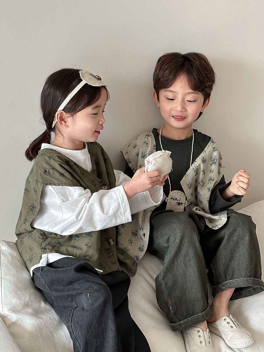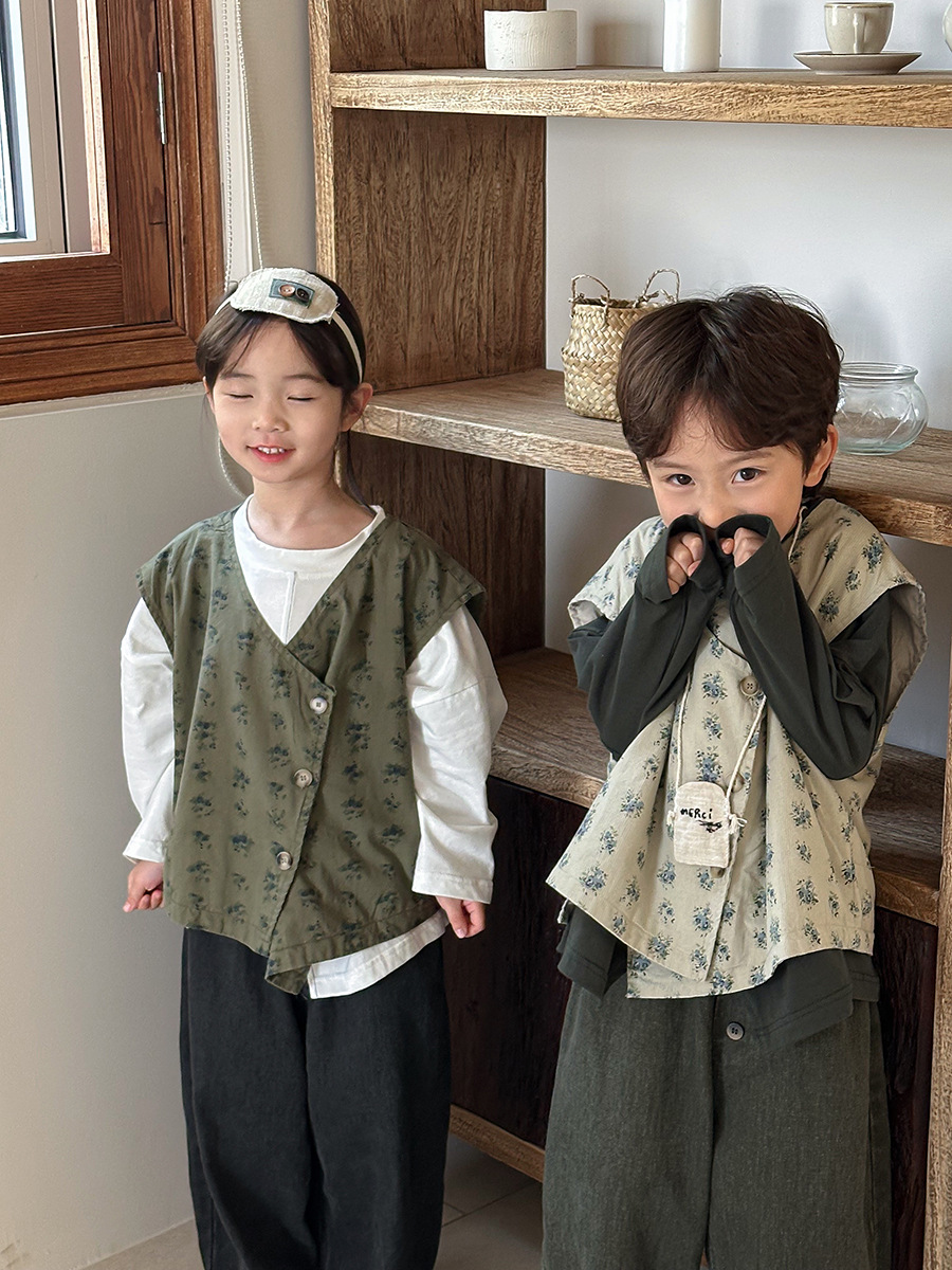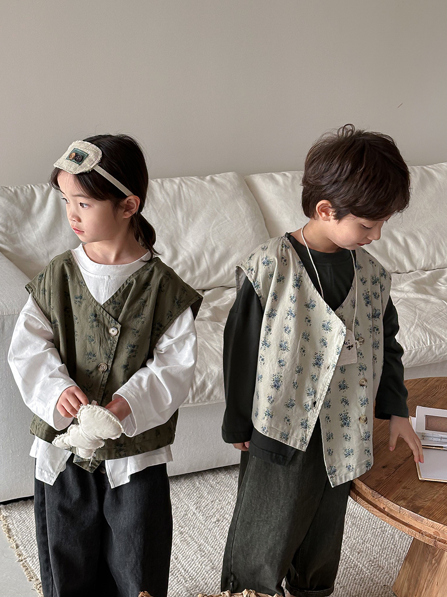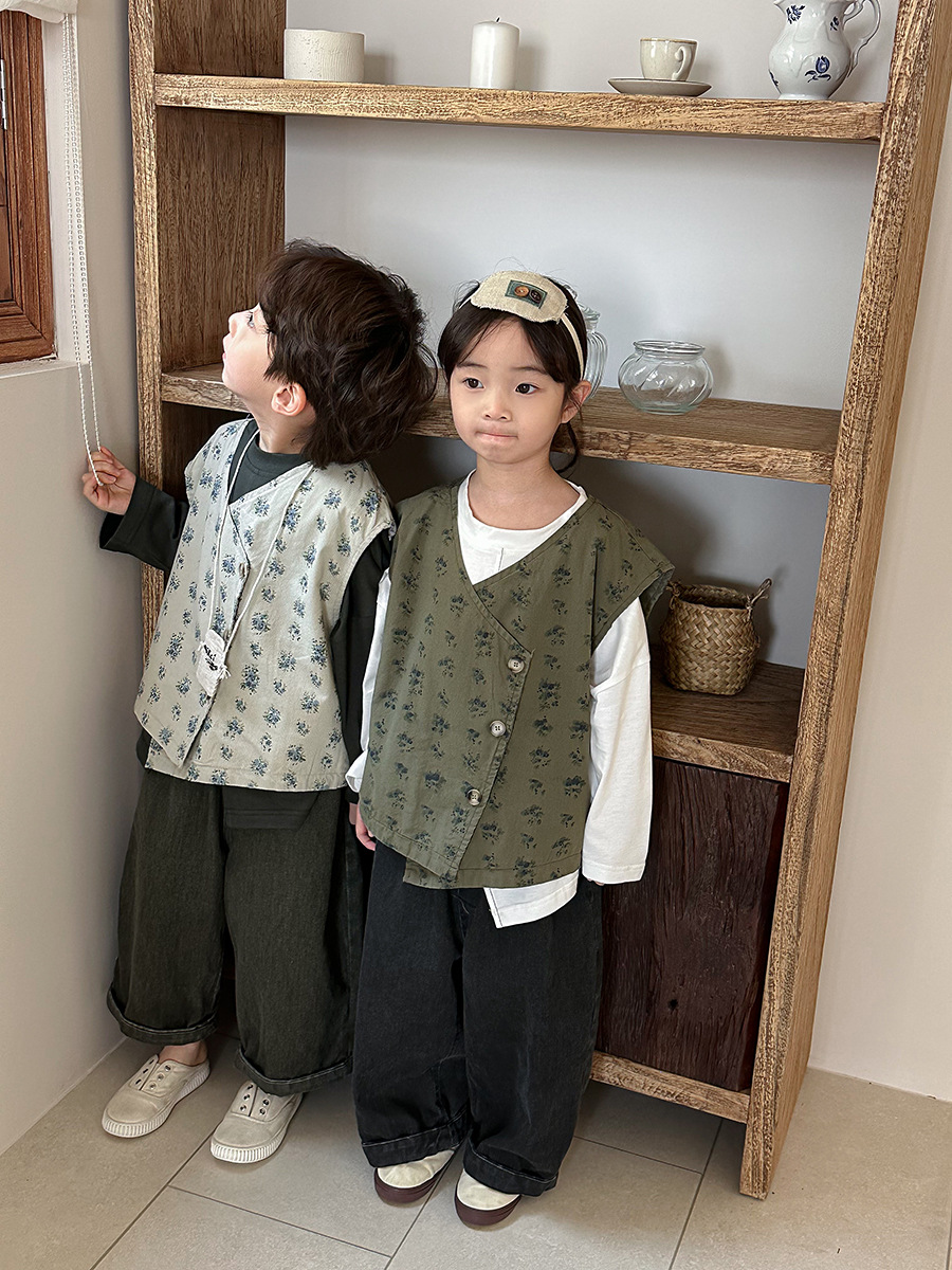 Jiaye 어린이 제품 2025 어린이 가을 새로운 꽃 조끼 남성과 여성 베이비 포레스트 스타일 복고풍 조끼 재킷