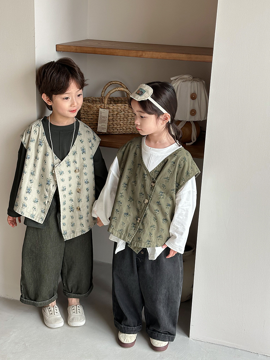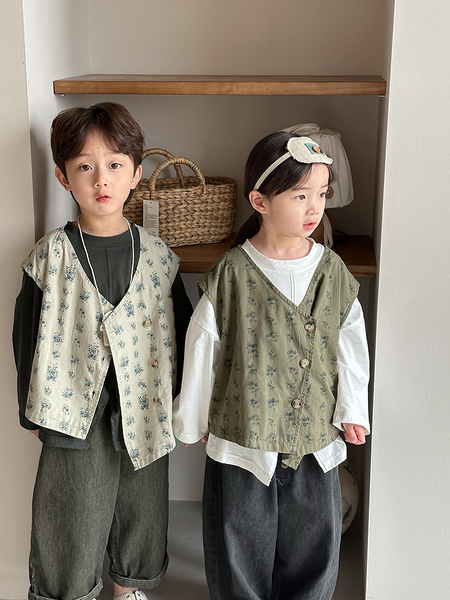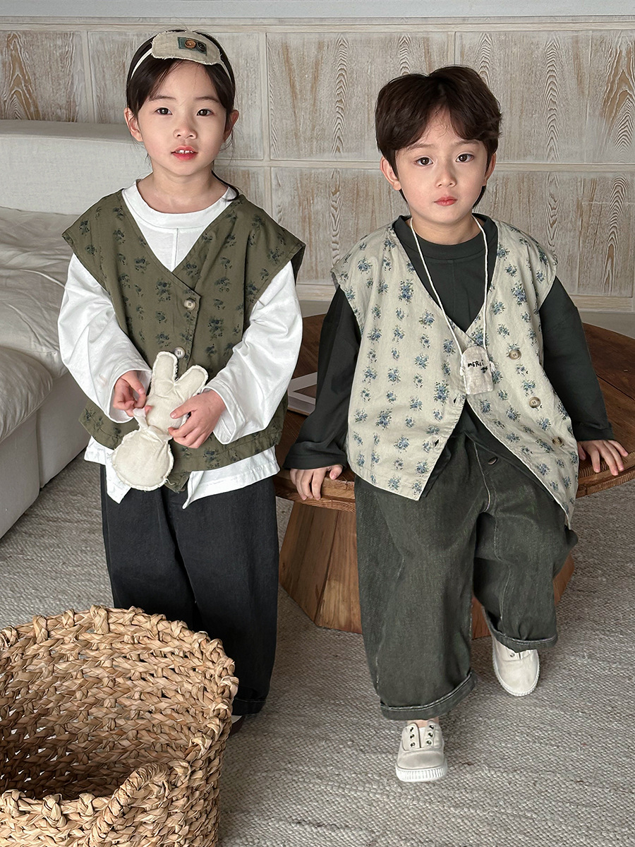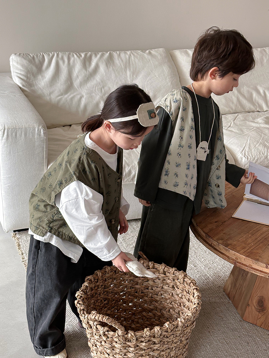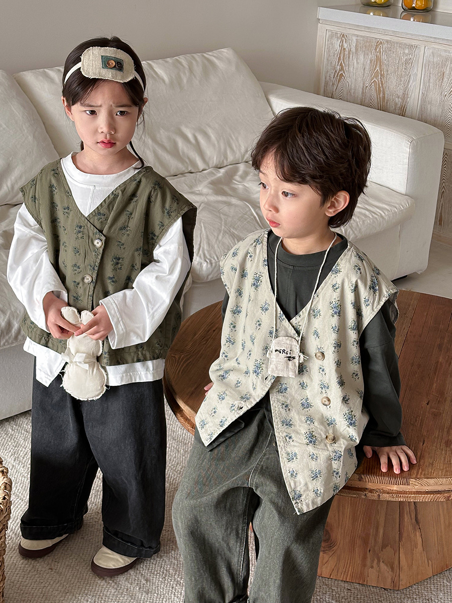 Jiaye 어린이 제품 2025 어린이 가을 새로운 꽃 조끼 남성과 여성 베이비 포레스트 스타일 복고풍 조끼 재킷