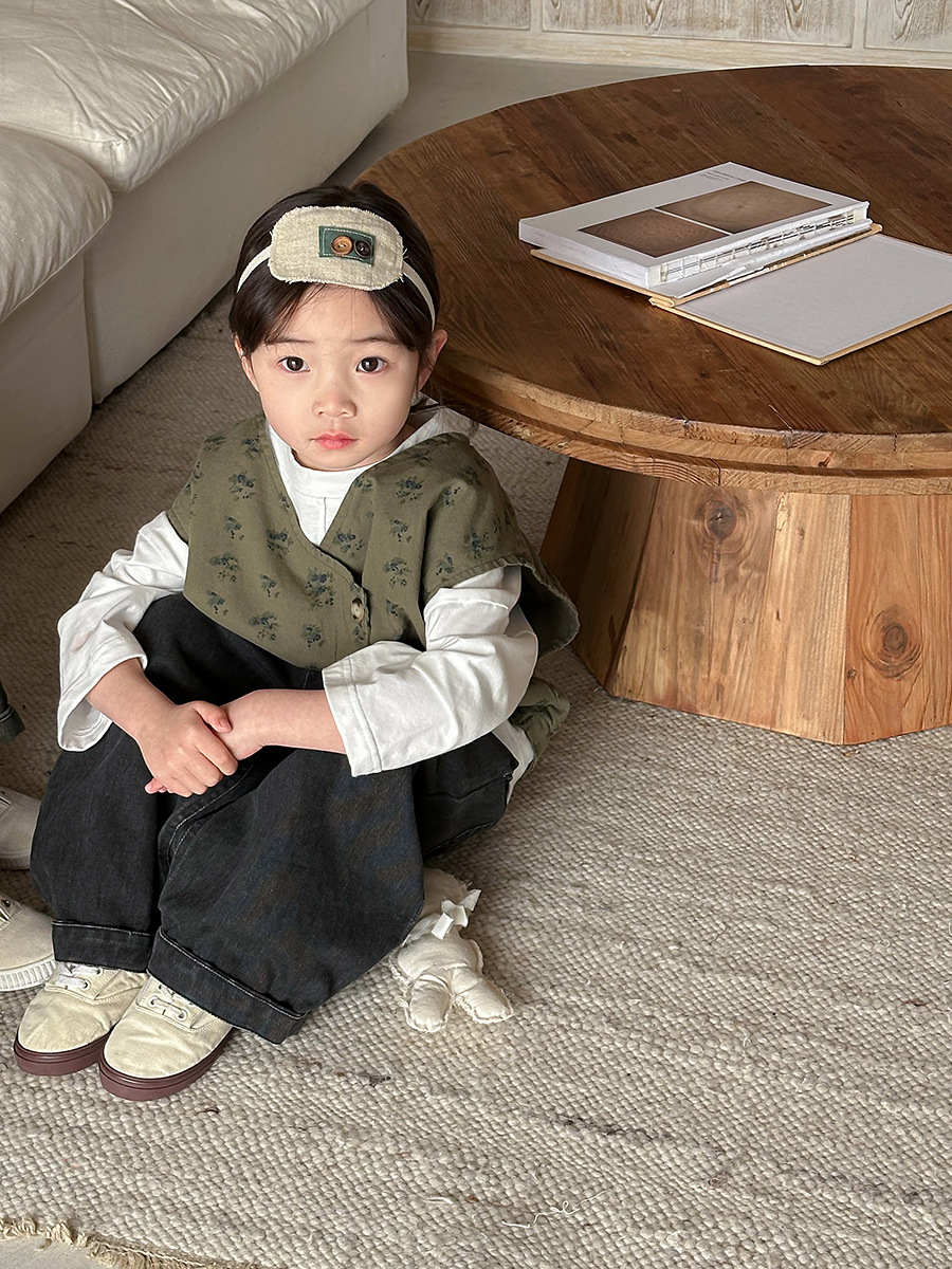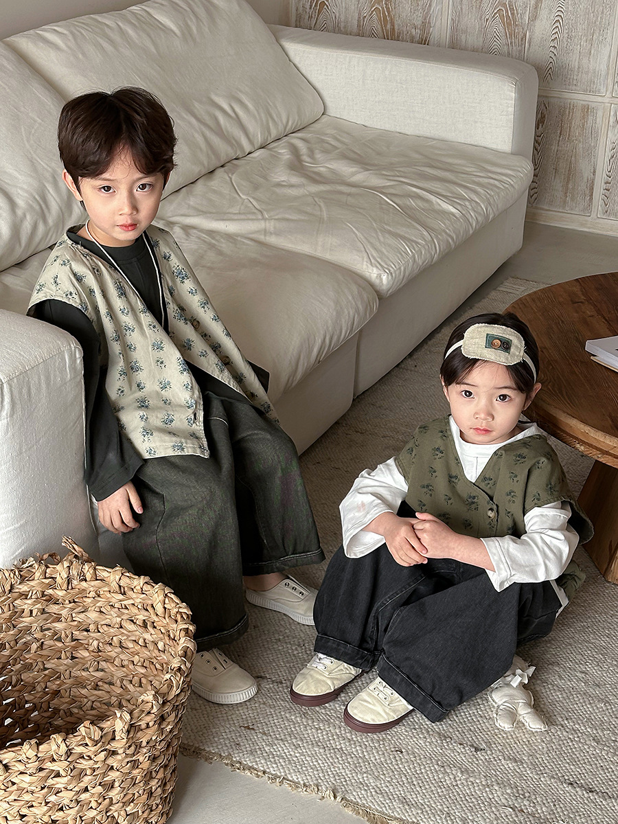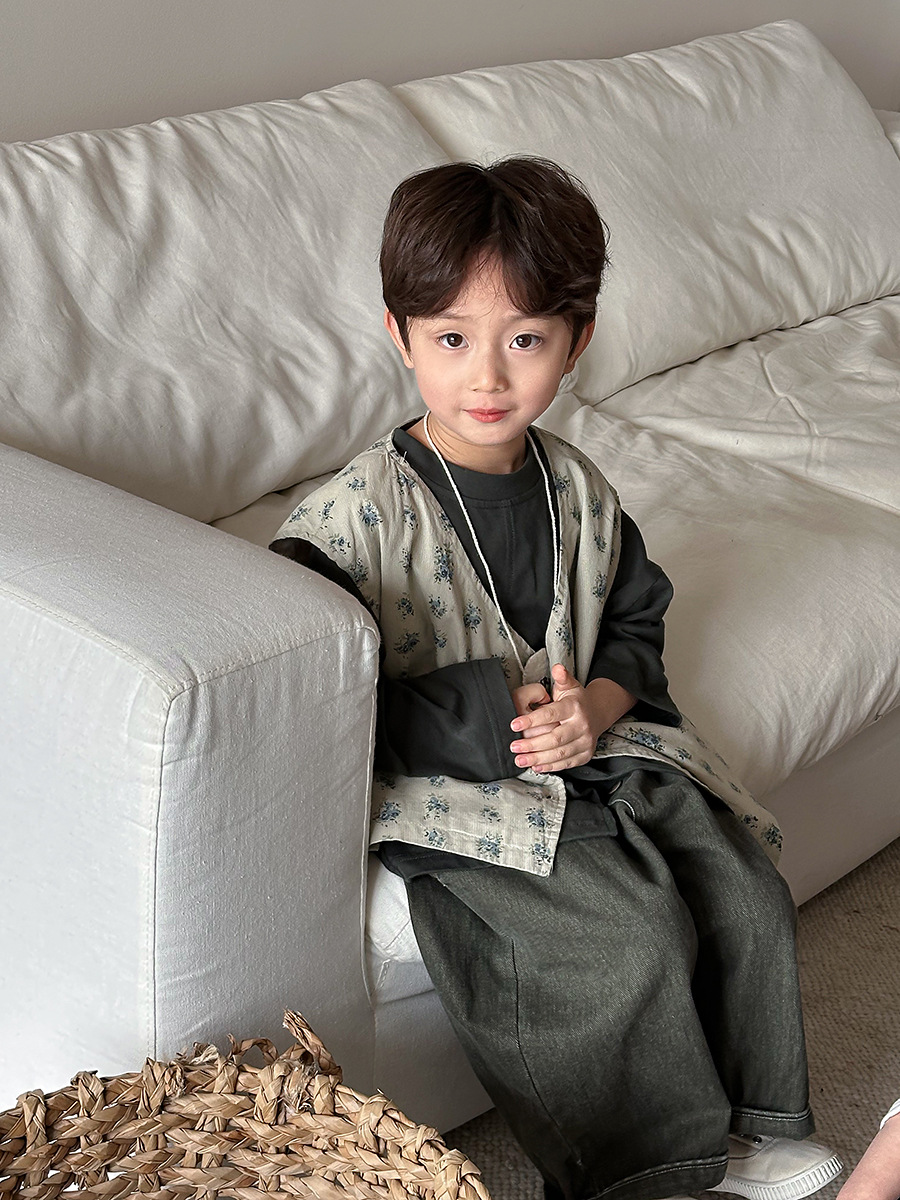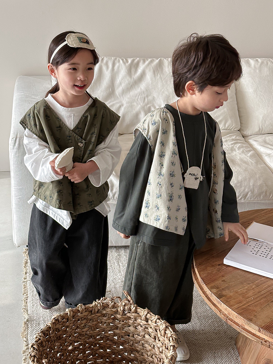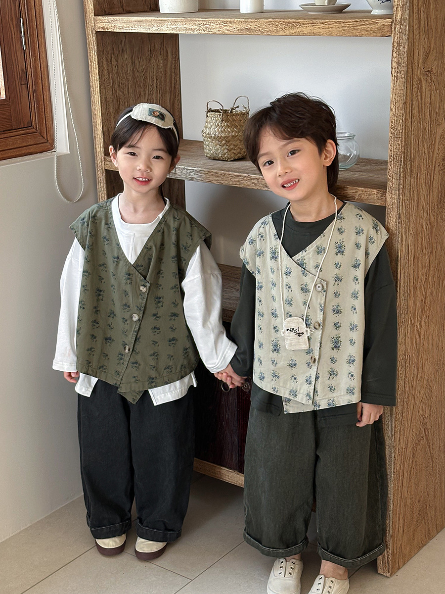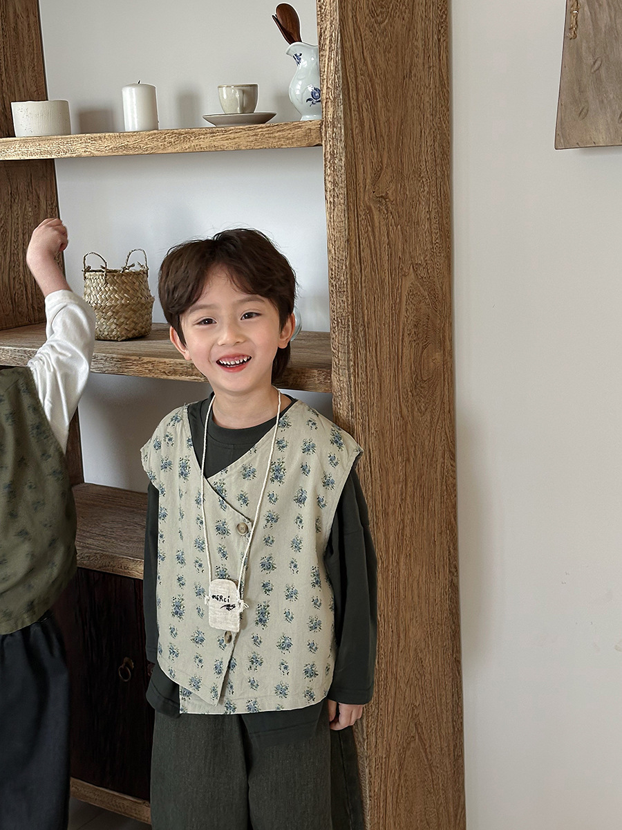 Jiaye 어린이 제품 2025 어린이 가을 새로운 꽃 조끼 남성과 여성 베이비 포레스트 스타일 복고풍 조끼 재킷