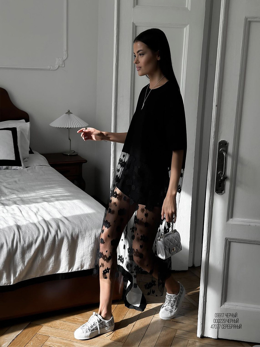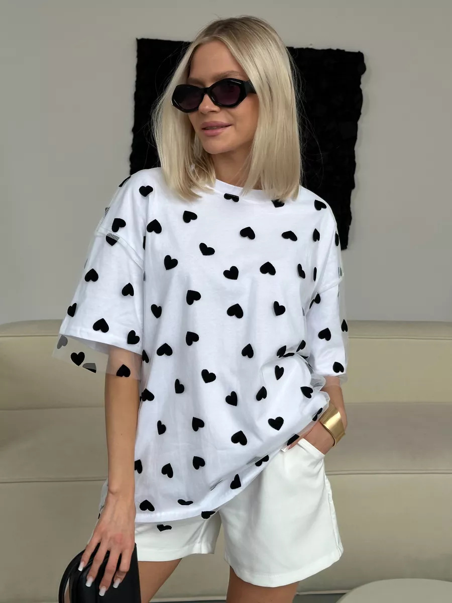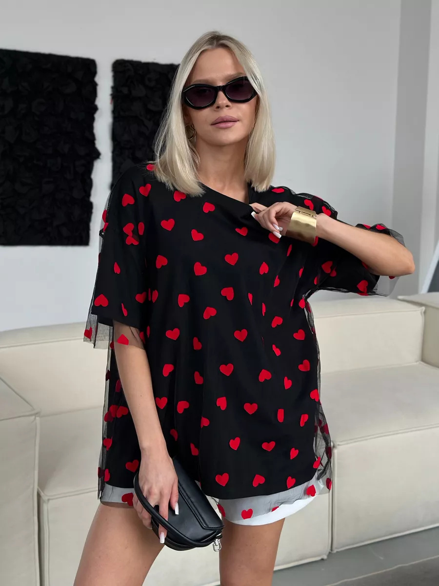 2026년 신상 유럽 및 미국 스타일 섹시 여성복 롱 러브 하트 메쉬 패치워크 루즈핏 반팔 티셔츠 원피스스토어 가기