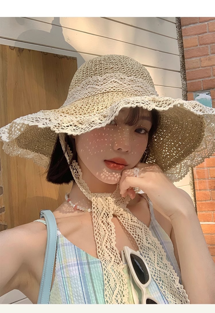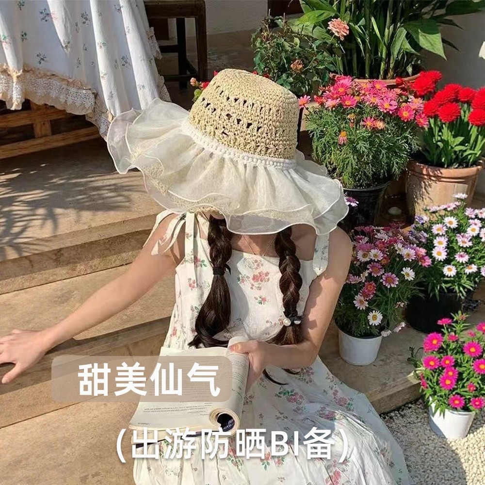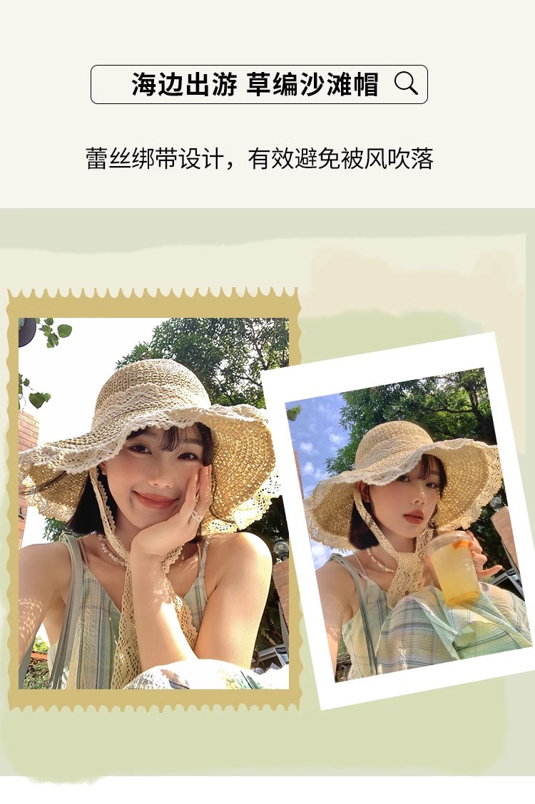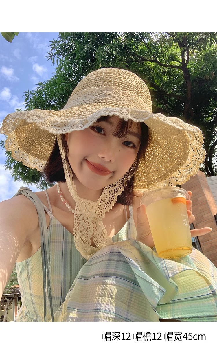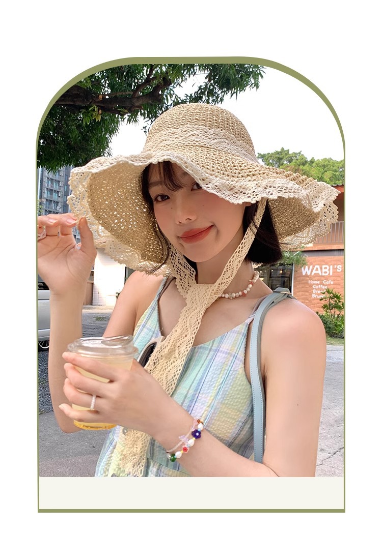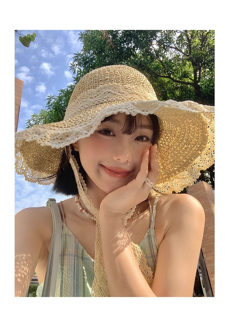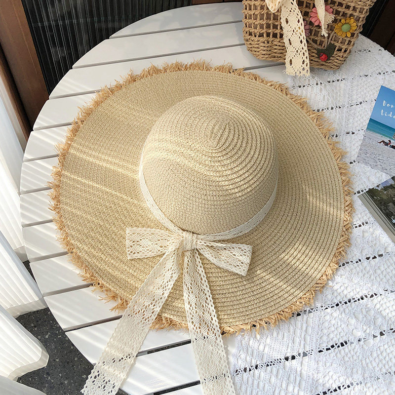 여성용 여름 자외선 차단 밀짚모자, 인스 스타일 끈 장식 라피아 밀짚모자, 여행, 휴가, 해변용 햇빛 가리개 모자스토어 가기
