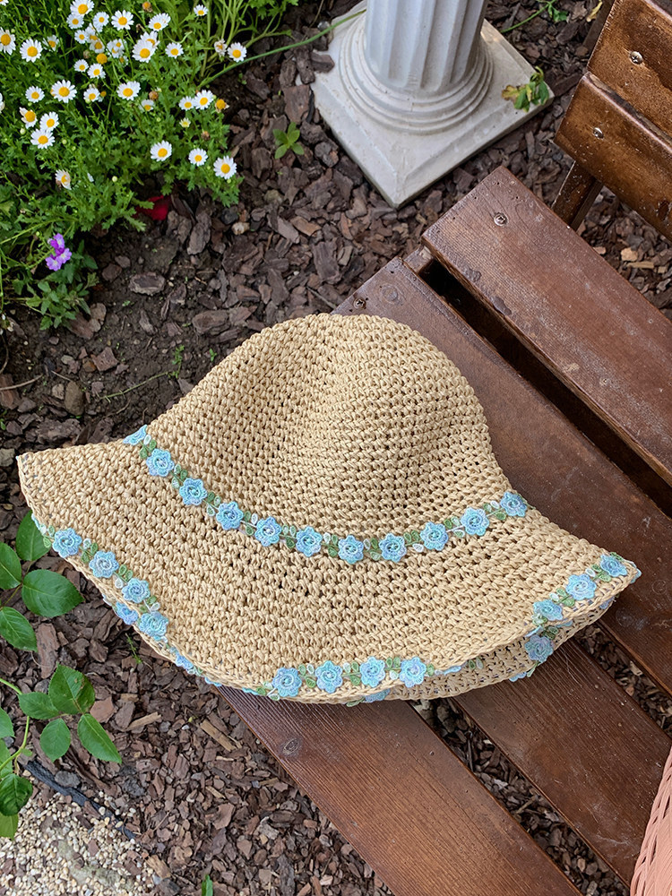 • 작은 꽃 밀짚모자 - 베이지색 파란색 꽃