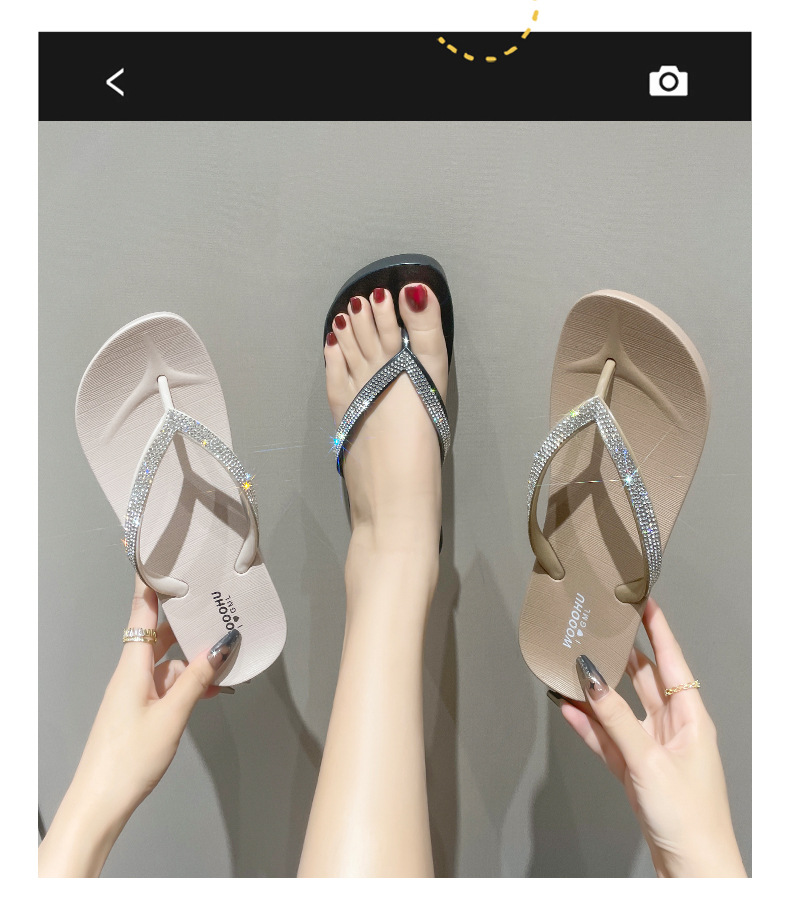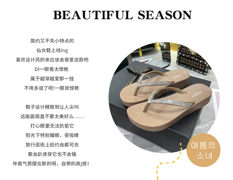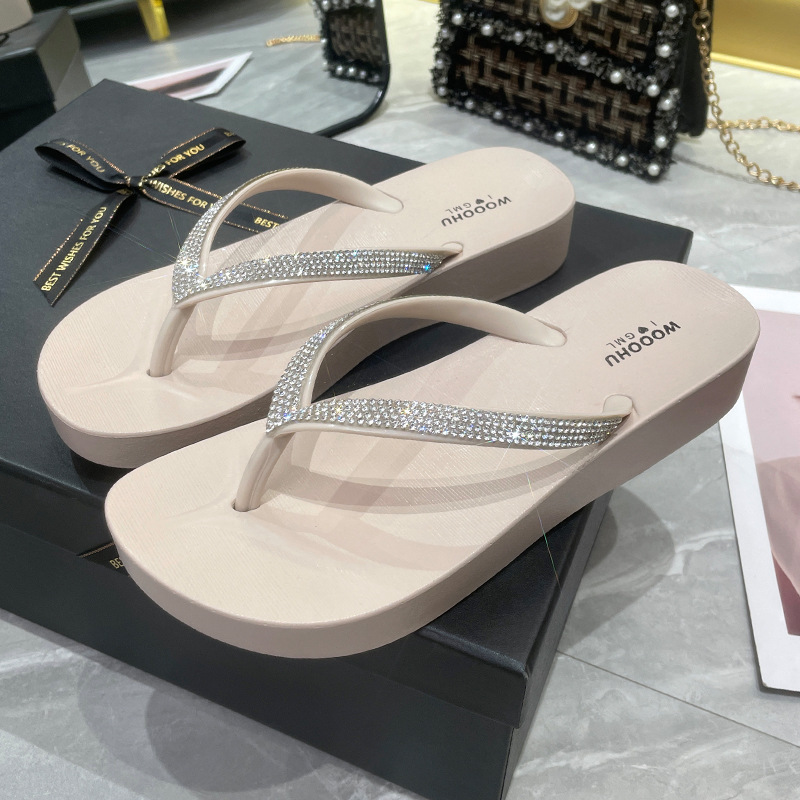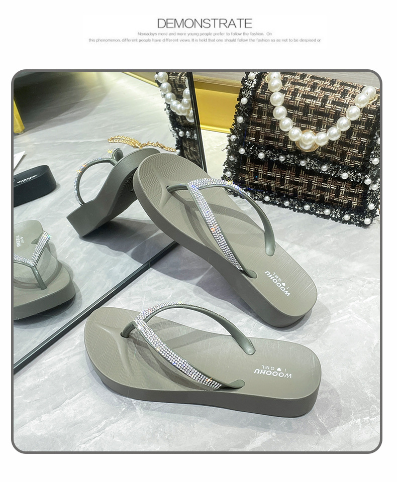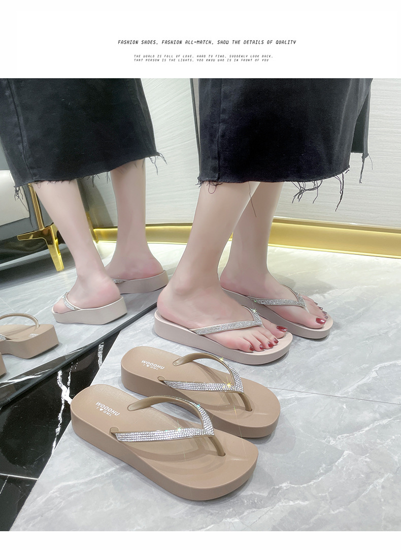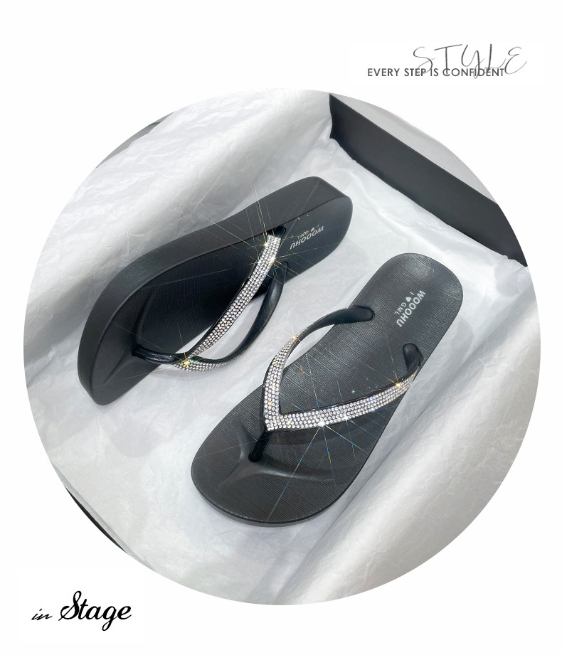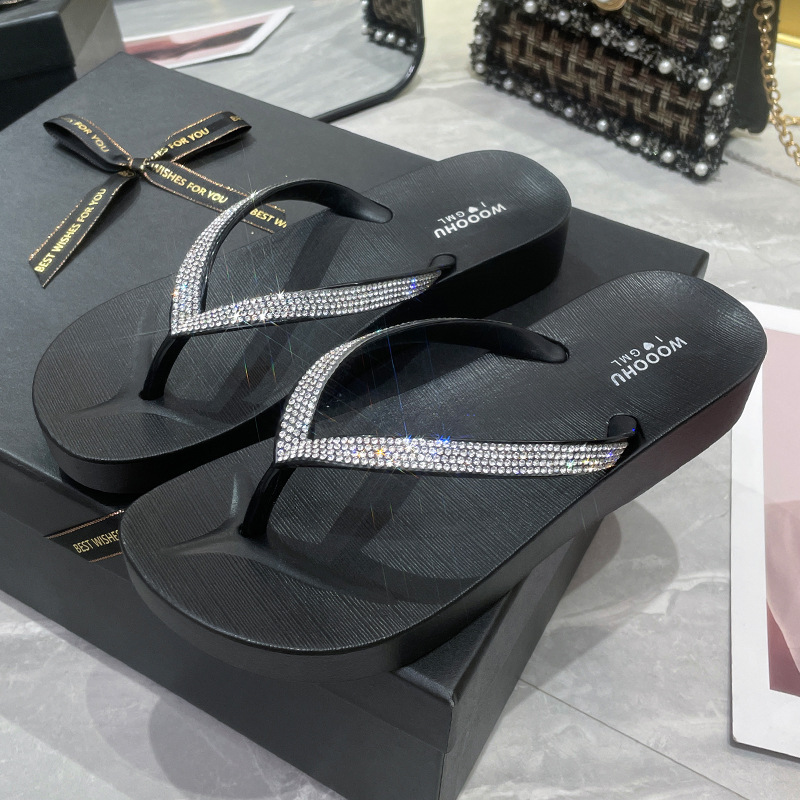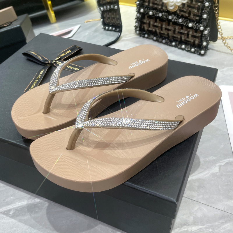 Gao Meilun 여름 여자 라인 스톤 브라이트 다이아몬드 플립 플롭스 트렌디 한 비치 아우터 미들 힐 미끄럼 세척 올 매치 크로스 보더