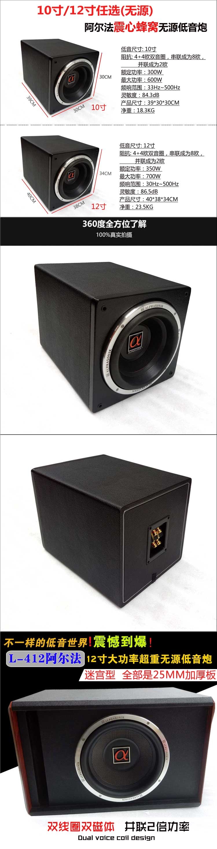 알파 자동차 오디오 수정 발열 12inch 10inch 중형 이중 보이스 코일 패시브 서브우퍼 스피커스토어 가기
