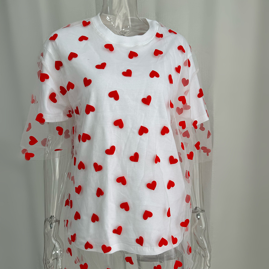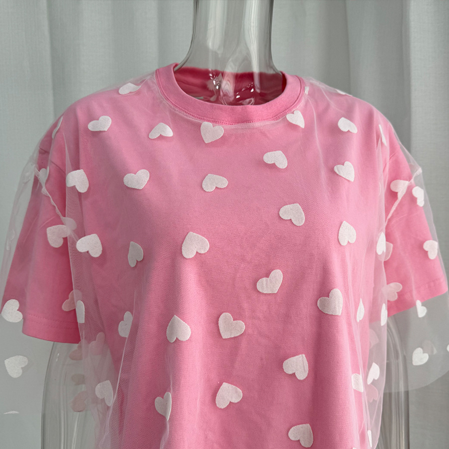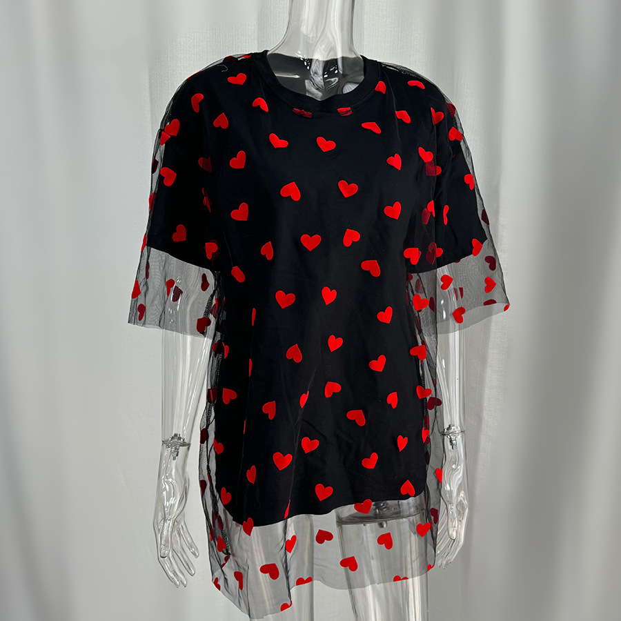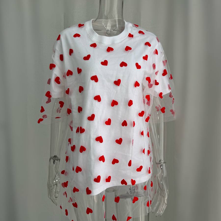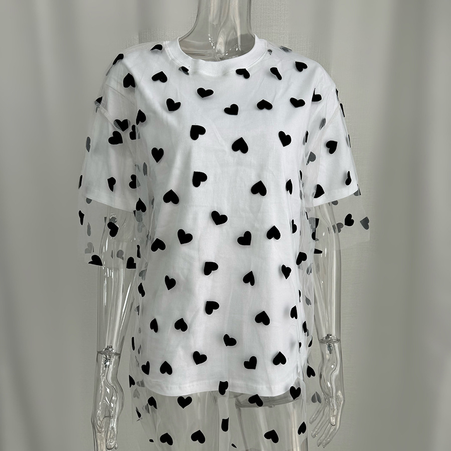 2025 새로운 국경 유럽과 미국 스타일의 섹시한 여성의 사랑 메쉬 바느질 느슨한 기본 라운드 넥 반팔 티셔츠