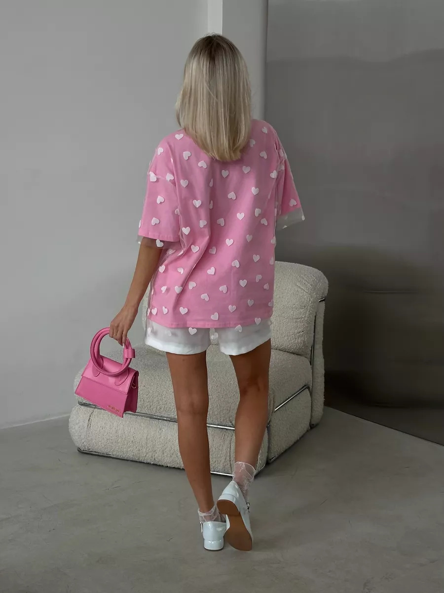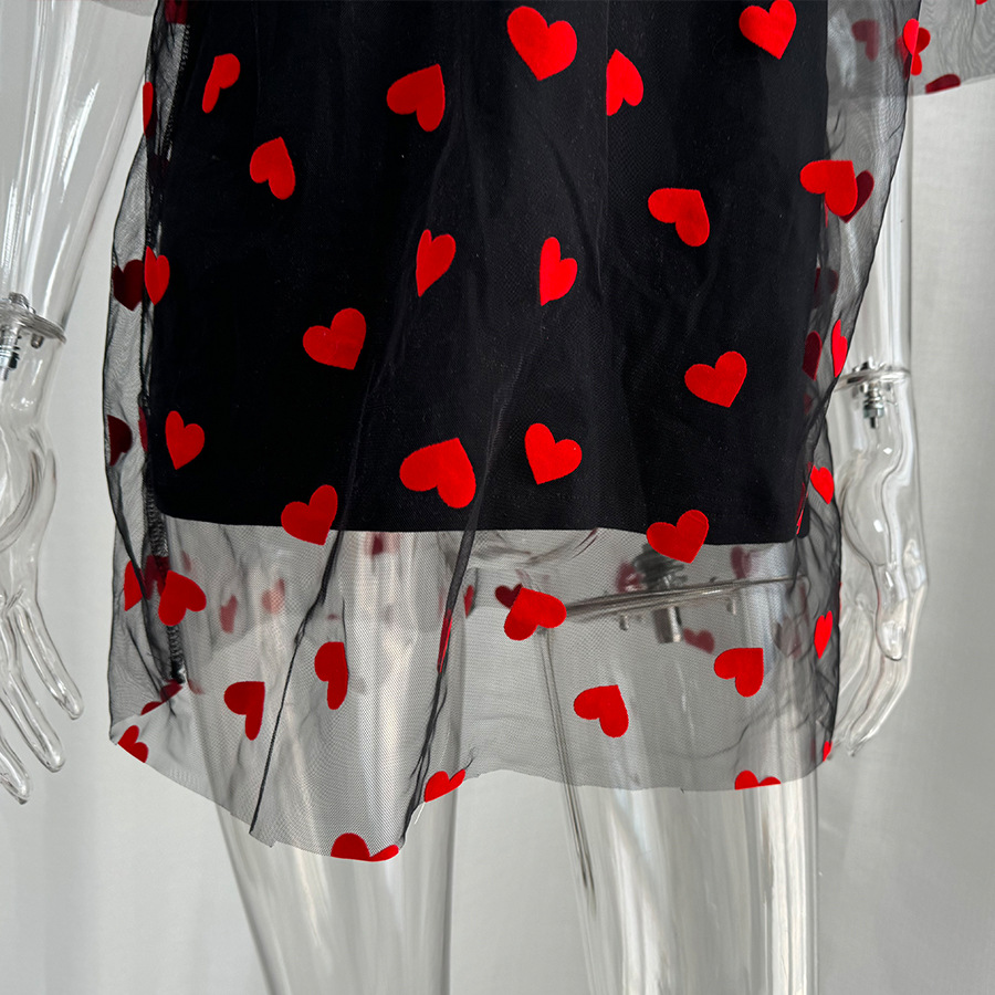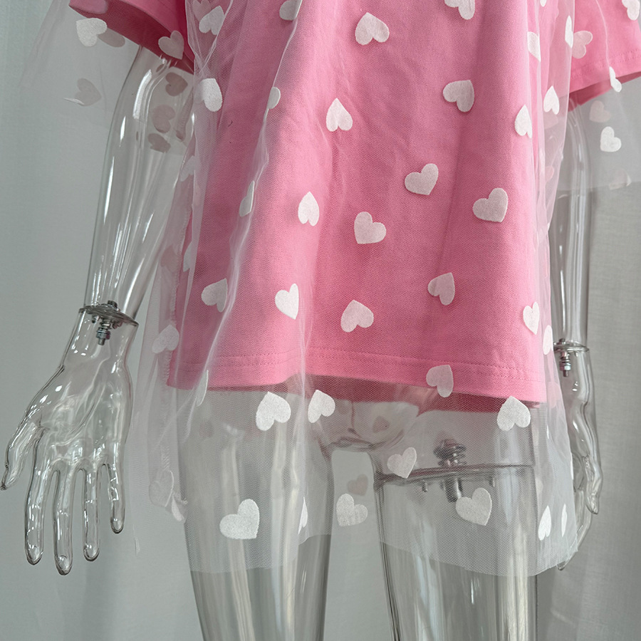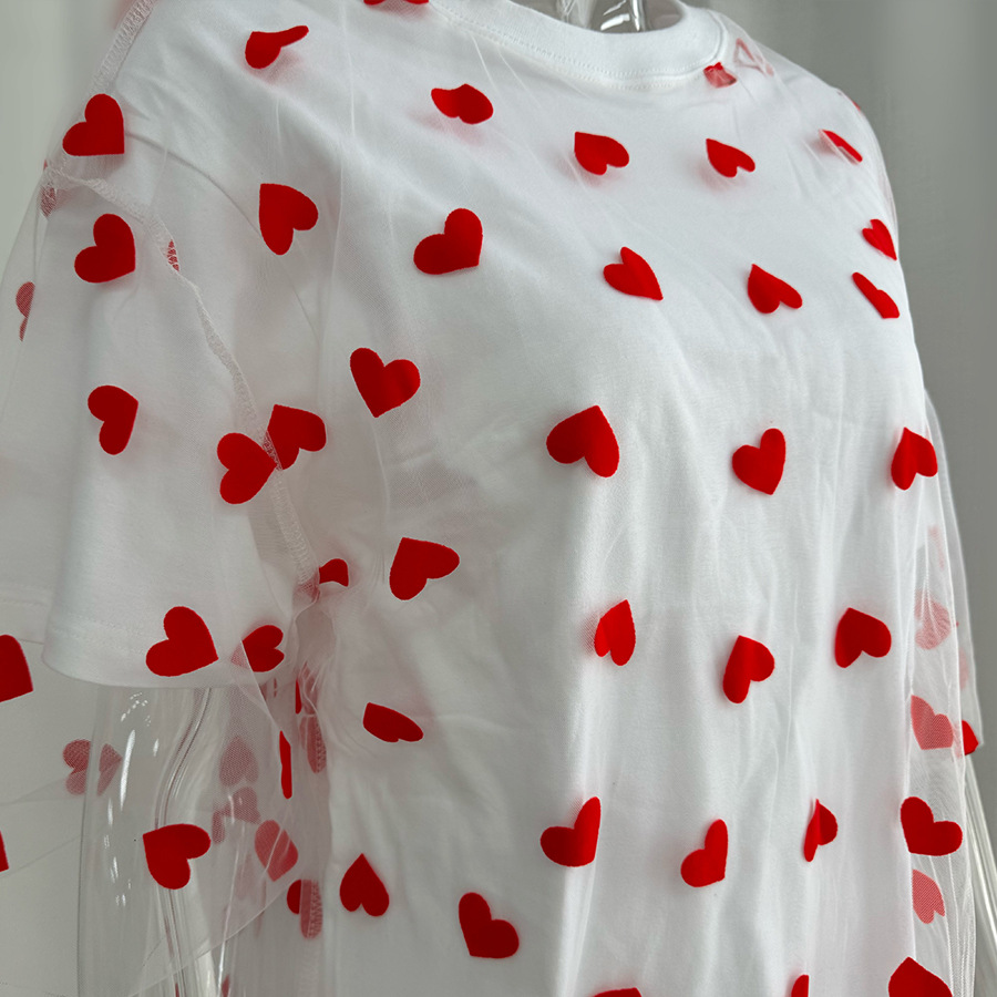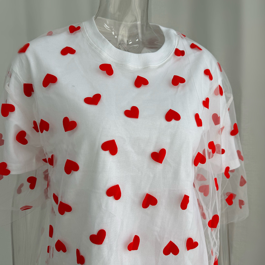2025 새로운 국경 유럽과 미국 스타일의 섹시한 여성의 사랑 메쉬 바느질 느슨한 기본 라운드 넥 반팔 티셔츠
