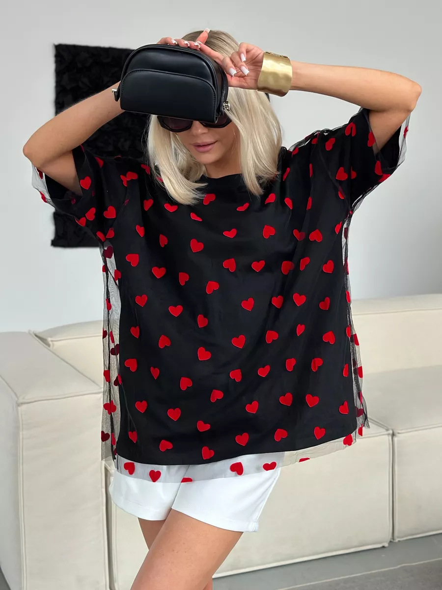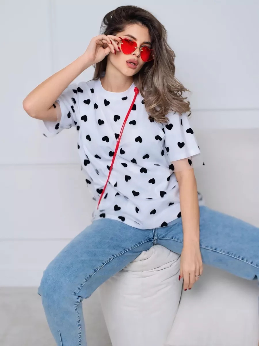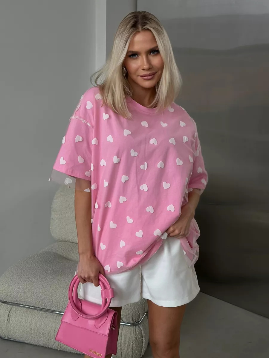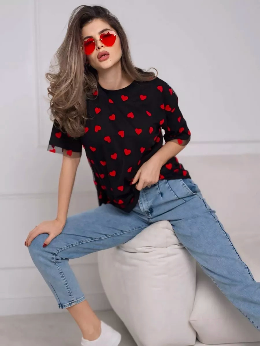 2025 새로운 국경 유럽과 미국 스타일의 섹시한 여성의 사랑 메쉬 바느질 느슨한 기본 라운드 넥 반팔 티셔츠스토어 가기