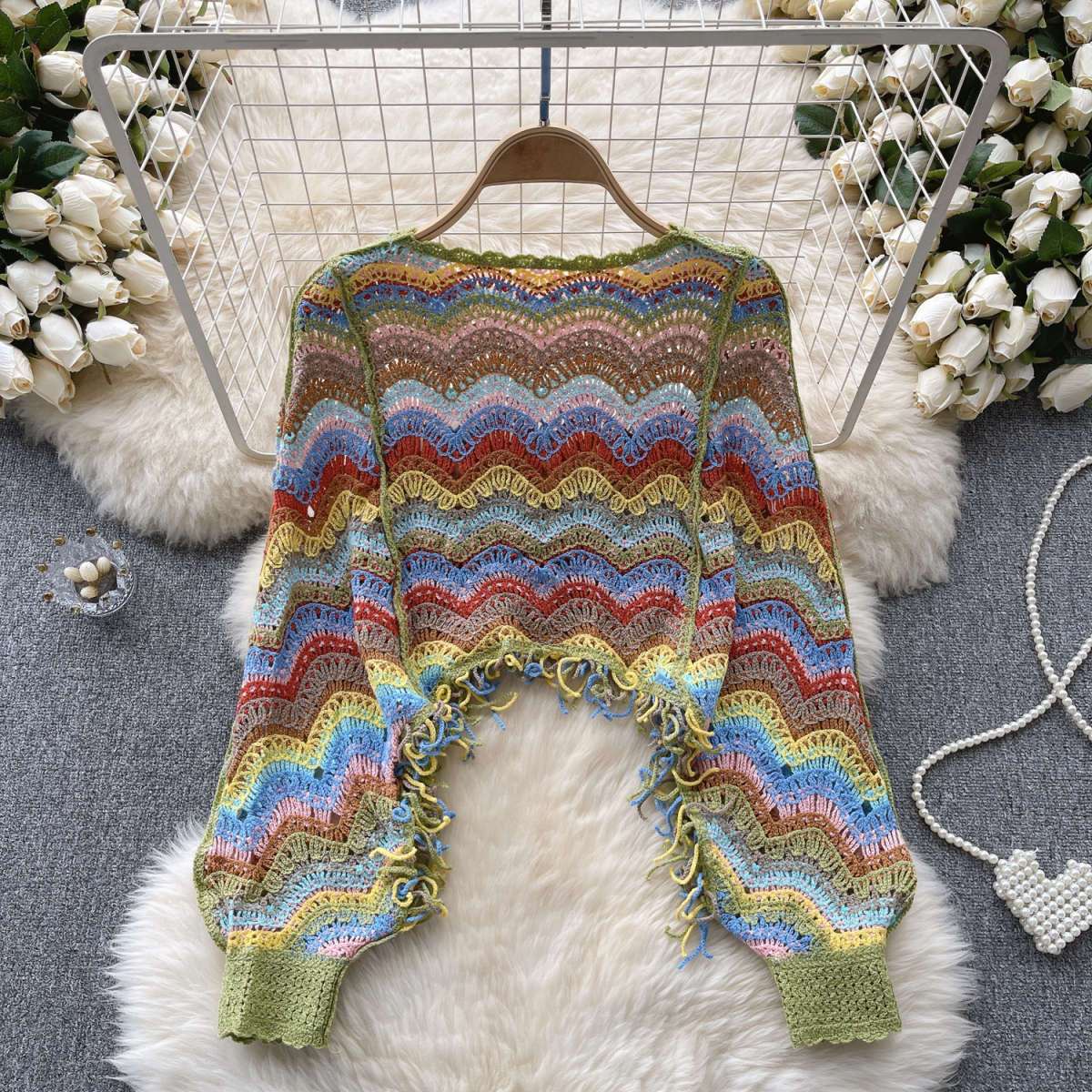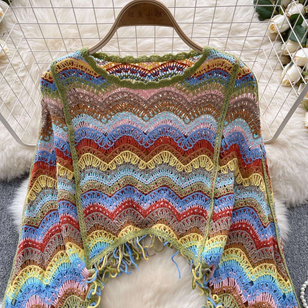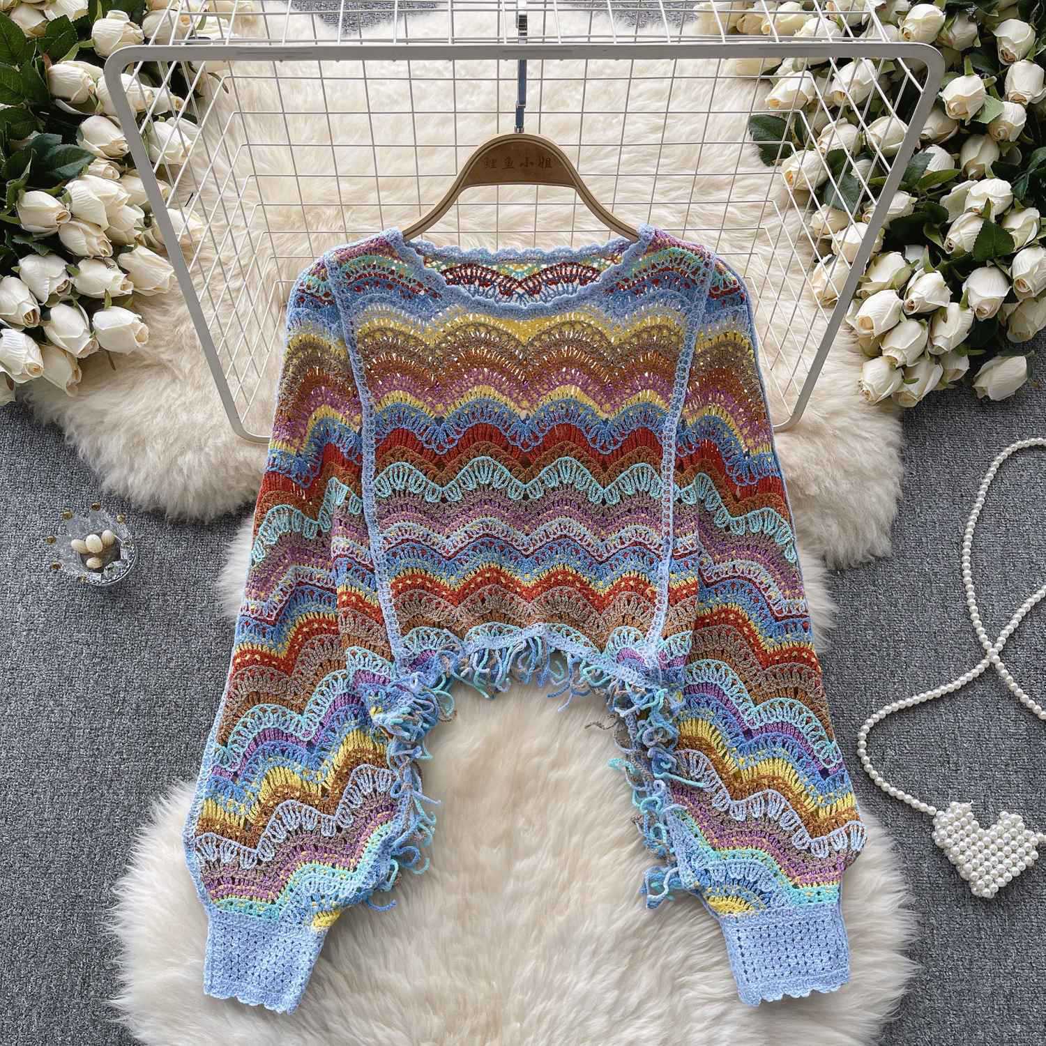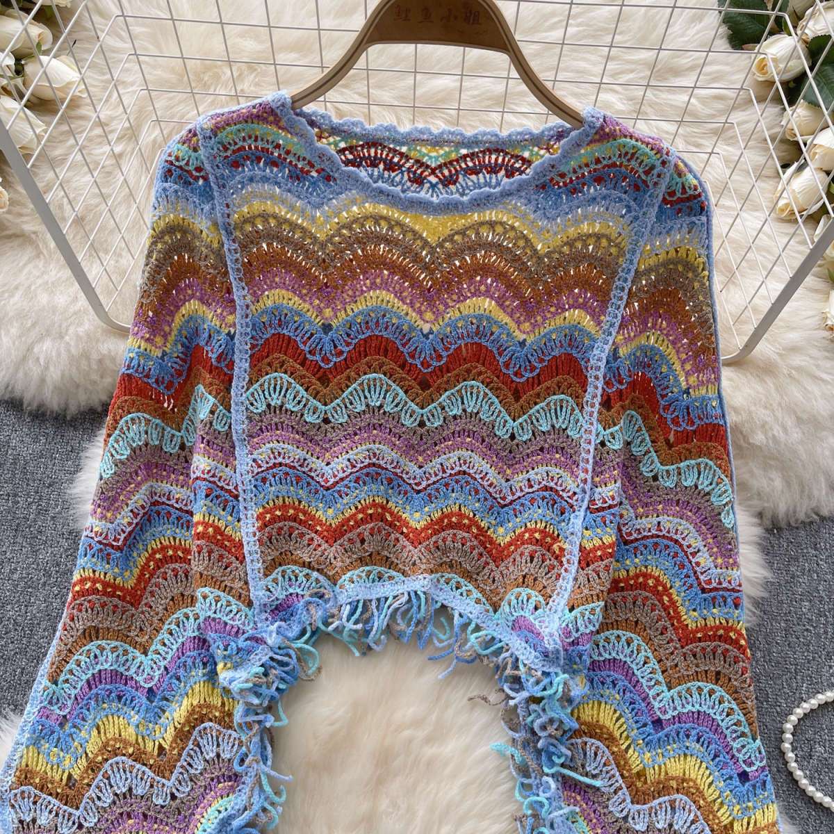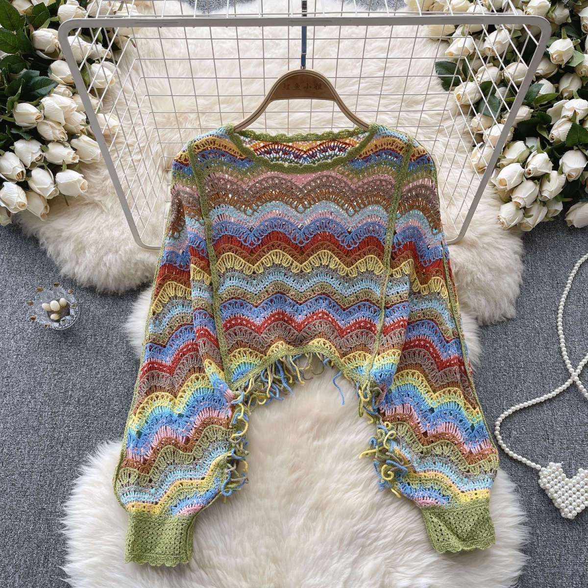 컬러풀한 컷아웃 크로셰 배트 슬리브 크롭 니트 여성 여행 휴가 스타일 긴팔 상의 컷아웃 디자인