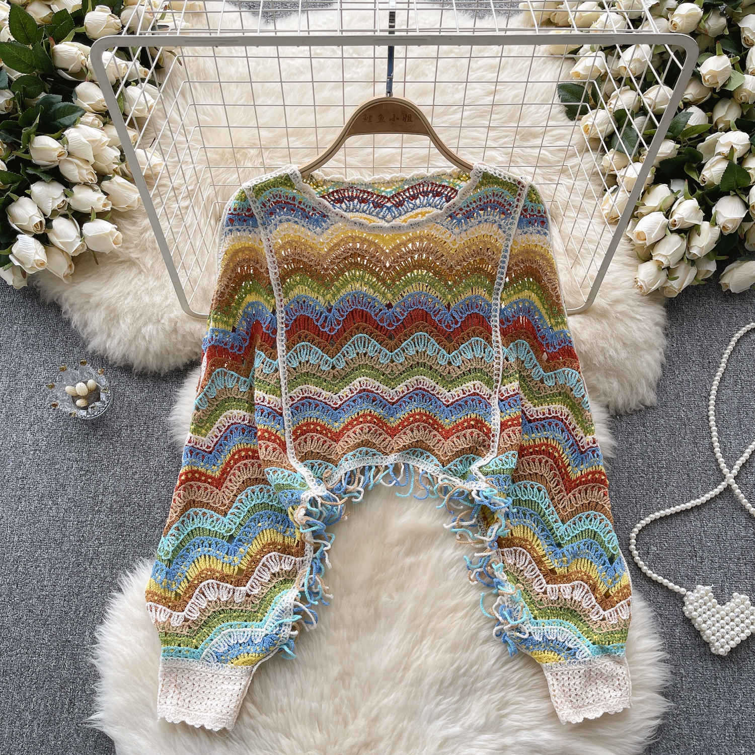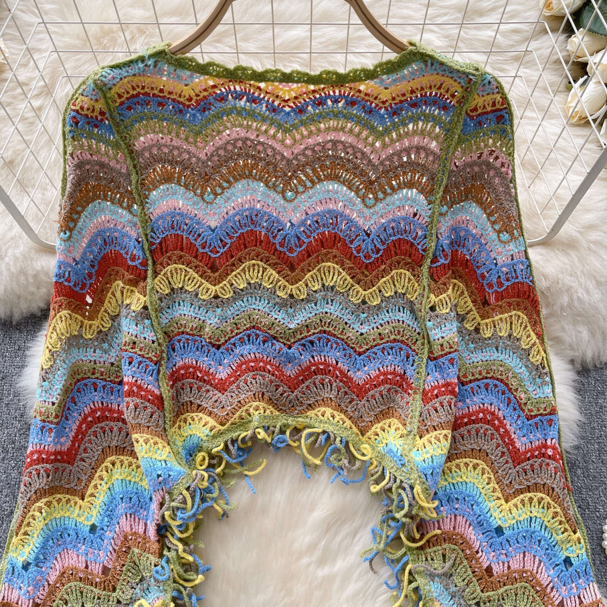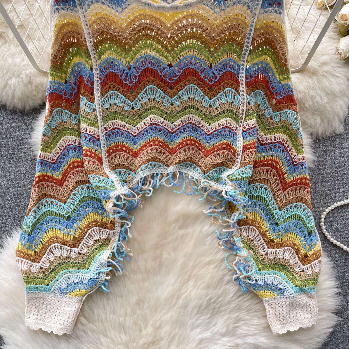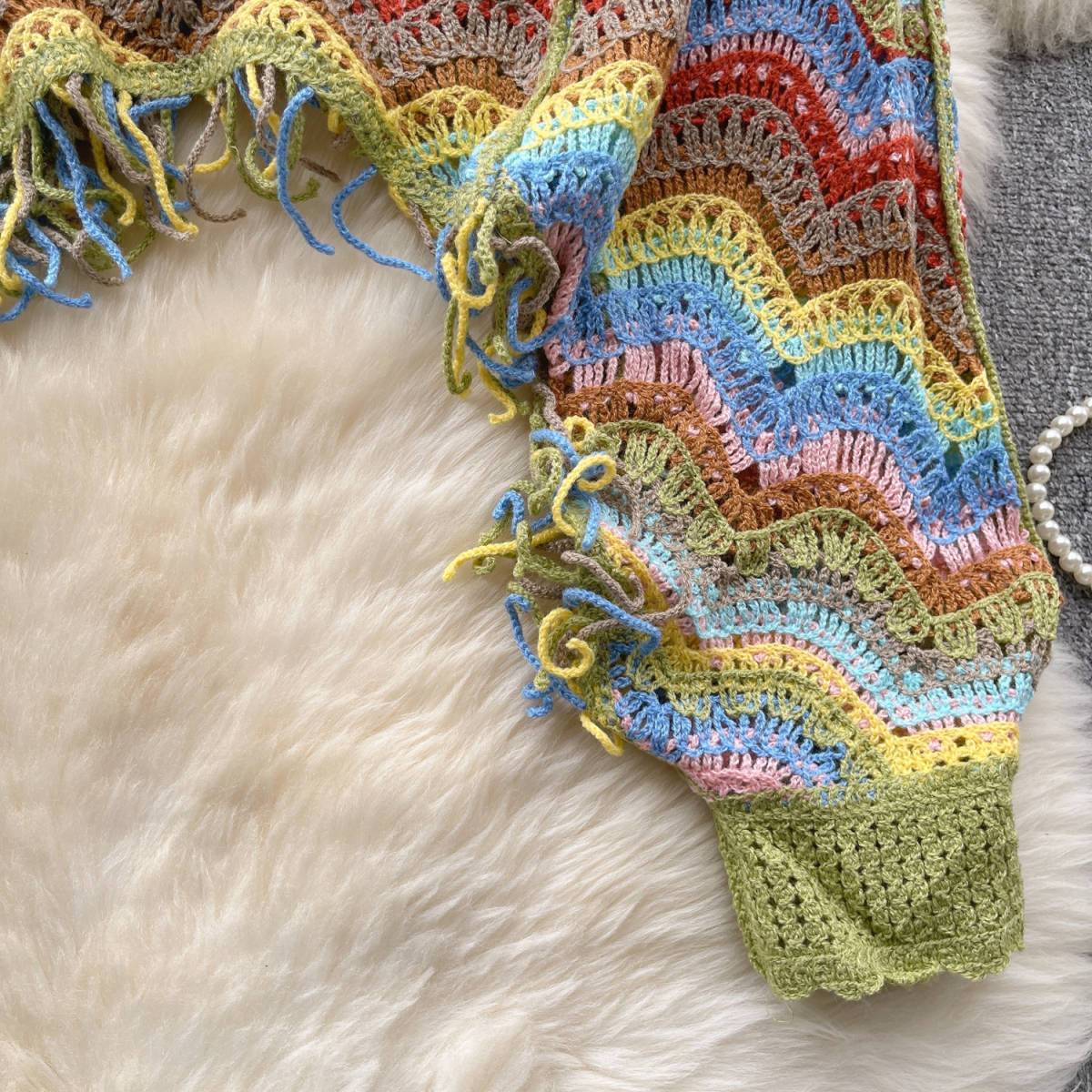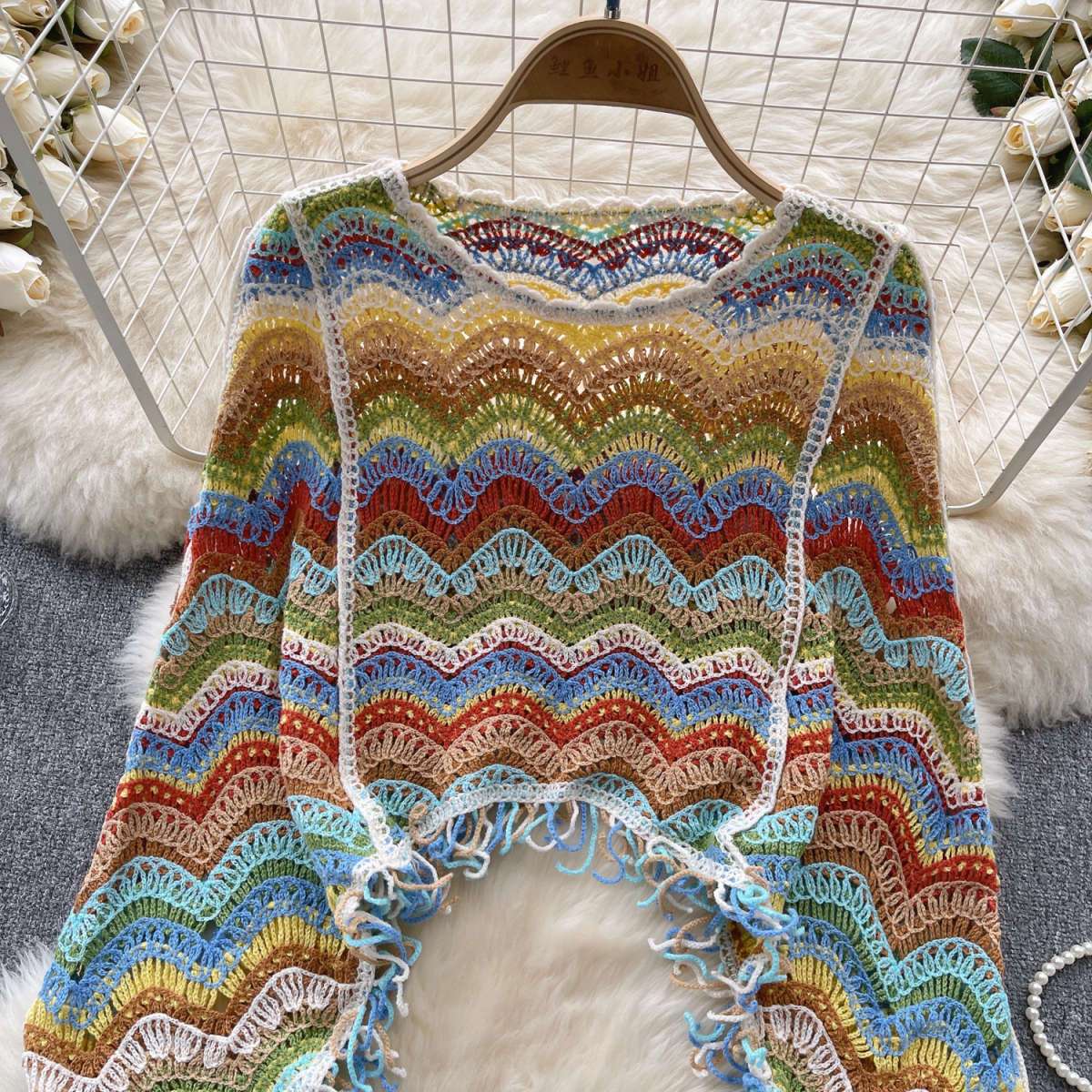 컬러풀한 컷아웃 크로셰 배트 슬리브 크롭 니트 여성 여행 휴가 스타일 긴팔 상의 컷아웃 디자인