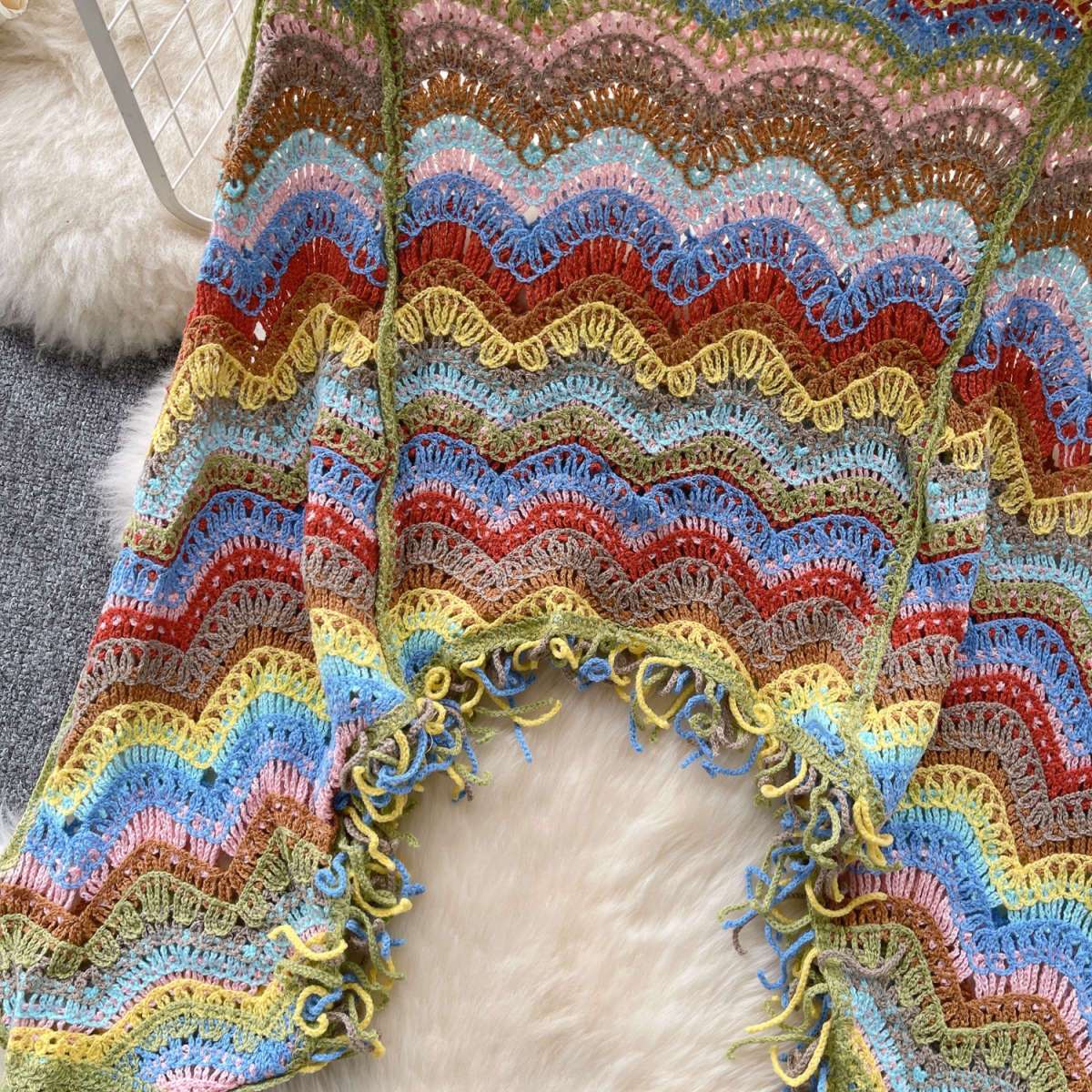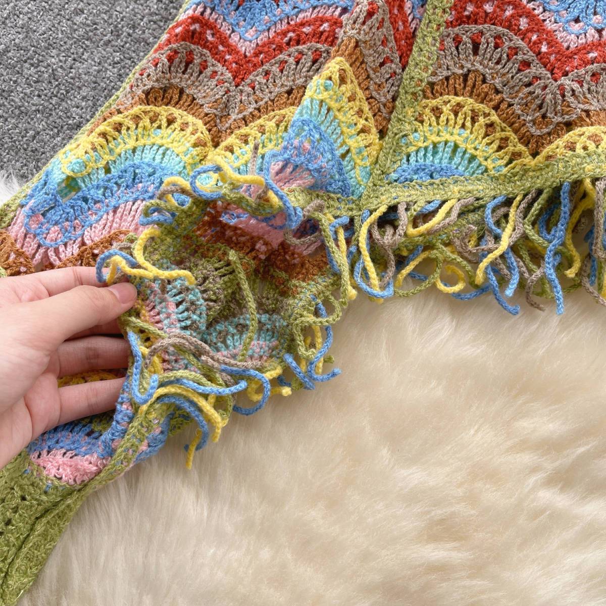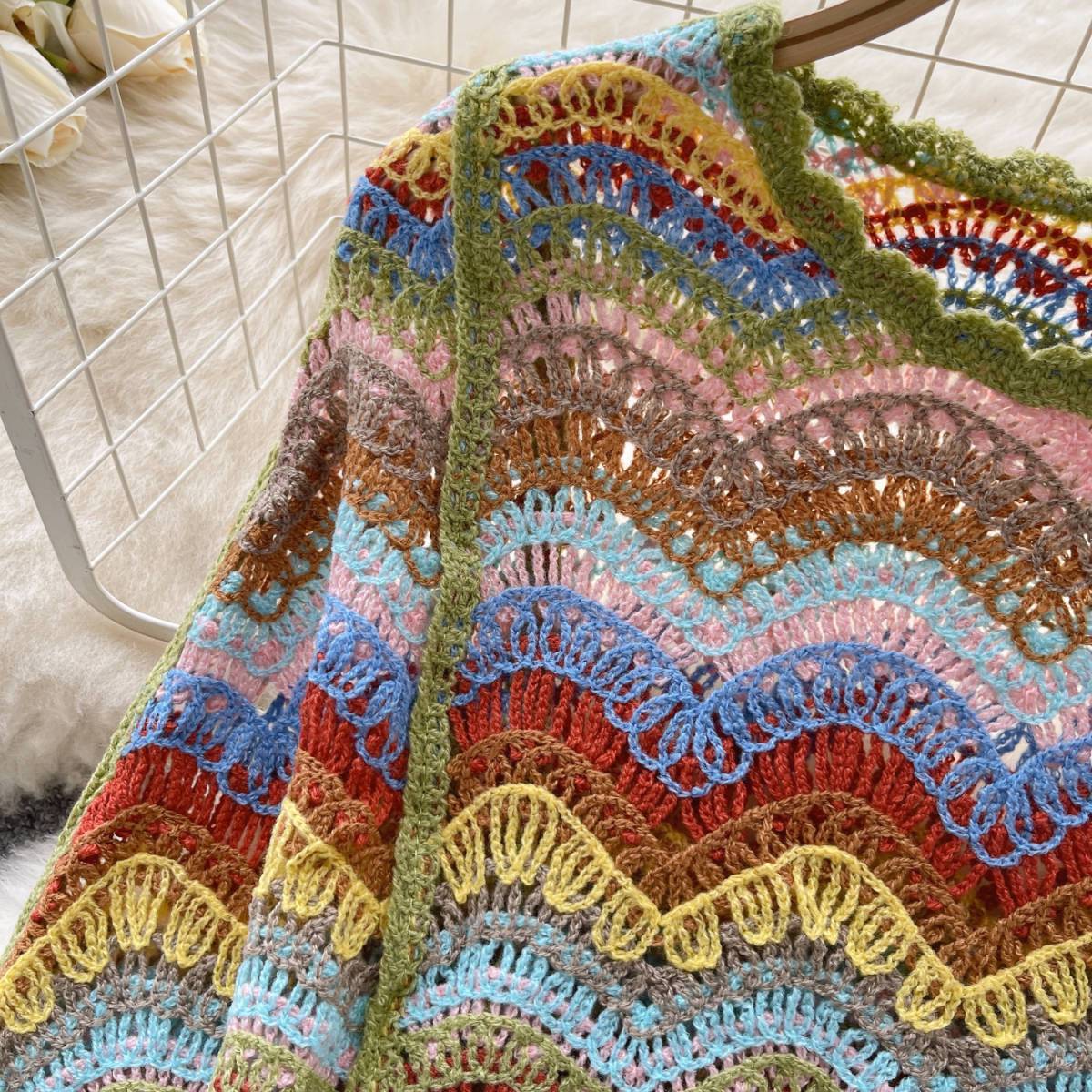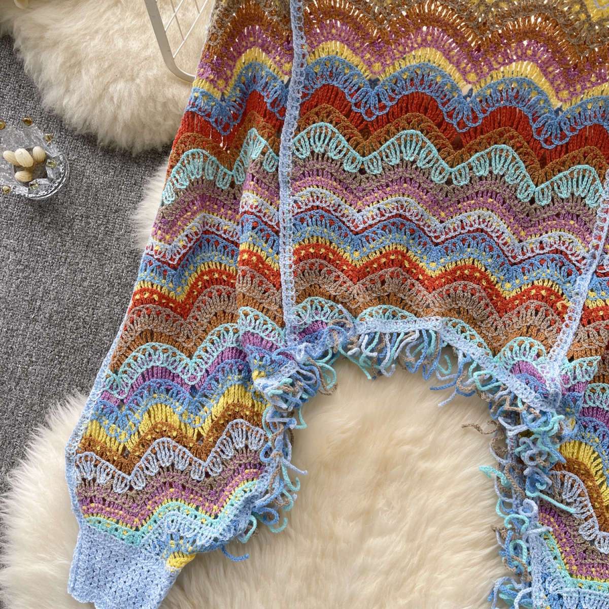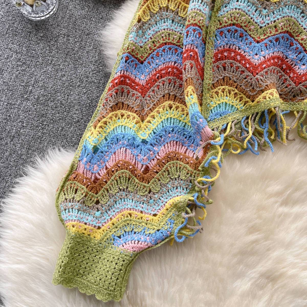 컬러풀한 컷아웃 크로셰 배트 슬리브 크롭 니트 여성 여행 휴가 스타일 긴팔 상의 컷아웃 디자인