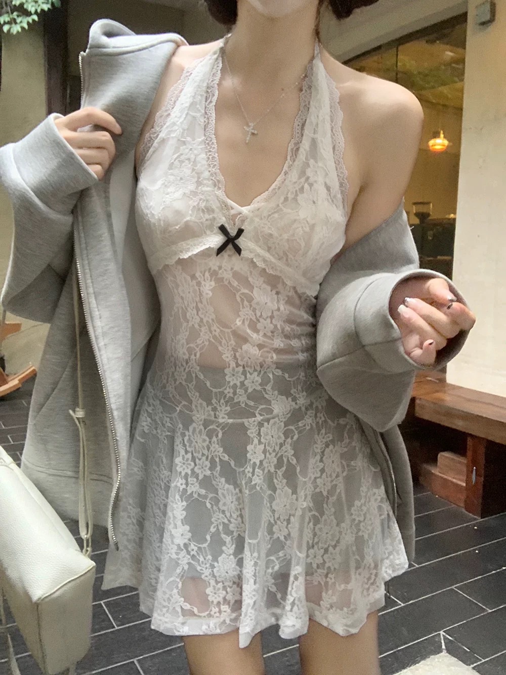새로운 한국 스타일 디자인 가을과 겨울 쌓인 착용 스타일 달콤하고 매운 목 슬리밍 레이스 레이스스토어 가기