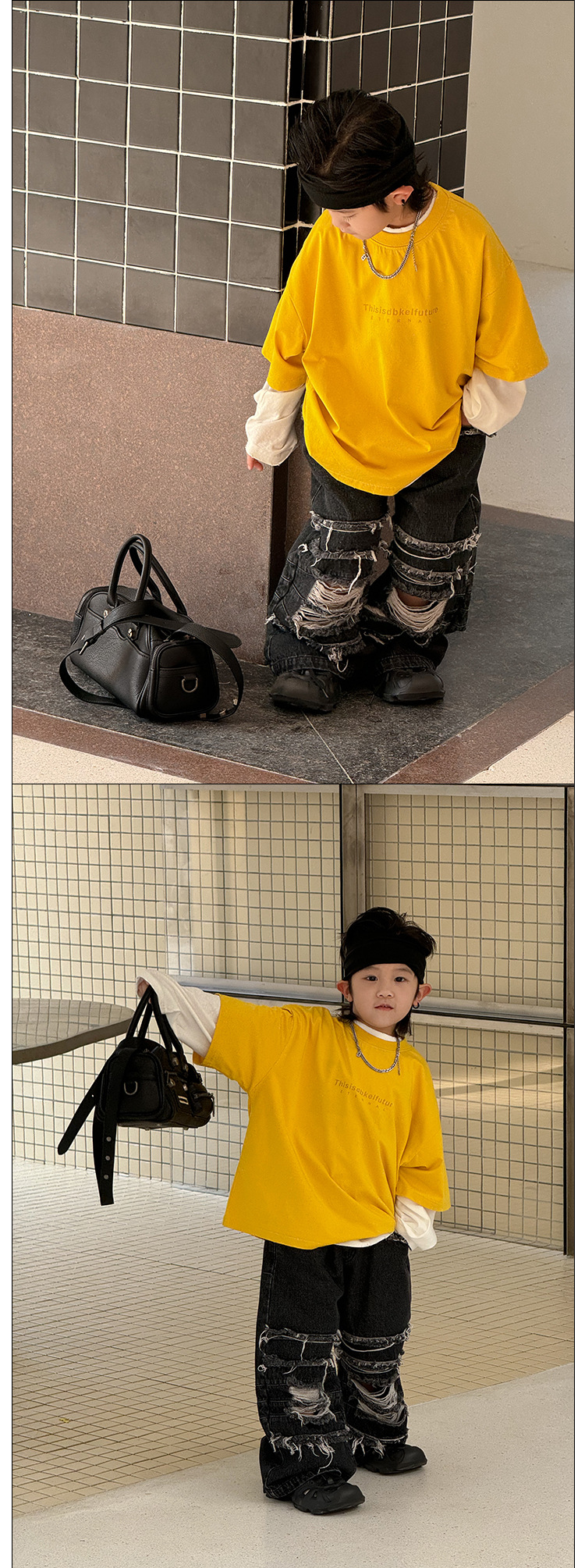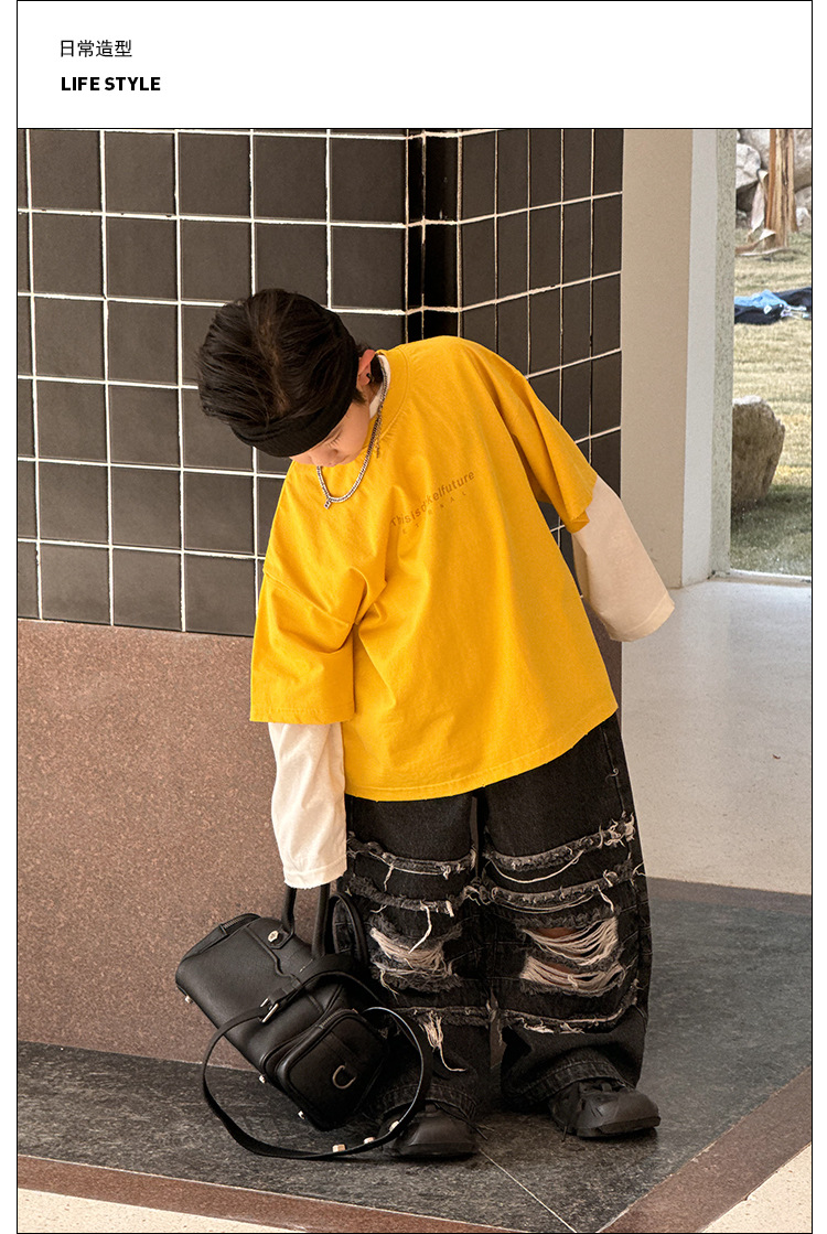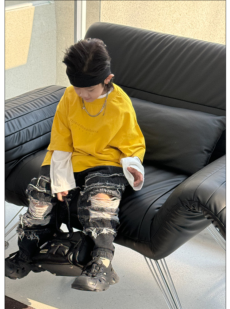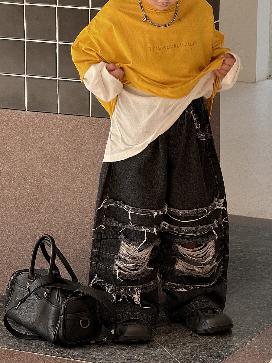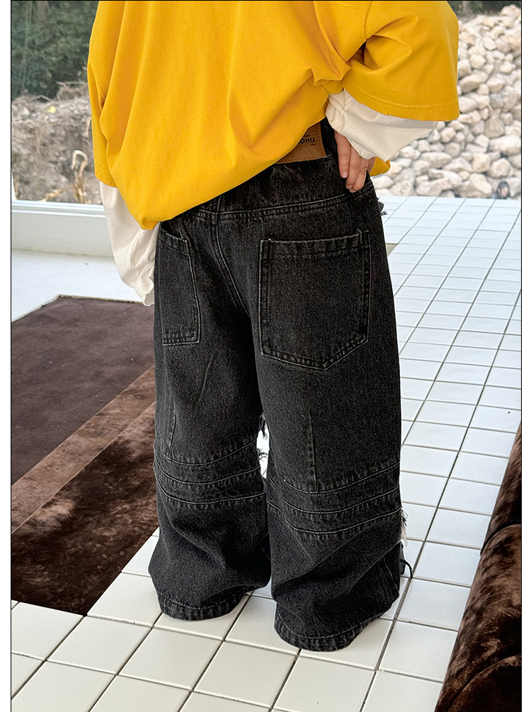 Yihong 의류 아동용 긴 소매 바지 2025 봄, 가을 새로운 스타일 소년 찢어진 청바지 한국 스타일 바지스토어 가기