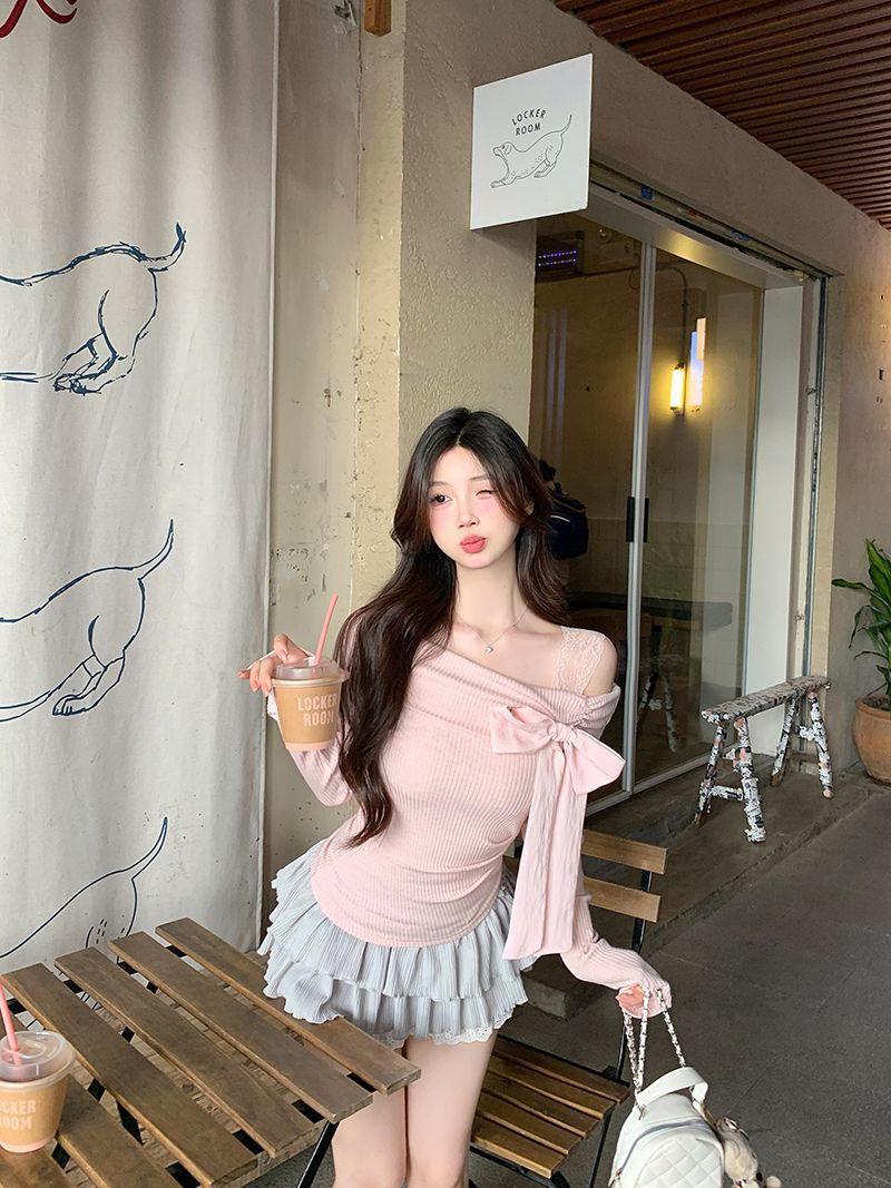 프랑스 스타일의 오프 숄더 보우 레이스 업 긴팔 스웨터 여성의 가을과 겨울 슬림 핏 오프 숄더 이내베이스 셔츠 탑스토어 가기